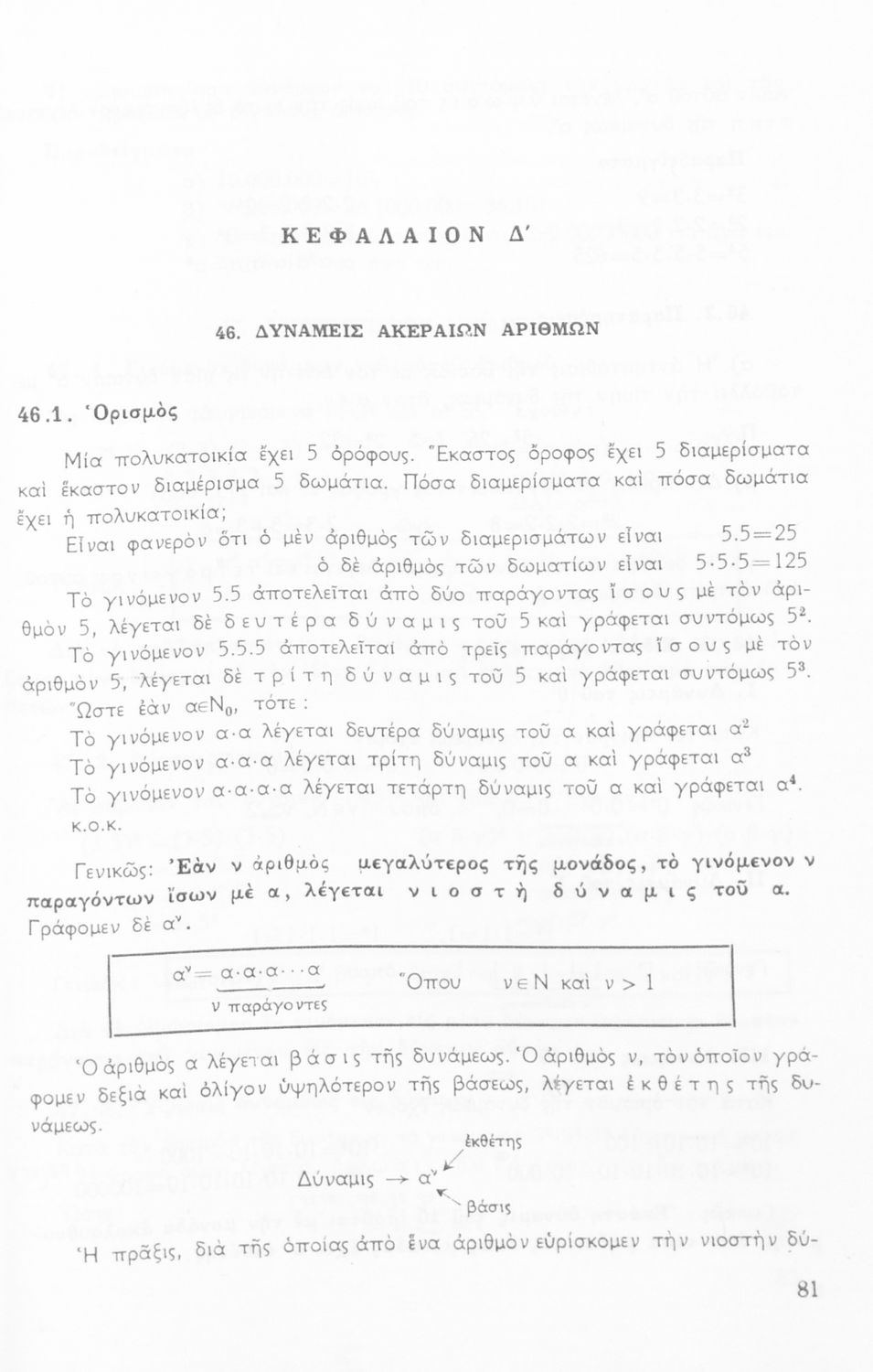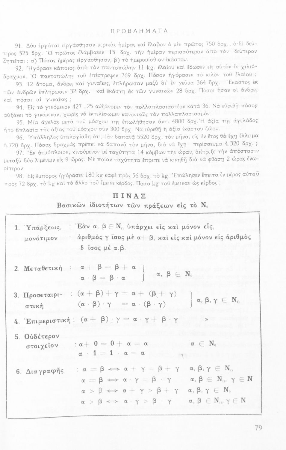 Σχολικό εγχειρίδιο Μαθηματικών Α' Γυμνασίου που περιέχει άλγεβρα με έμφαση στις αριθμητικές πράξεις με ακέραιους, δεκαδικούς και κλάσματα, και γεωμετρία με έμφαση στην επιπεδομετρία. Περιέχει και εισαγωγή στη θεωρία των συνόλων. Φέρει το σύμβολο της δικτατορίας.