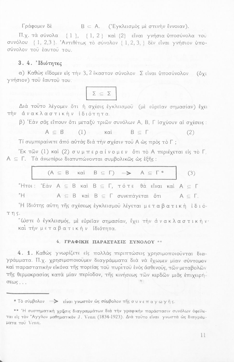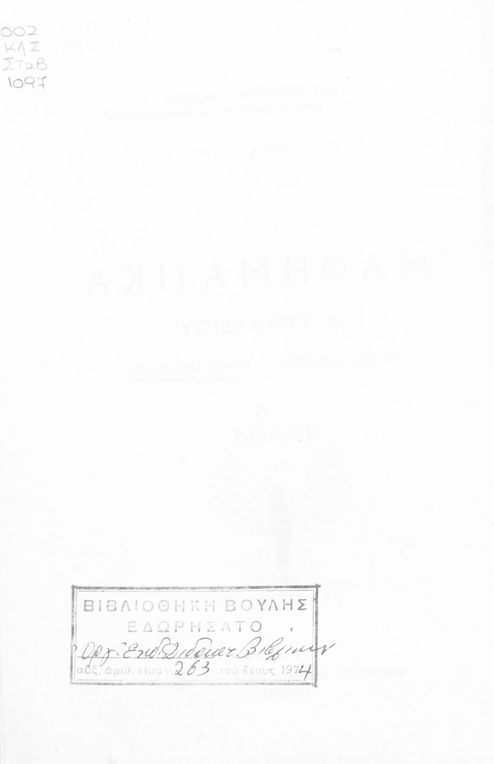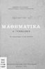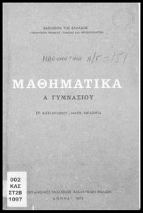 Βαθμίδα εκπαίδευσης: Δευτεροβάθμια Τάξη: Α' Γυμνασίου Μάθημα: Μαθηματικά Γλώσσα: Απλή καθαρεύουσα Παρουσίαση περιεχομένου: Σχολικό εγχειρίδιο Μαθηματικών Α' Γυμνασίου που περιέχει άλγεβρα με έμφαση στις αριθμητικές πράξεις με ακέραιους, δεκαδικούς και κλάσματα, και γεωμετρία με έμφαση στην επιπεδομετρία. Περιέχει και εισαγωγή στη θεωρία των συνόλων. Φέρει το σύμβολο της δικτατορίας. |