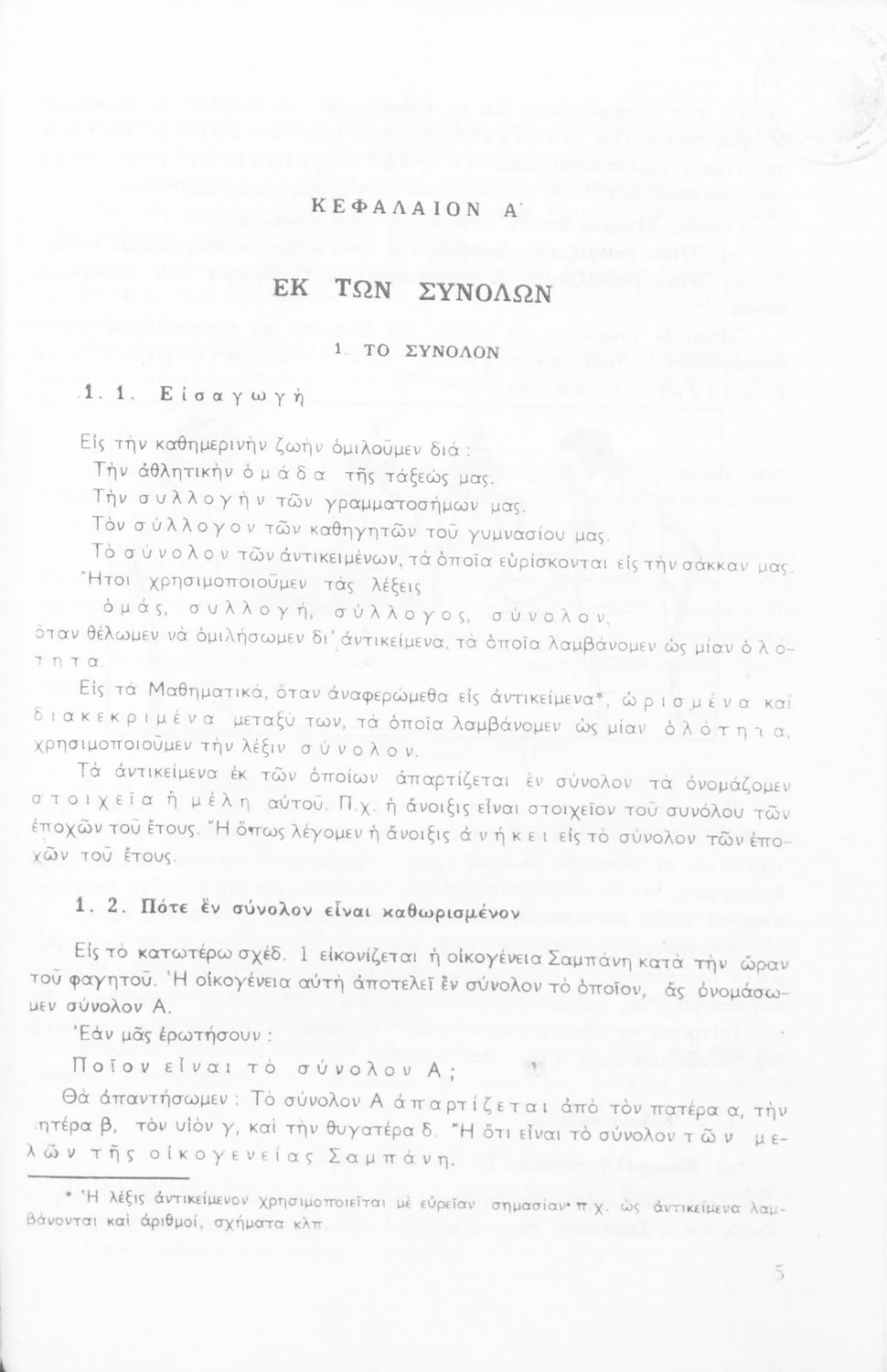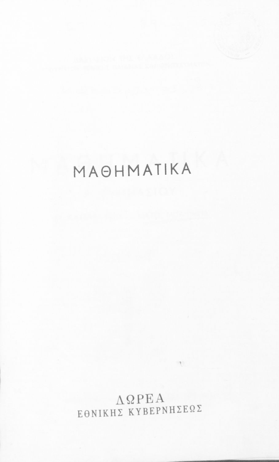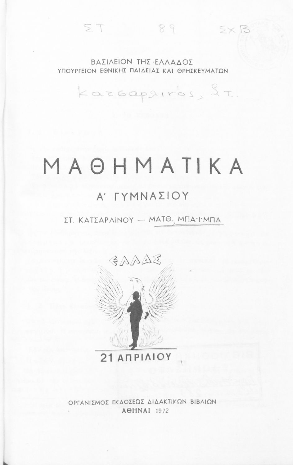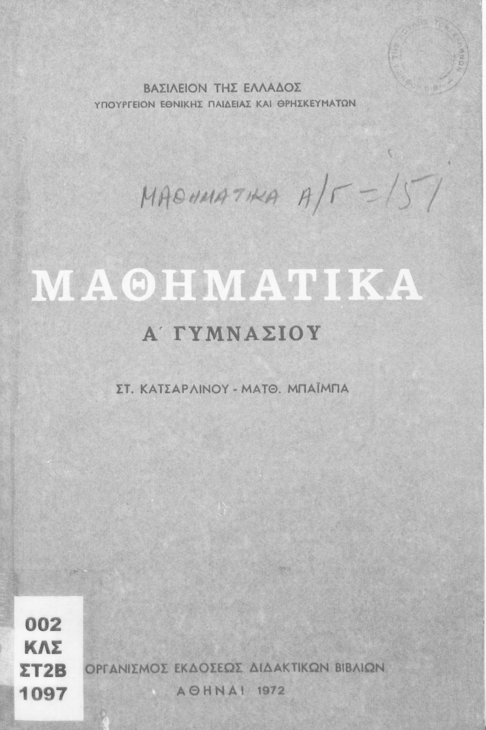 Σχολικό εγχειρίδιο Μαθηματικών Α' Γυμνασίου που περιέχει άλγεβρα με έμφαση στις αριθμητικές πράξεις με ακέραιους, δεκαδικούς και κλάσματα, και γεωμετρία με έμφαση στην επιπεδομετρία. Περιέχει και εισαγωγή στη θεωρία των συνόλων. Φέρει το σύμβολο της δικτατορίας.