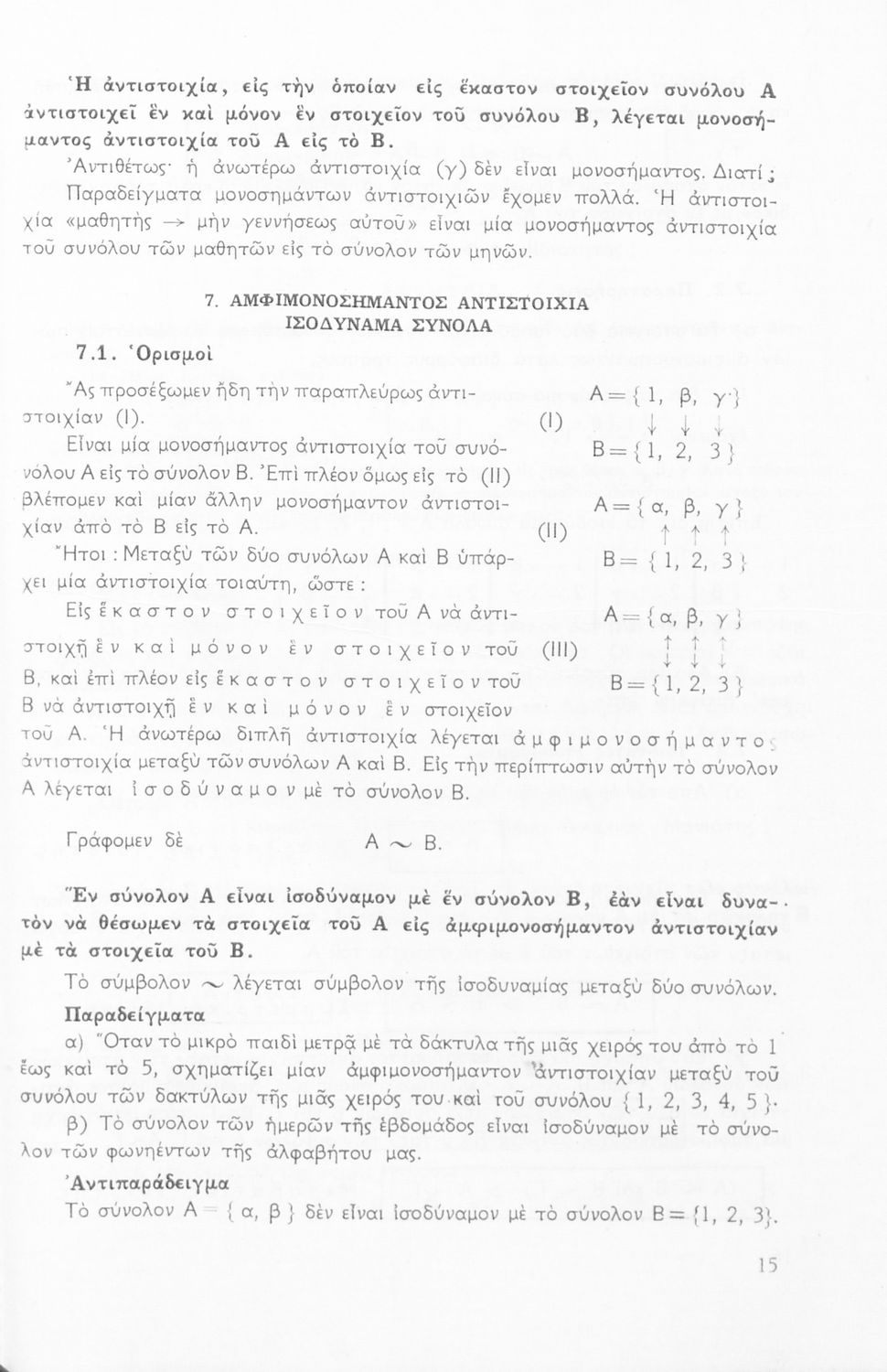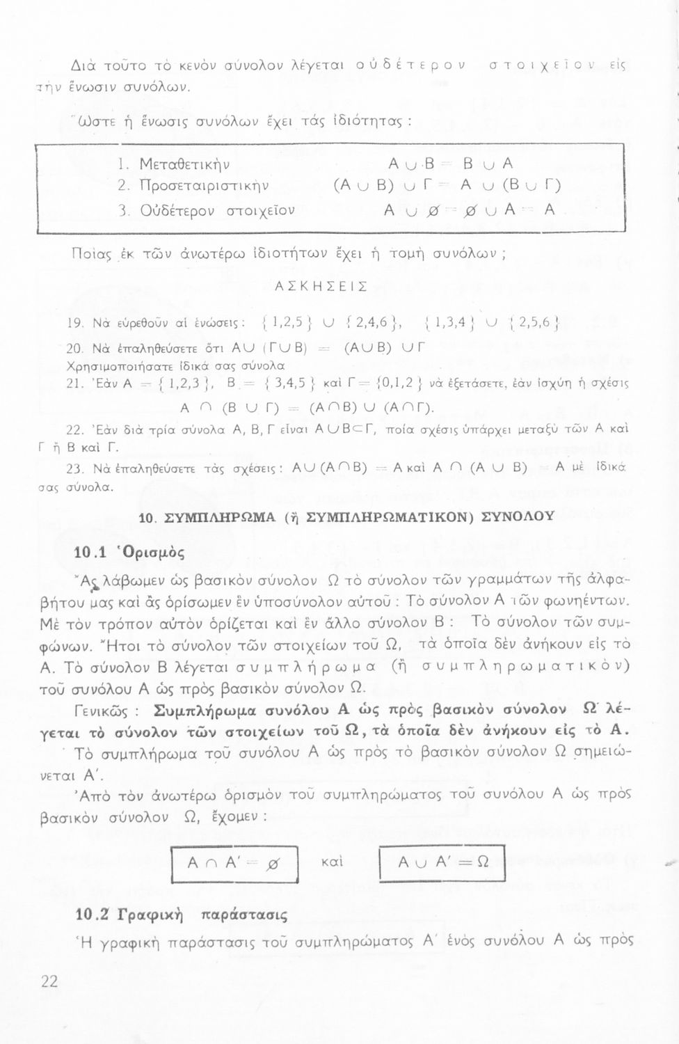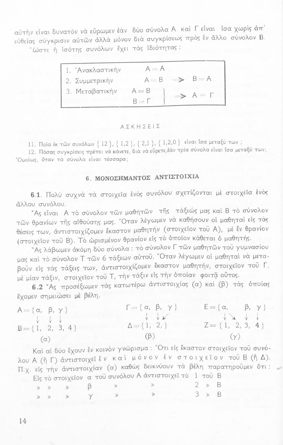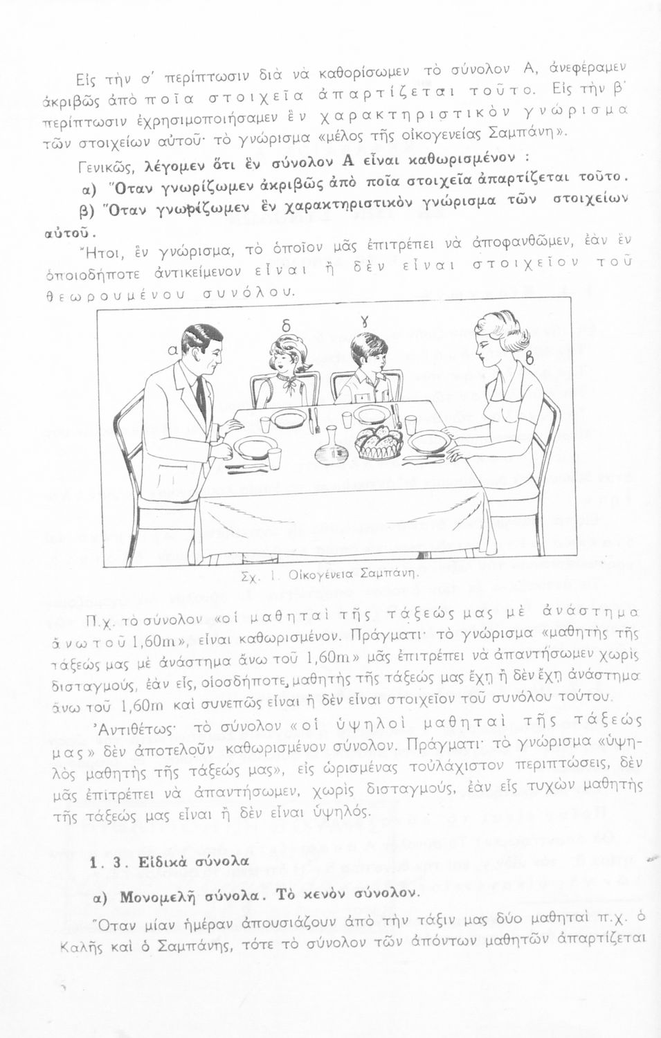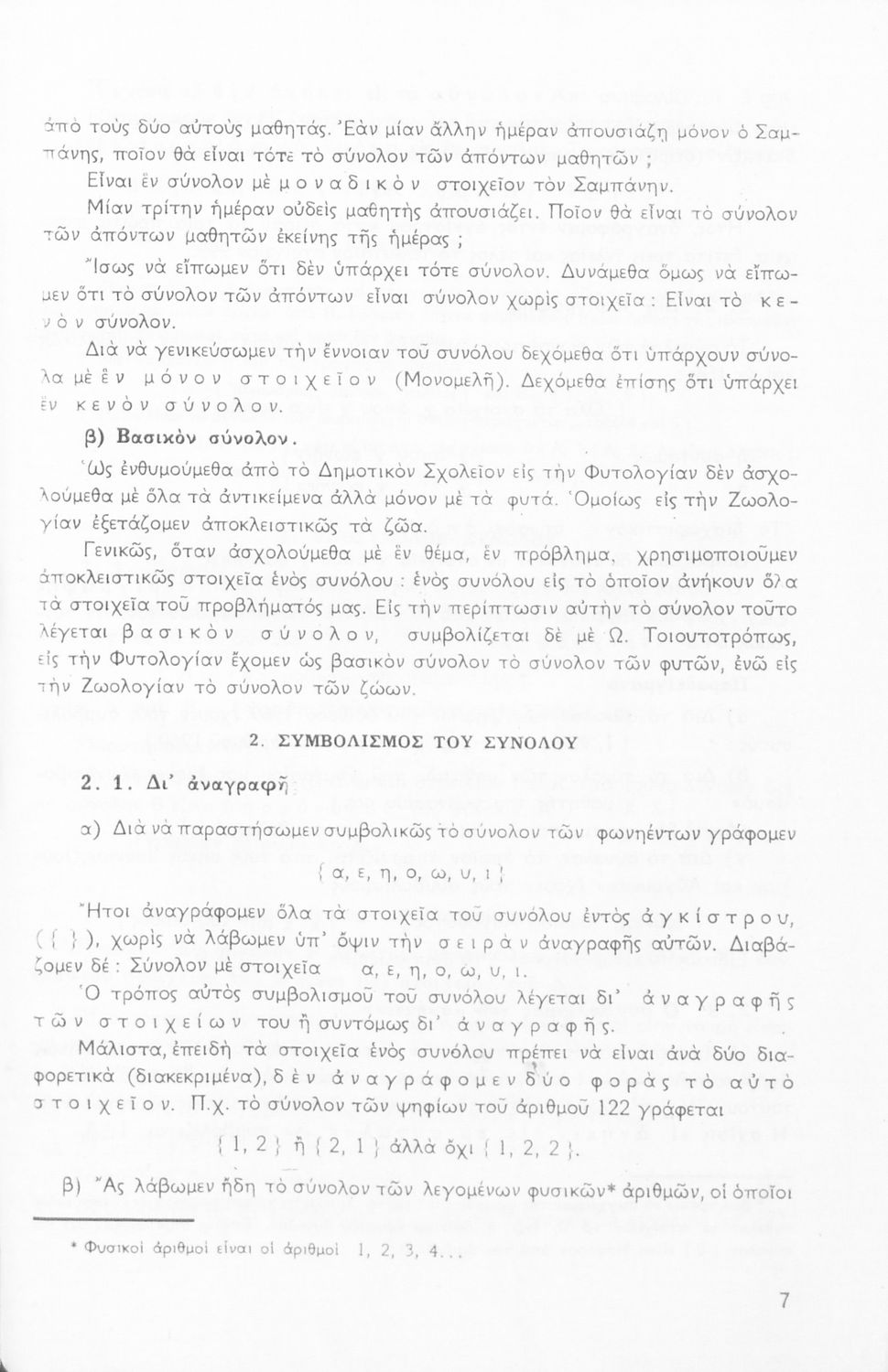 Σχολικό εγχειρίδιο Μαθηματικών Α' Γυμνασίου που περιέχει άλγεβρα με έμφαση στις αριθμητικές πράξεις με ακέραιους, δεκαδικούς και κλάσματα, και γεωμετρία με έμφαση στην επιπεδομετρία. Περιέχει και εισαγωγή στη θεωρία των συνόλων. Φέρει το σύμβολο της δικτατορίας.