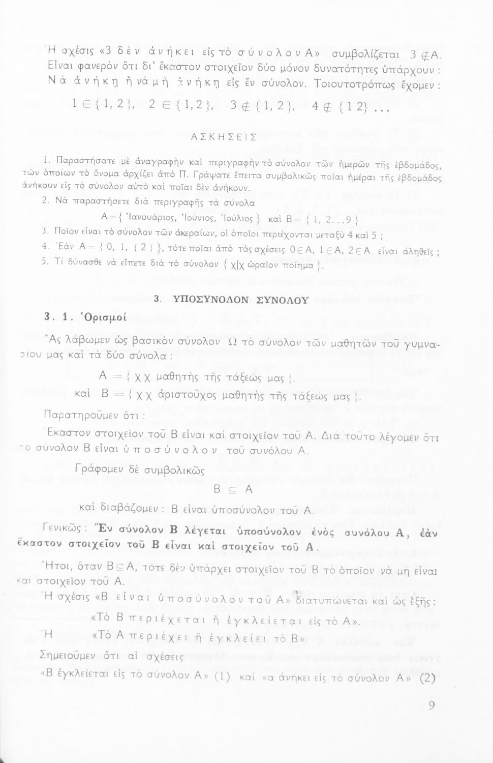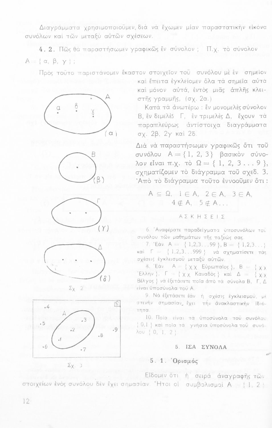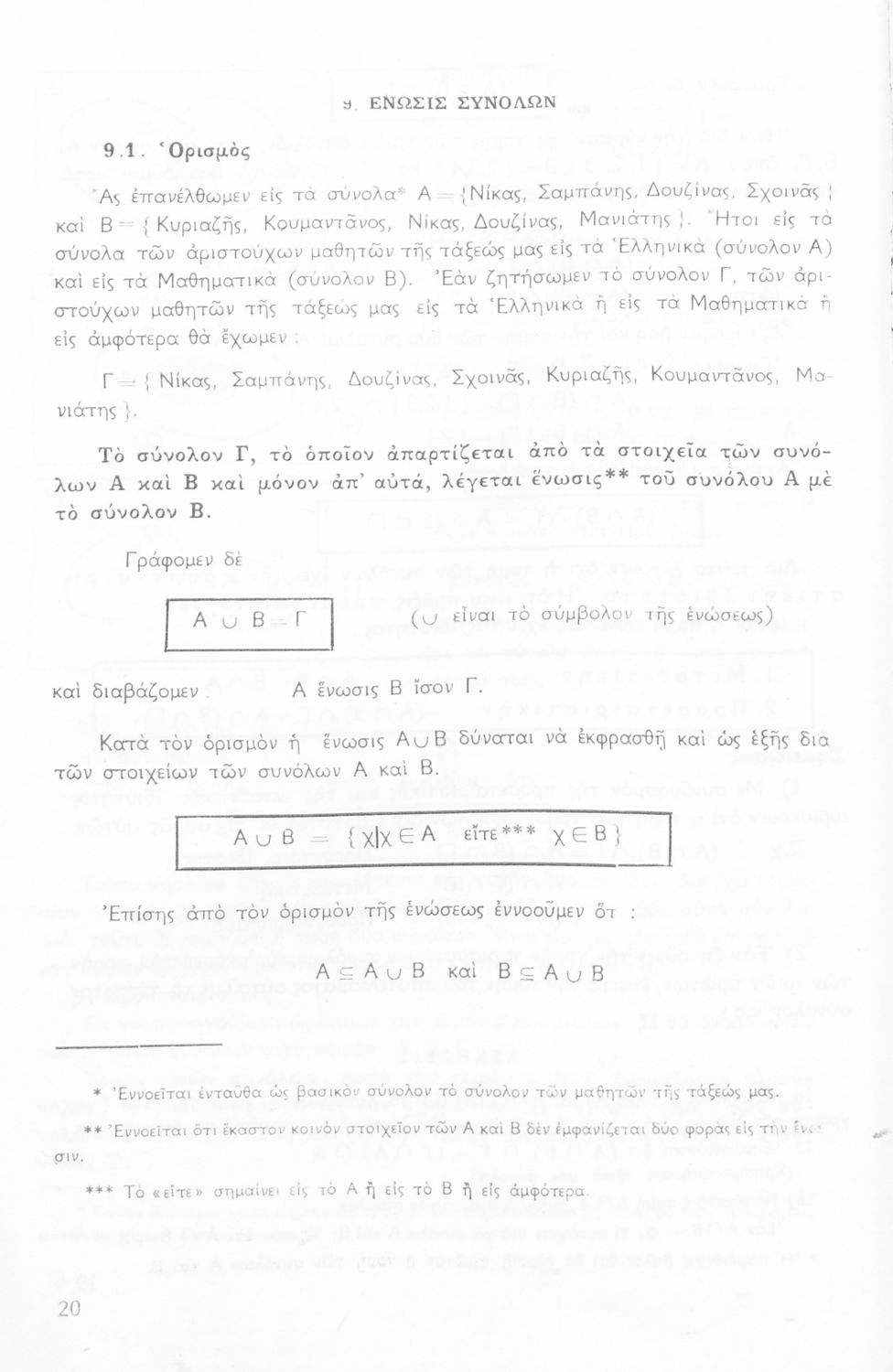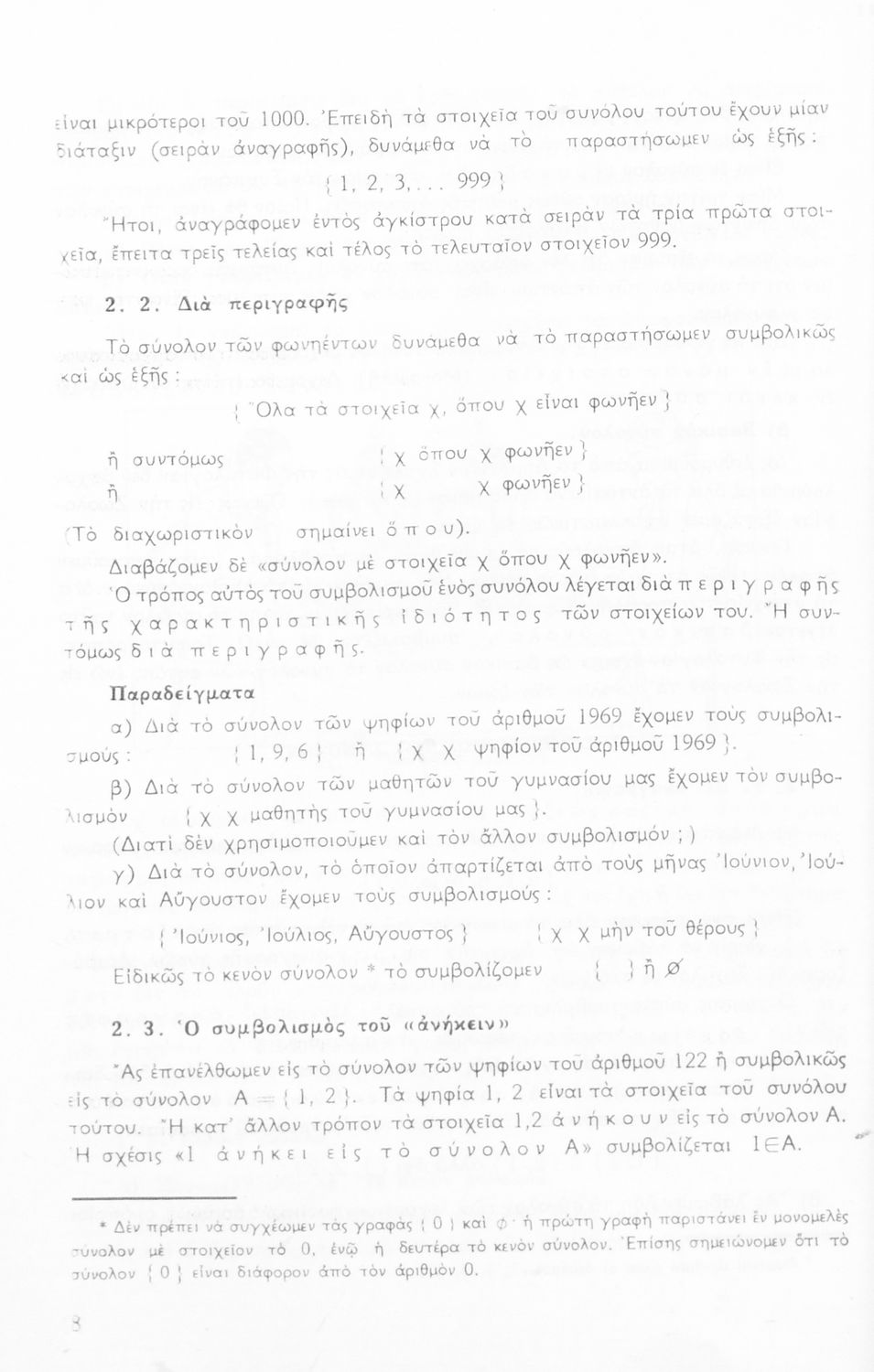 Σχολικό εγχειρίδιο Μαθηματικών Α' Γυμνασίου που περιέχει άλγεβρα με έμφαση στις αριθμητικές πράξεις με ακέραιους, δεκαδικούς και κλάσματα, και γεωμετρία με έμφαση στην επιπεδομετρία. Περιέχει και εισαγωγή στη θεωρία των συνόλων. Φέρει το σύμβολο της δικτατορίας.
