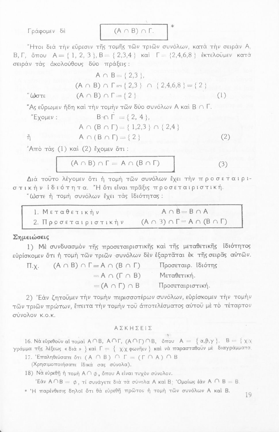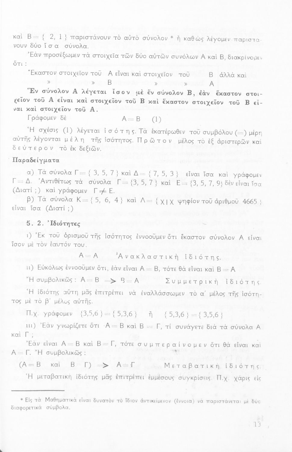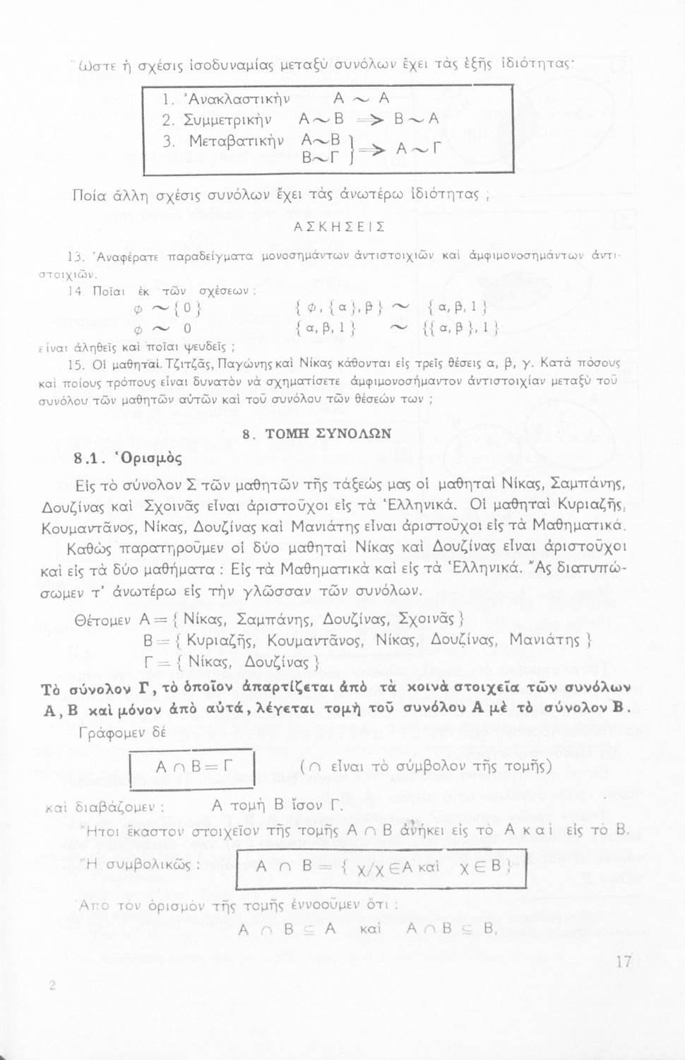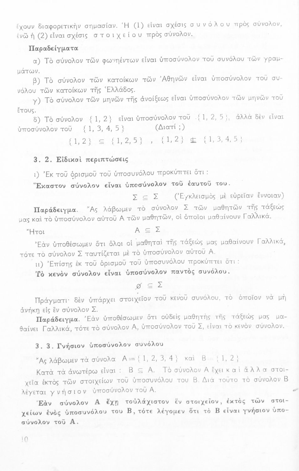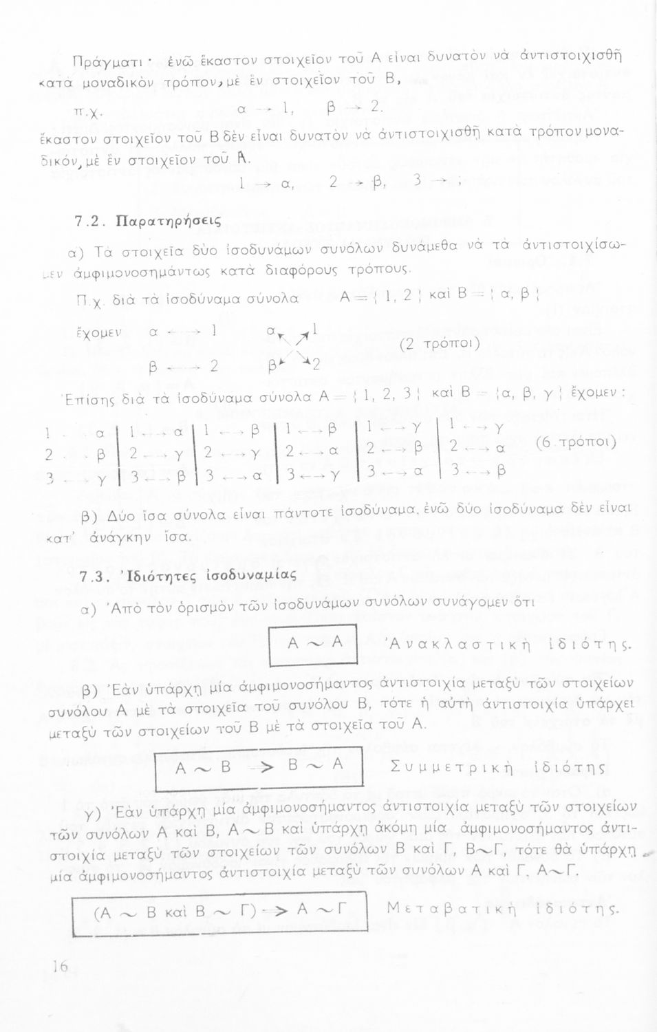 Σχολικό εγχειρίδιο Μαθηματικών Α' Γυμνασίου που περιέχει άλγεβρα με έμφαση στις αριθμητικές πράξεις με ακέραιους, δεκαδικούς και κλάσματα, και γεωμετρία με έμφαση στην επιπεδομετρία. Περιέχει και εισαγωγή στη θεωρία των συνόλων. Φέρει το σύμβολο της δικτατορίας.