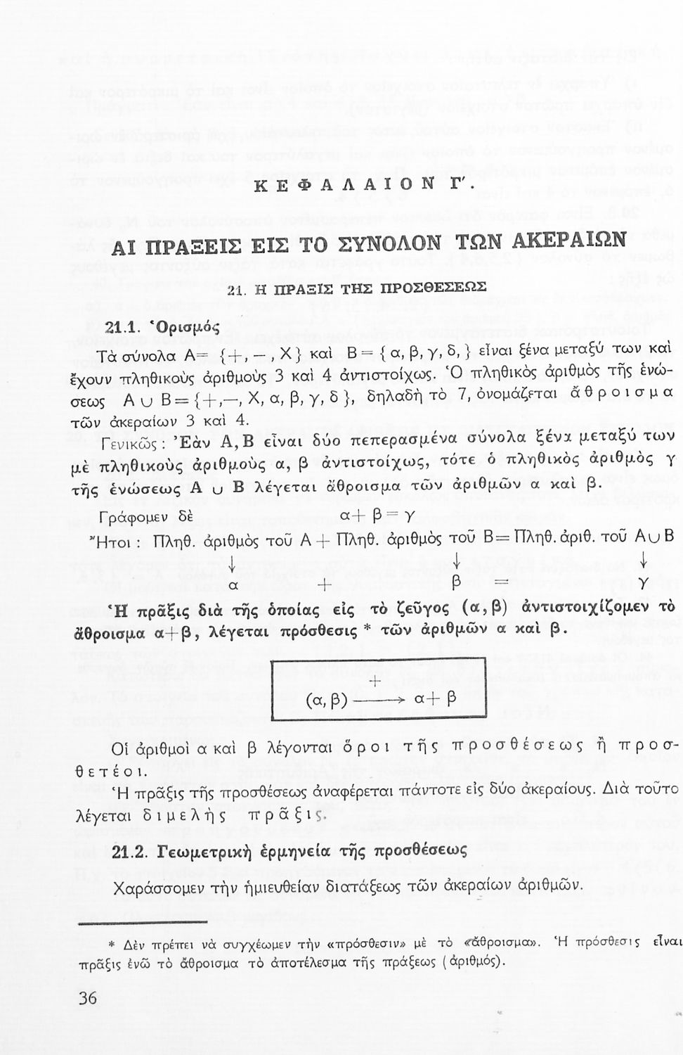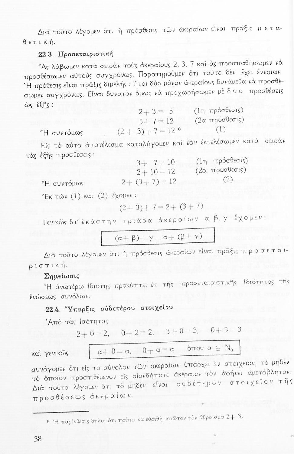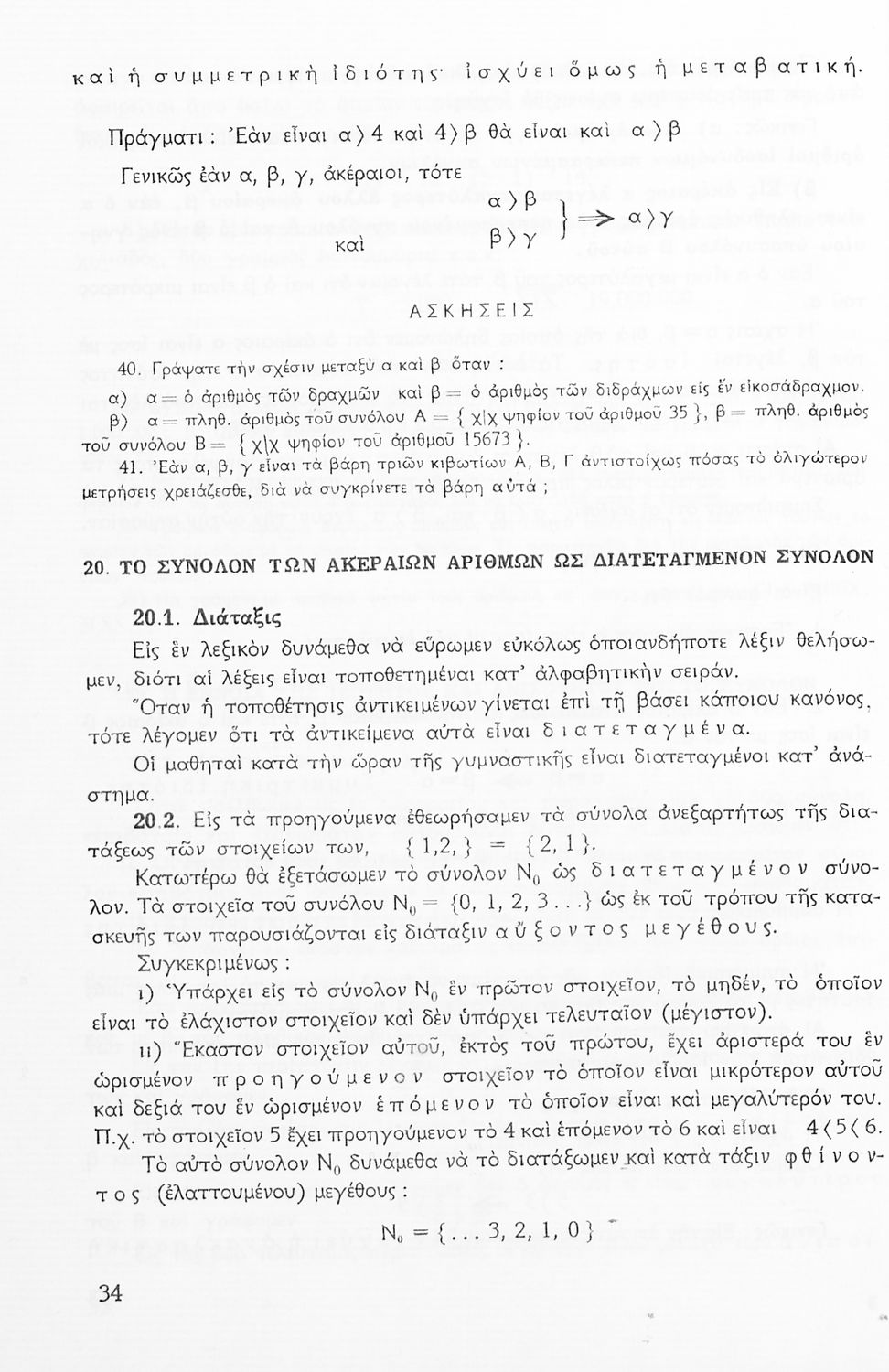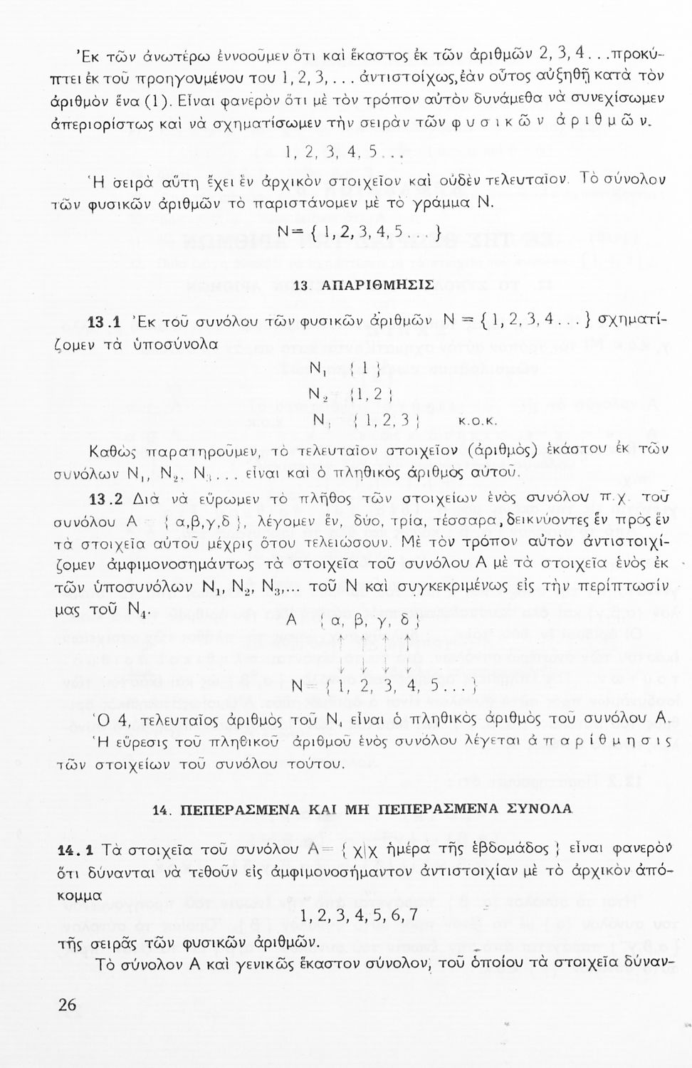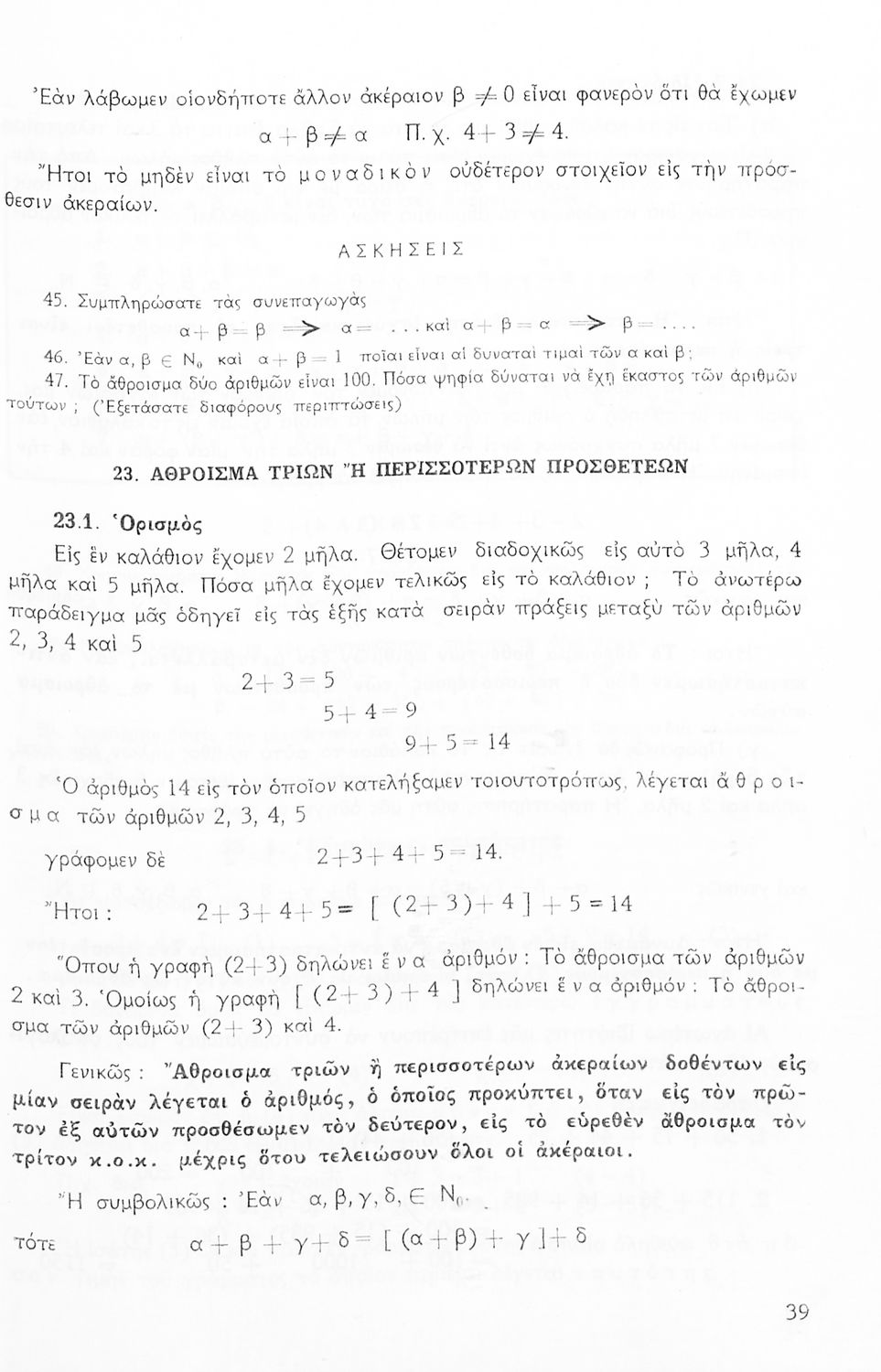 Σχολικό εγχειρίδιο Μαθηματικών Α' Γυμνασίου που περιέχει άλγεβρα με έμφαση στις αριθμητικές πράξεις με ακέραιους, δεκαδικούς και κλάσματα, και γεωμετρία με έμφαση στην επιπεδομετρία. Περιέχει και εισαγωγή στη θεωρία των συνόλων.