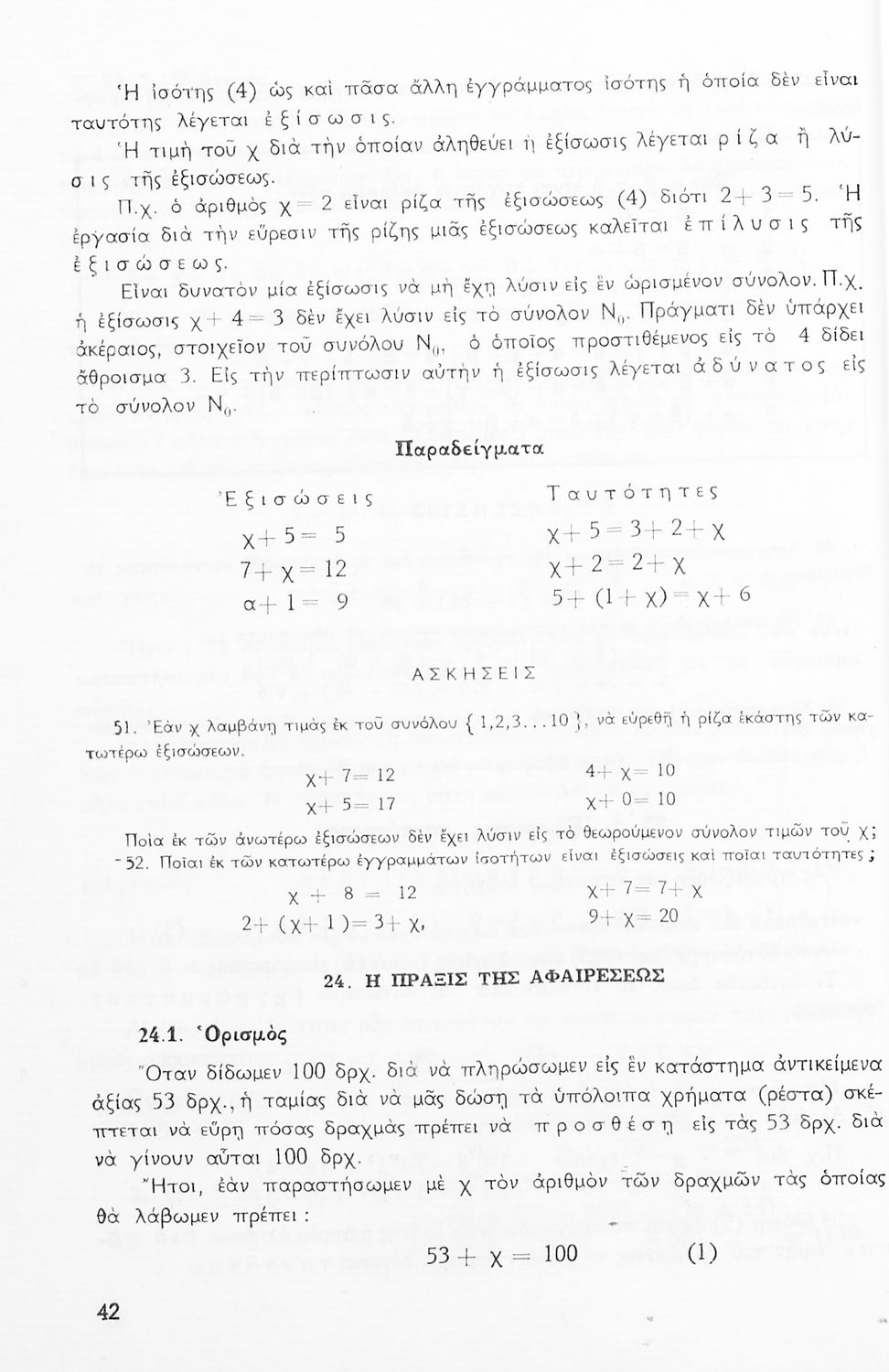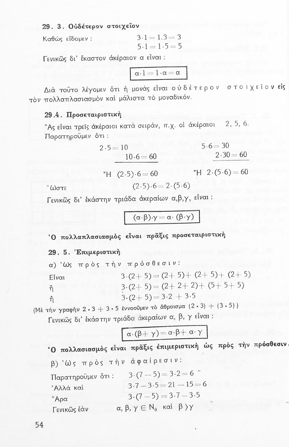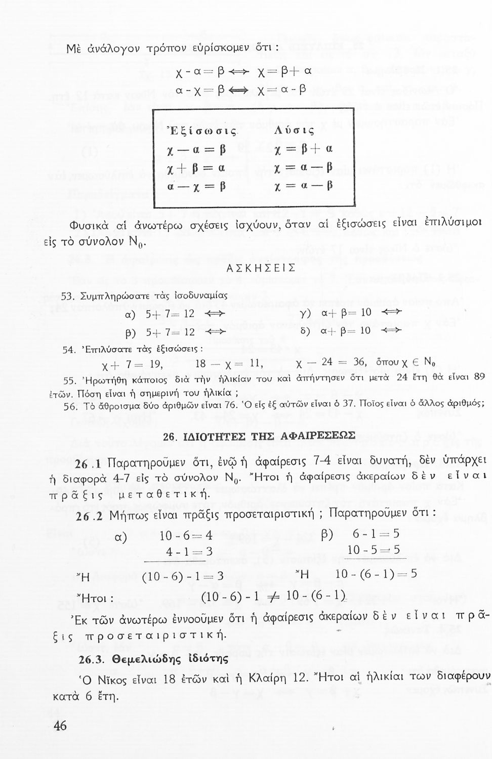 Σχολικό εγχειρίδιο Μαθηματικών Α' Γυμνασίου που περιέχει άλγεβρα με έμφαση στις αριθμητικές πράξεις με ακέραιους, δεκαδικούς και κλάσματα, και γεωμετρία με έμφαση στην επιπεδομετρία. Περιέχει και εισαγωγή στη θεωρία των συνόλων.
