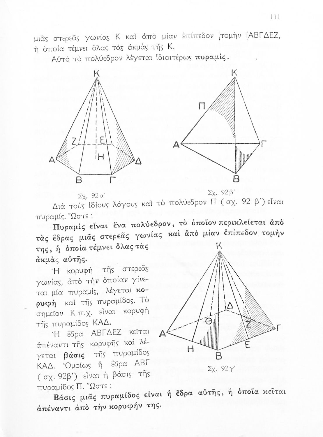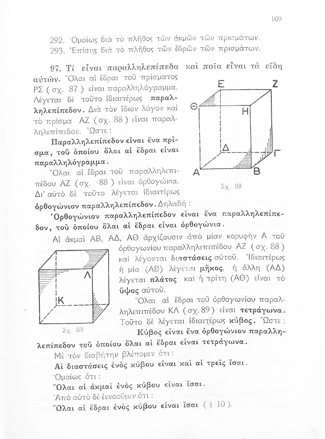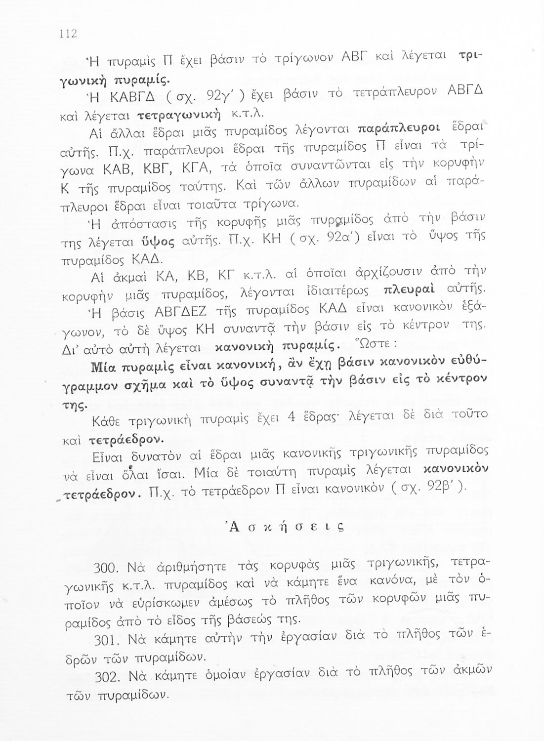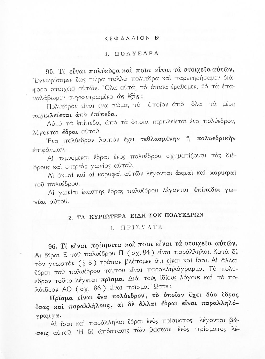Σχολικό εγχειρίδιο των κατωτέρων τάξεων του Γυμνασίου για το μάθημα της Γεωμετρίας. Το εγχειρίδιο αποτελείται από την εισαγωγή, όπου αναλύονται οι βασικές έννοιες των ιδιοτήτων και γνωρισμάτων των γεωμετρικών σχημάτων, της επιπεδομετρίας δηλαδή των ευθειών, των γωνιών, των παραλλήλων, των κύκλων, των ευθύγραμμων σχημάτων και της στερεομετρίας, της θεματικής εκείνης που αναλύει τις θέσεις της ευθείας, του κυλίνδρου, του κώνου, των πολυέδρων κ.α.