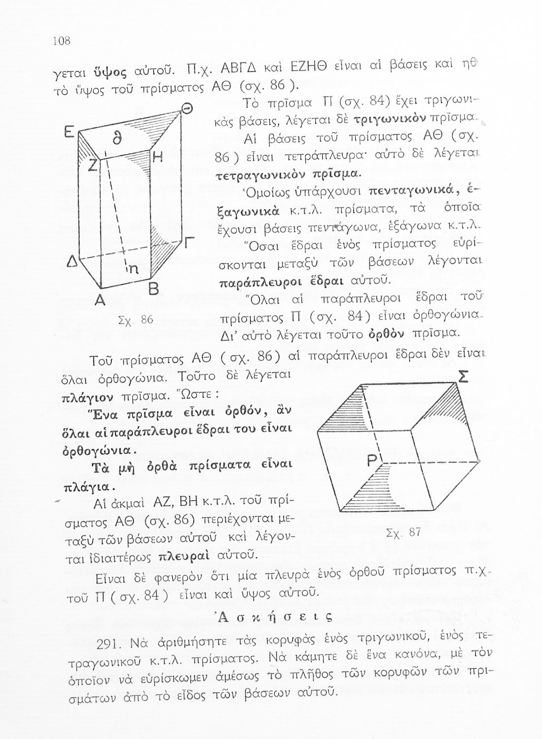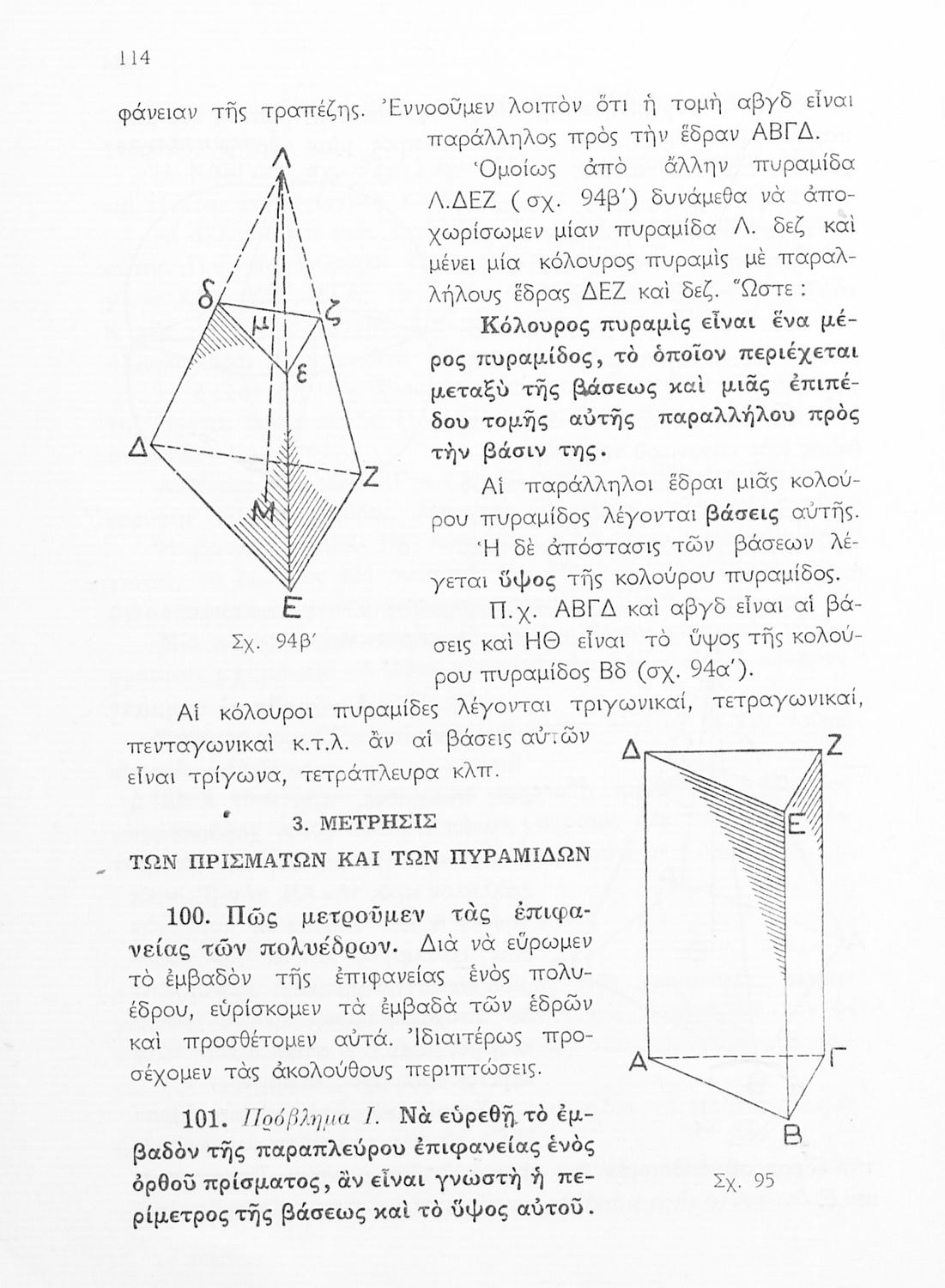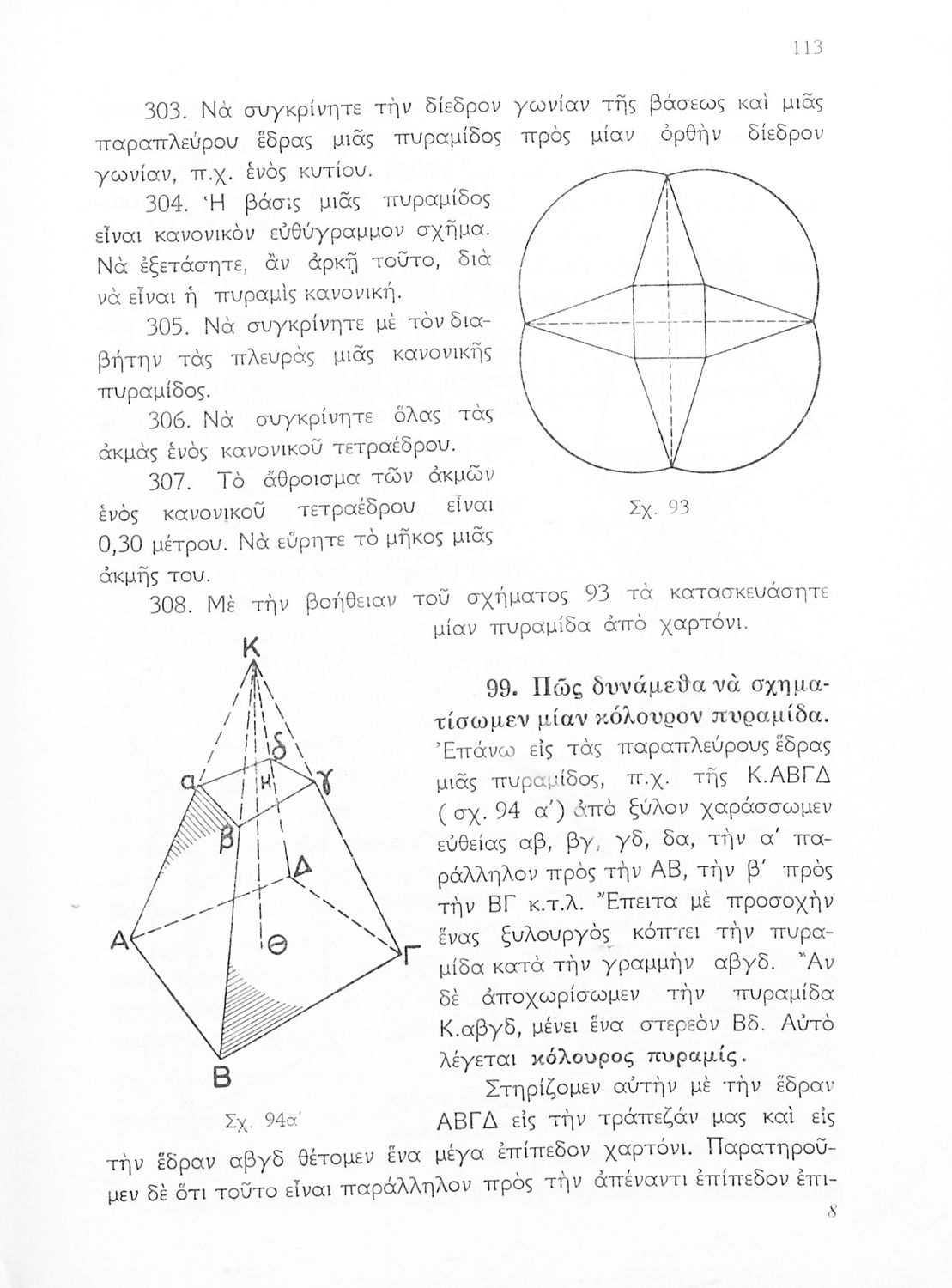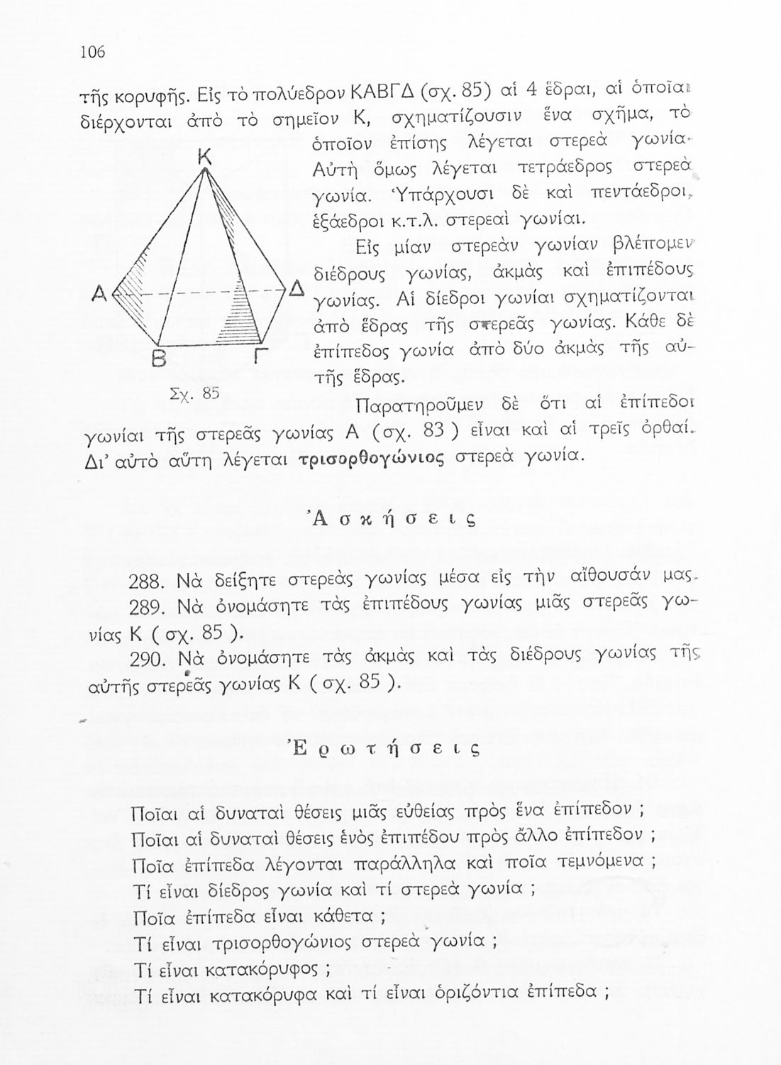 Σχολικό εγχειρίδιο των κατωτέρων τάξεων του Γυμνασίου για το μάθημα της Γεωμετρίας. Το εγχειρίδιο αποτελείται από την εισαγωγή, όπου αναλύονται οι βασικές έννοιες των ιδιοτήτων και γνωρισμάτων των γεωμετρικών σχημάτων, της επιπεδομετρίας δηλαδή των ευθειών, των γωνιών, των παραλλήλων, των κύκλων, των ευθύγραμμων σχημάτων και της στερεομετρίας, της θεματικής εκείνης που αναλύει τις θέσεις της ευθείας, του κυλίνδρου, του κώνου, των πολυέδρων κ.α.