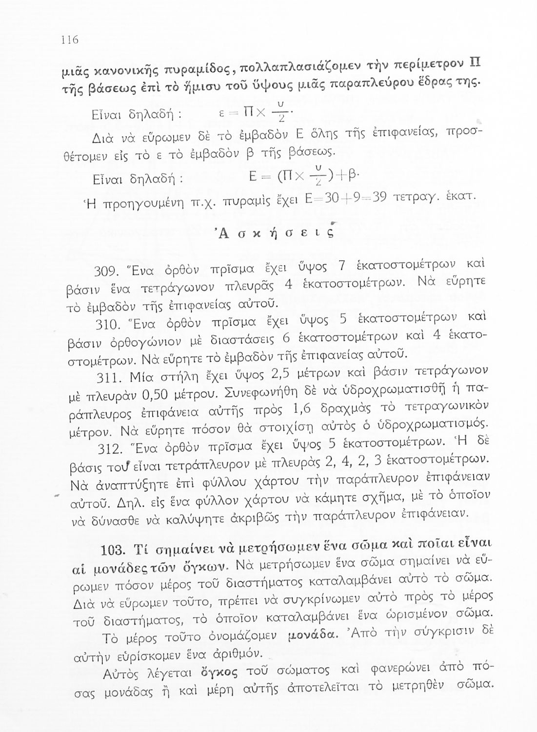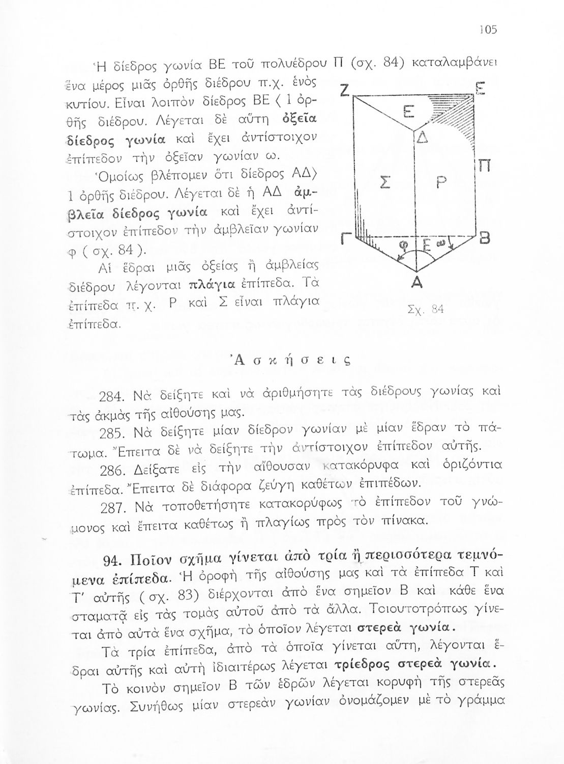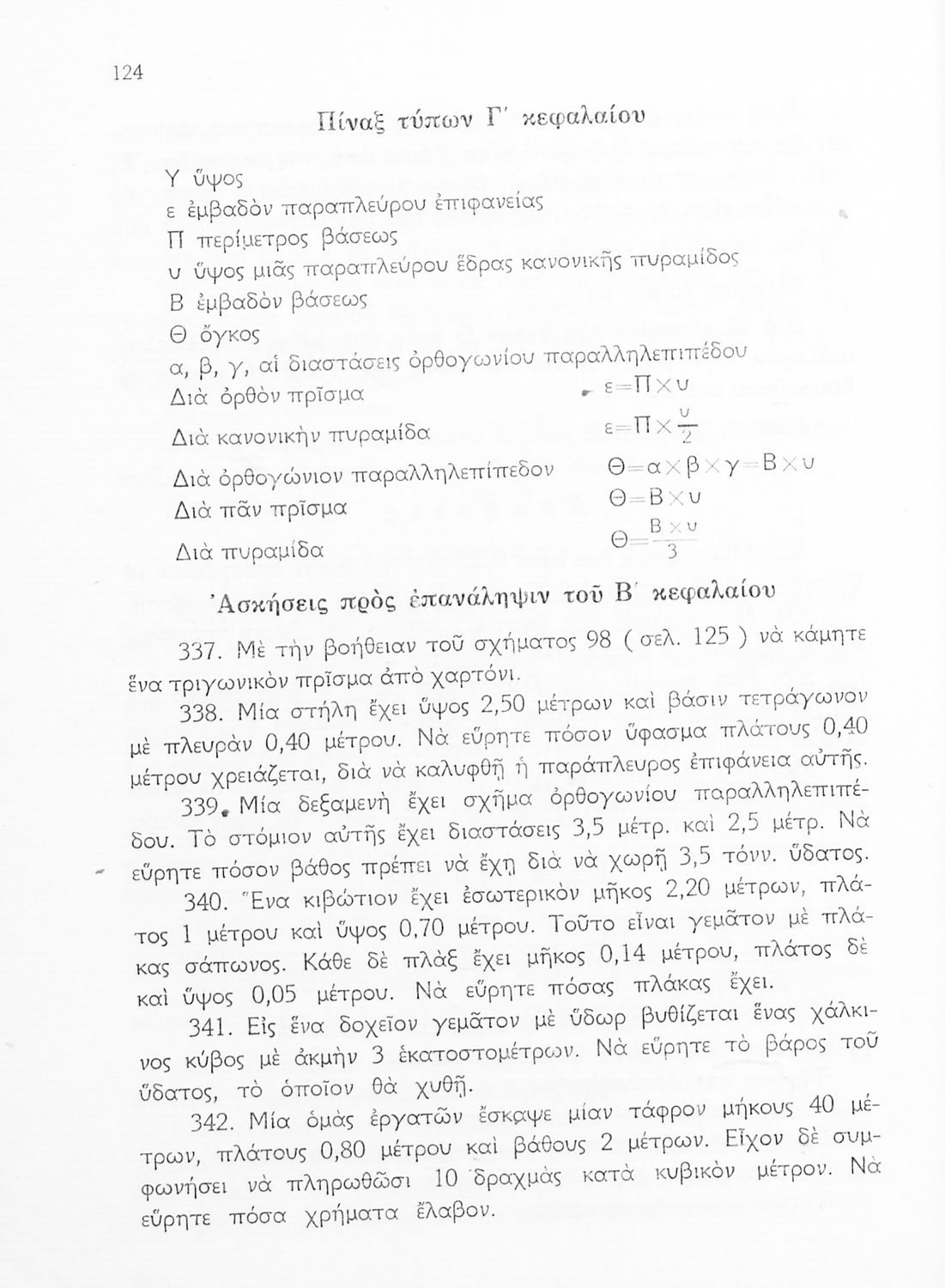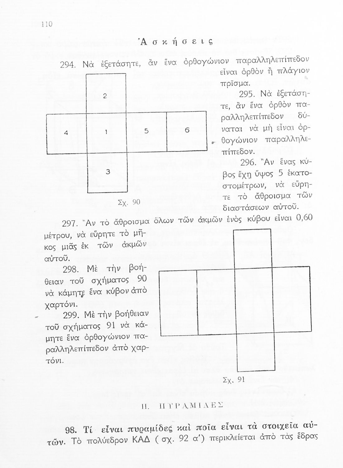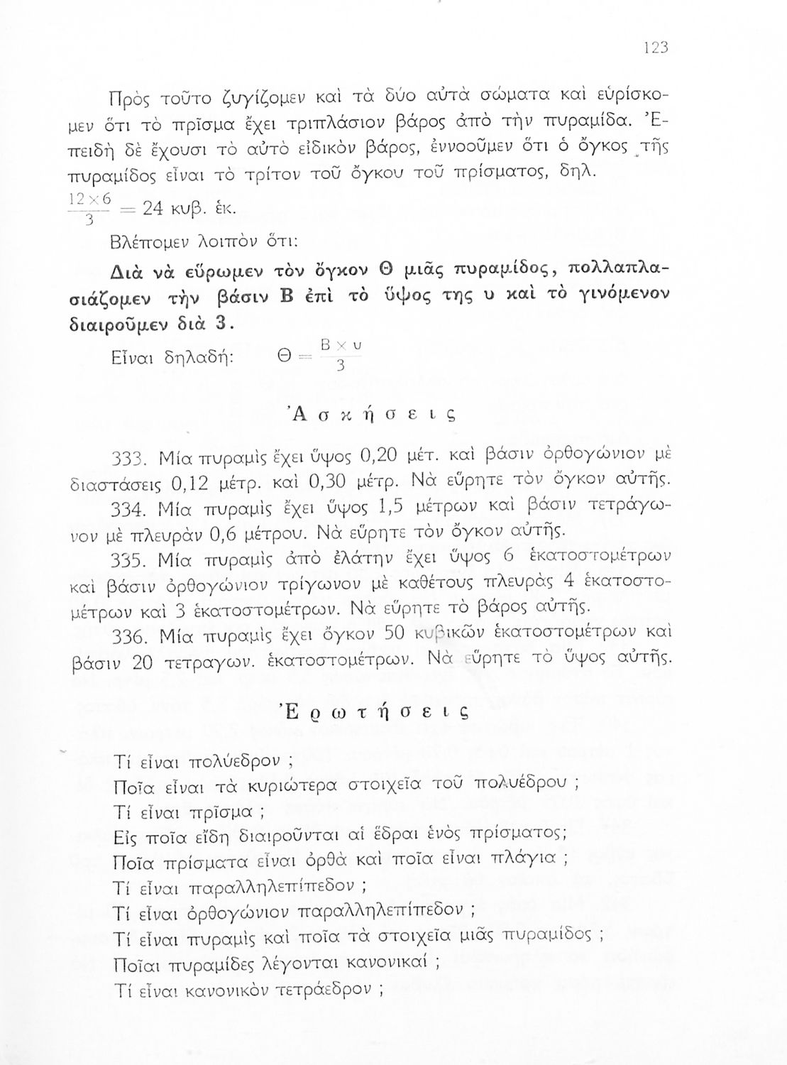 Σχολικό εγχειρίδιο των κατωτέρων τάξεων του Γυμνασίου για το μάθημα της Γεωμετρίας. Το εγχειρίδιο αποτελείται από την εισαγωγή, όπου αναλύονται οι βασικές έννοιες των ιδιοτήτων και γνωρισμάτων των γεωμετρικών σχημάτων, της επιπεδομετρίας δηλαδή των ευθειών, των γωνιών, των παραλλήλων, των κύκλων, των ευθύγραμμων σχημάτων και της στερεομετρίας, της θεματικής εκείνης που αναλύει τις θέσεις της ευθείας, του κυλίνδρου, του κώνου, των πολυέδρων κ.α.