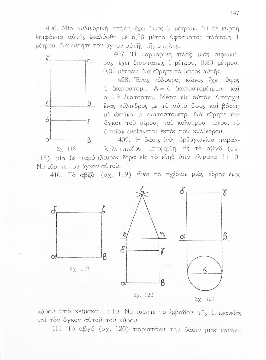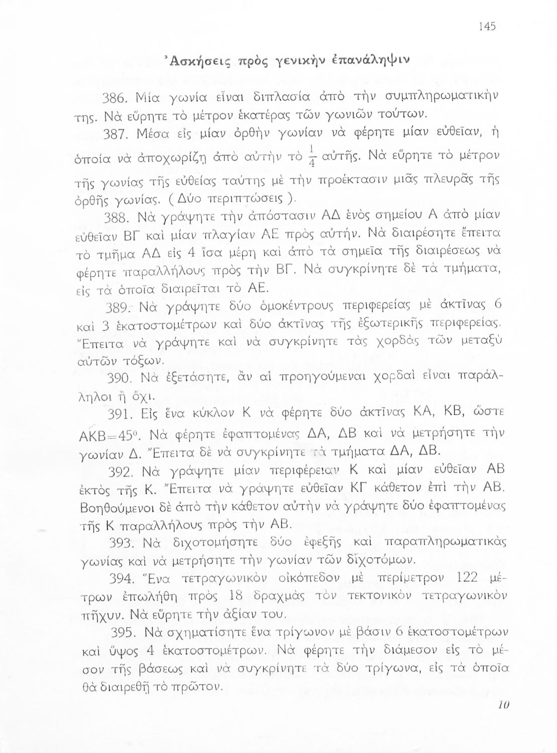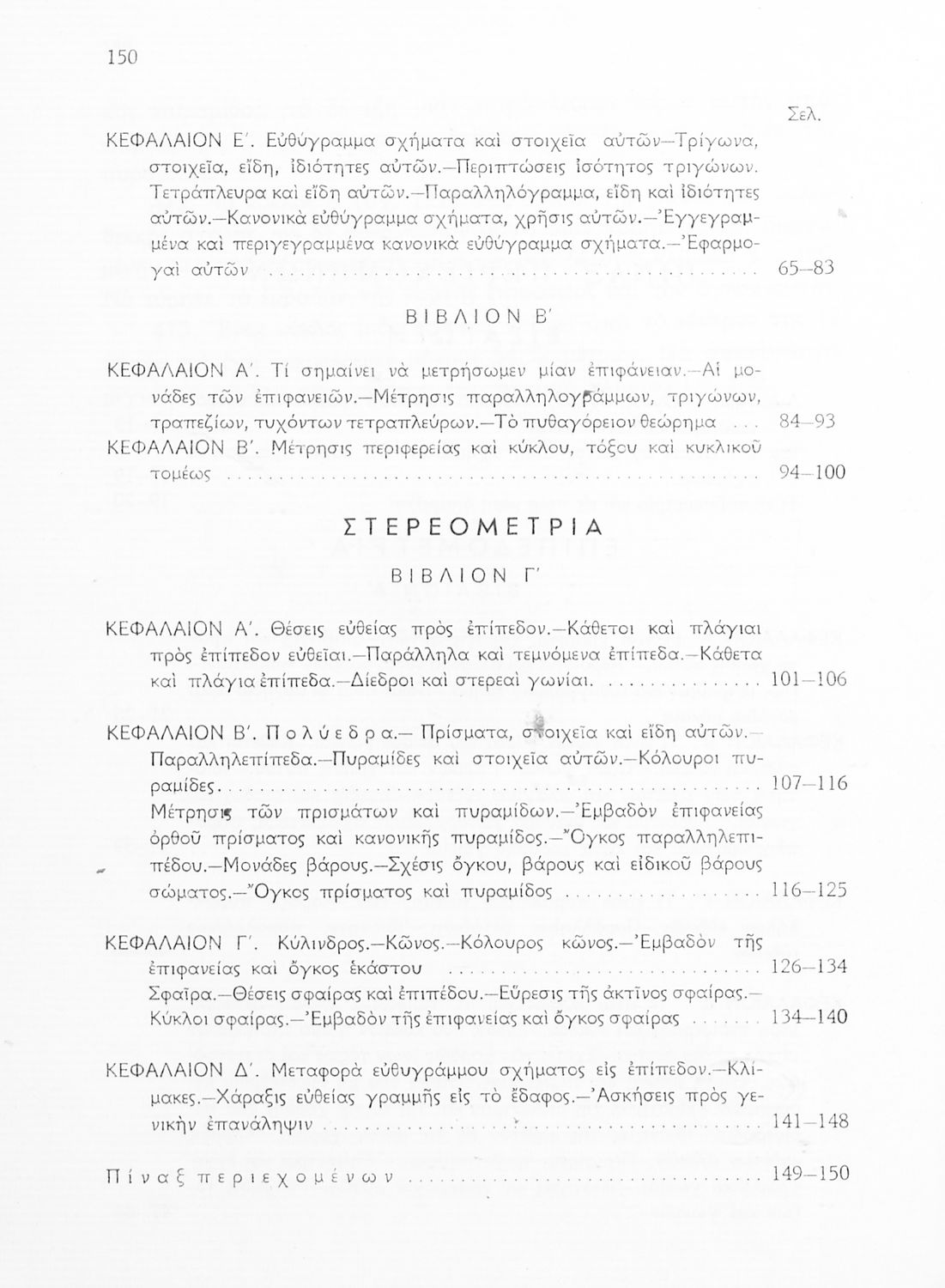 Σχολικό εγχειρίδιο Γεωμετρίας για τα Γυμνάσια και Αστικά Σχολεία που περιλαμβάνει θεωρία και ασκήσεις και είναι χωρισμένο σε Επιπεδομετρία και Στερεομετρία.