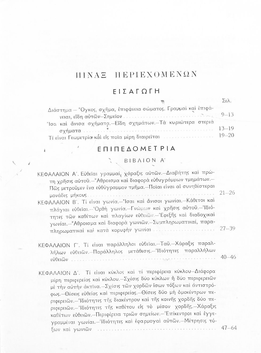 Σχολικό εγχειρίδιο των κατωτέρων τάξεων του Γυμνασίου για το μάθημα της Γεωμετρίας. Το εγχειρίδιο αποτελείται από την εισαγωγή, όπου αναλύονται οι βασικές έννοιες των ιδιοτήτων και γνωρισμάτων των γεωμετρικών σχημάτων, της επιπεδομετρίας δηλαδή των ευθειών, των γωνιών, των παραλλήλων, των κύκλων, των ευθύγραμμων σχημάτων και της στερεομετρίας, της θεματικής εκείνης που αναλύει τις θέσεις της ευθείας, του κυλίνδρου, του κώνου, των πολυέδρων κ.α.