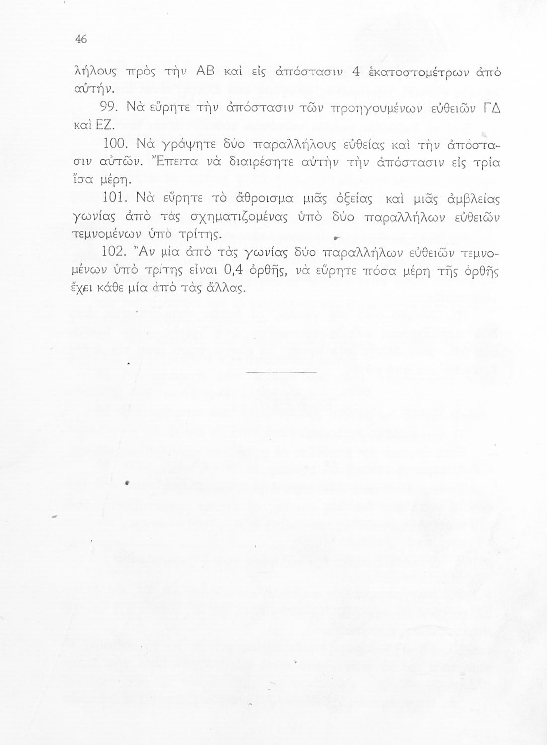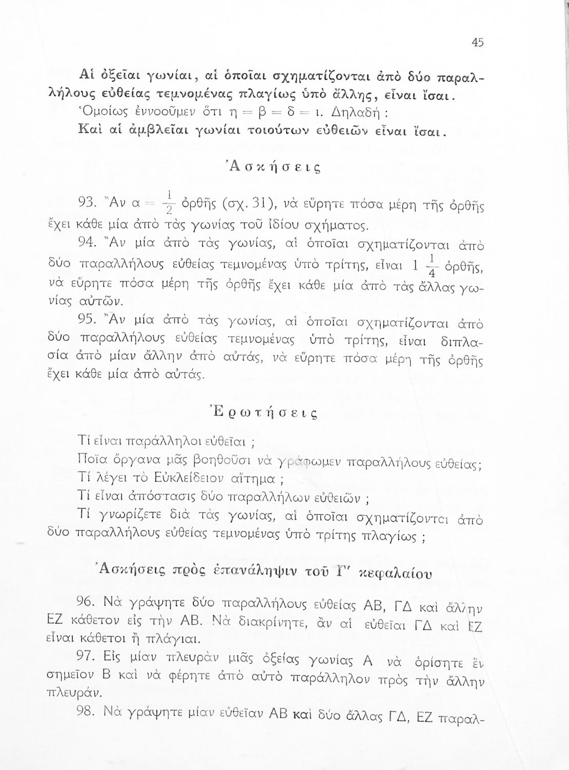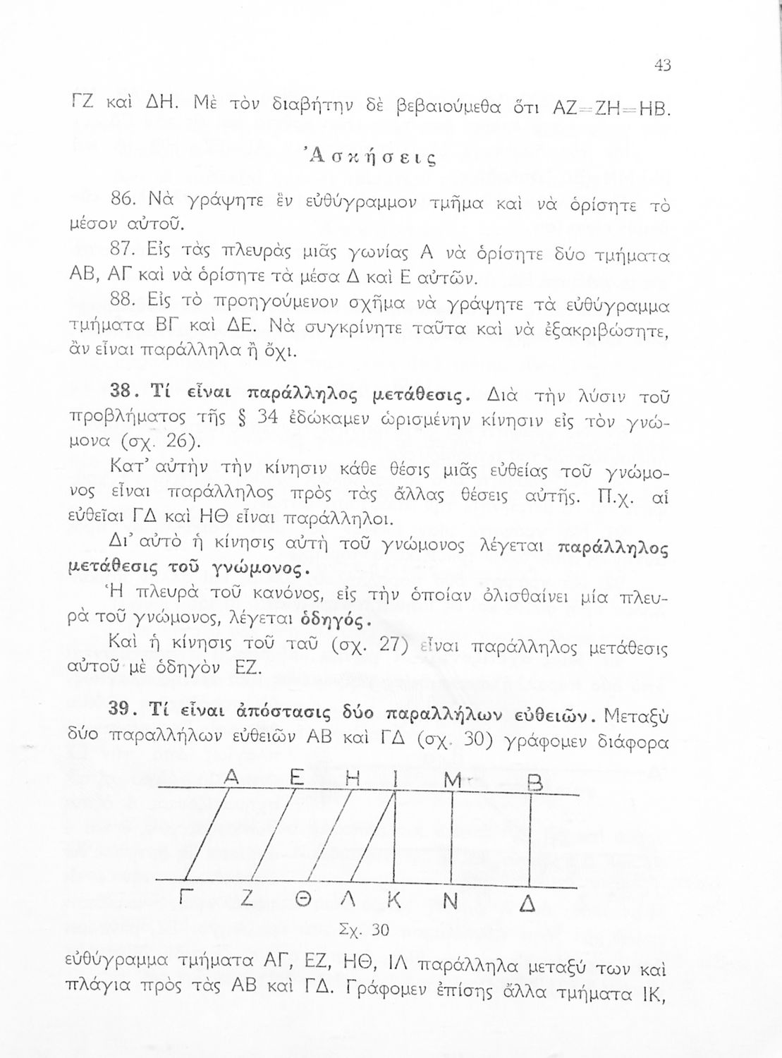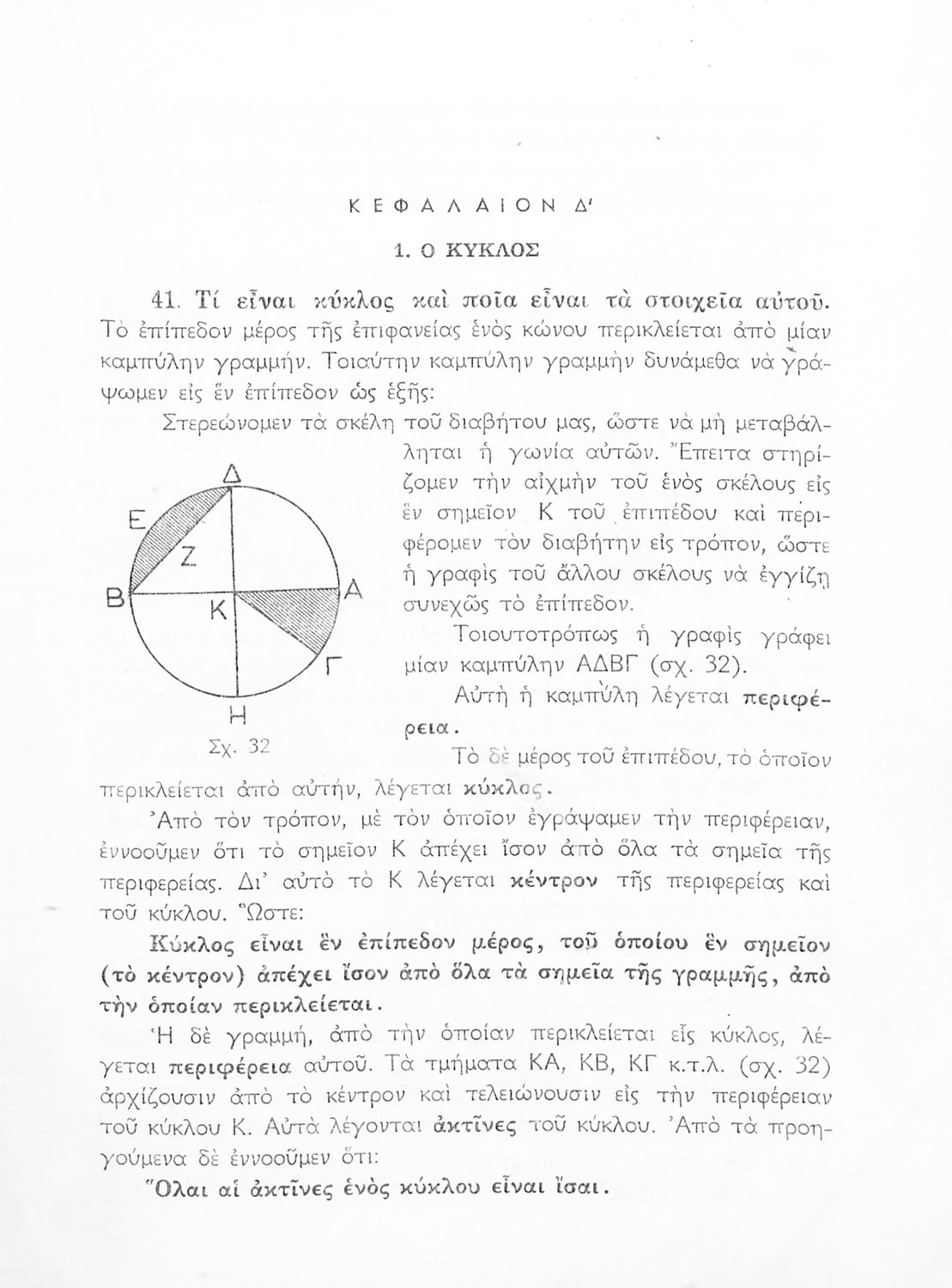 Σχολικό εγχειρίδιο των κατωτέρων τάξεων του Γυμνασίου για το μάθημα της Γεωμετρίας. Το εγχειρίδιο αποτελείται από την εισαγωγή, όπου αναλύονται οι βασικές έννοιες των ιδιοτήτων και γνωρισμάτων των γεωμετρικών σχημάτων, της επιπεδομετρίας δηλαδή των ευθειών, των γωνιών, των παραλλήλων, των κύκλων, των ευθύγραμμων σχημάτων και της στερεομετρίας, της θεματικής εκείνης που αναλύει τις θέσεις της ευθείας, του κυλίνδρου, του κώνου, των πολυέδρων κ.α.