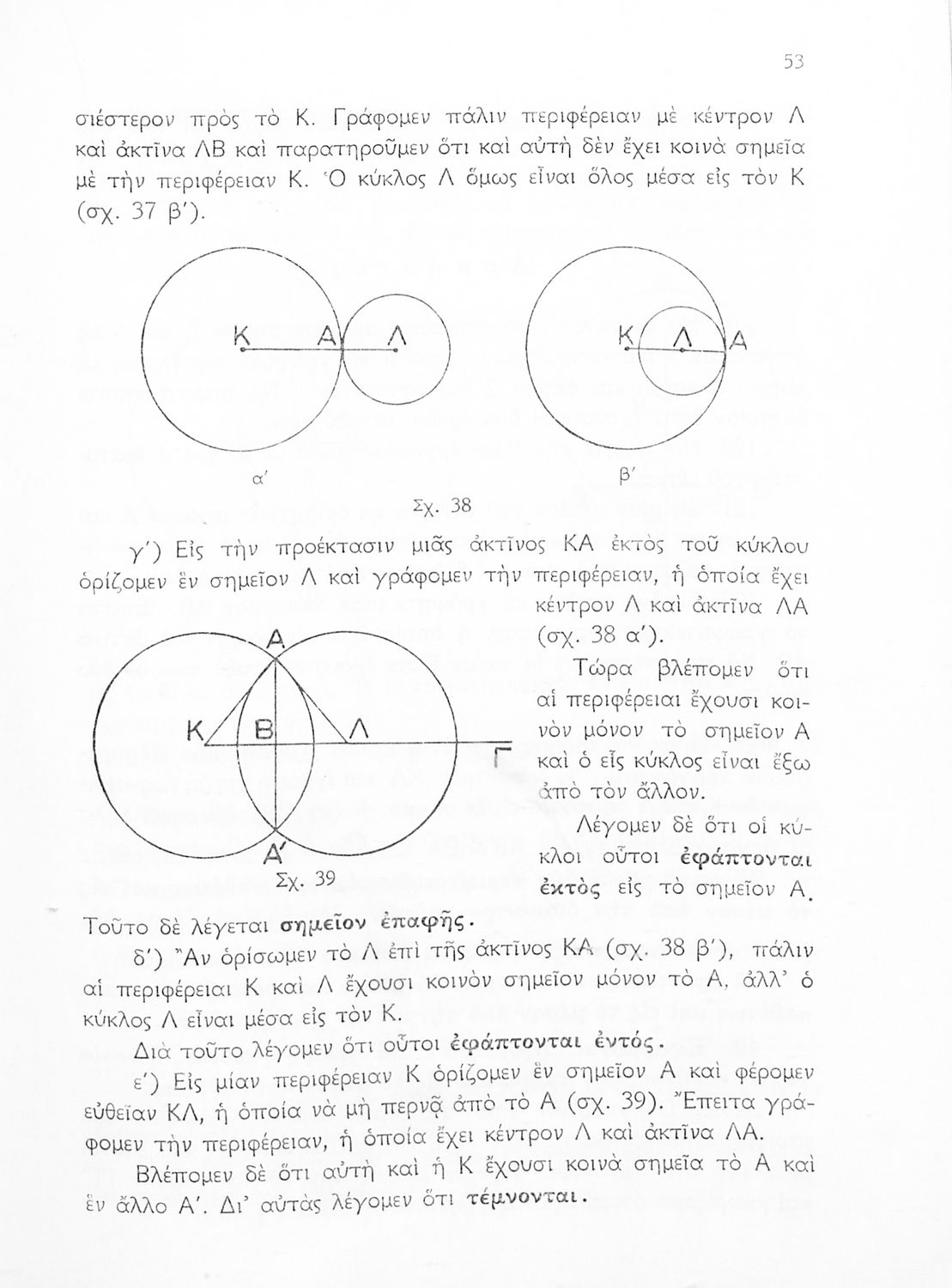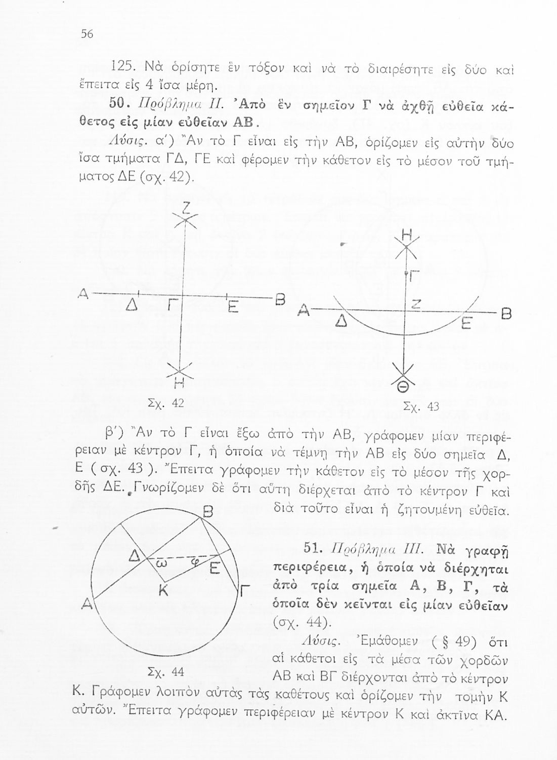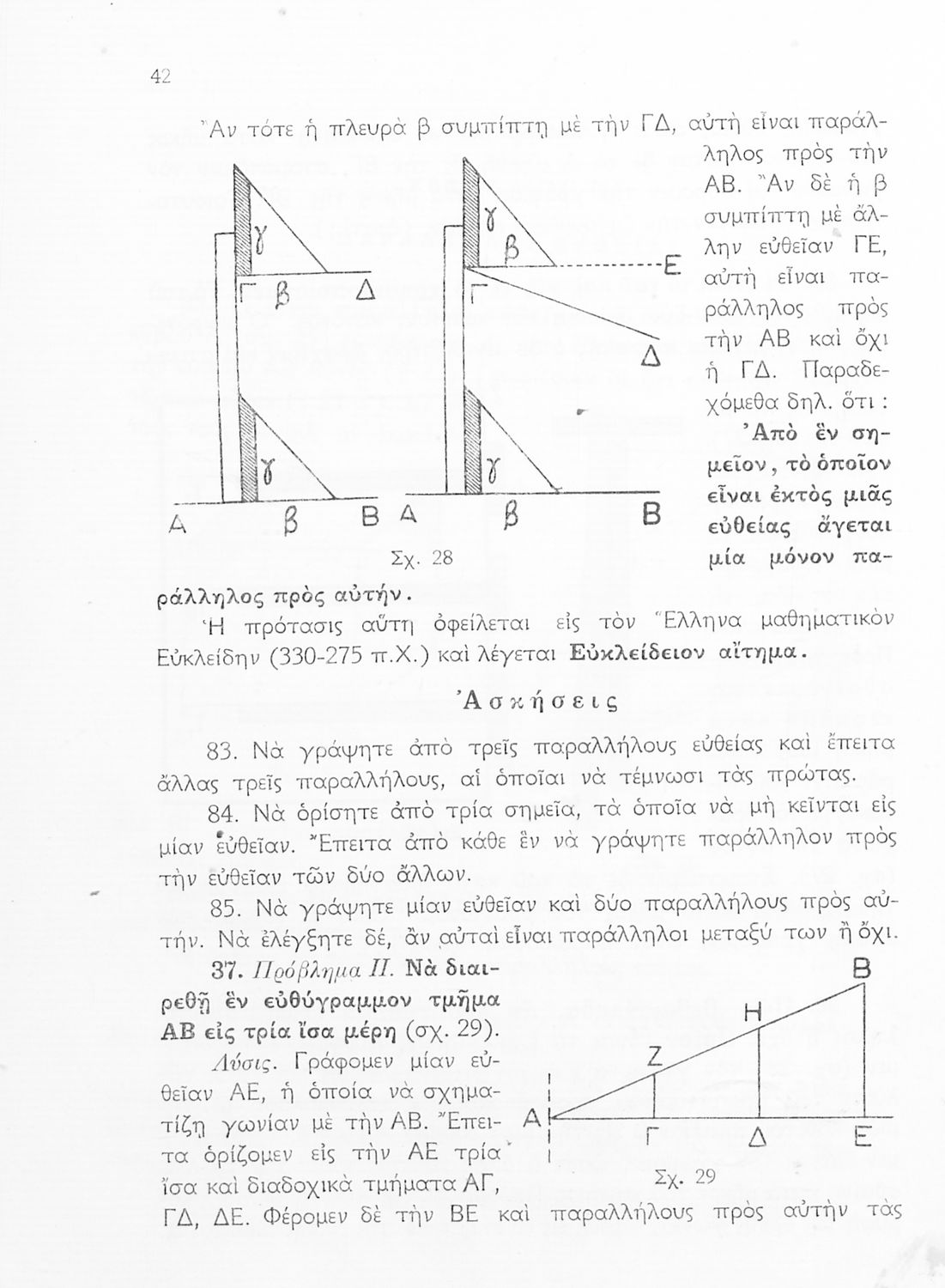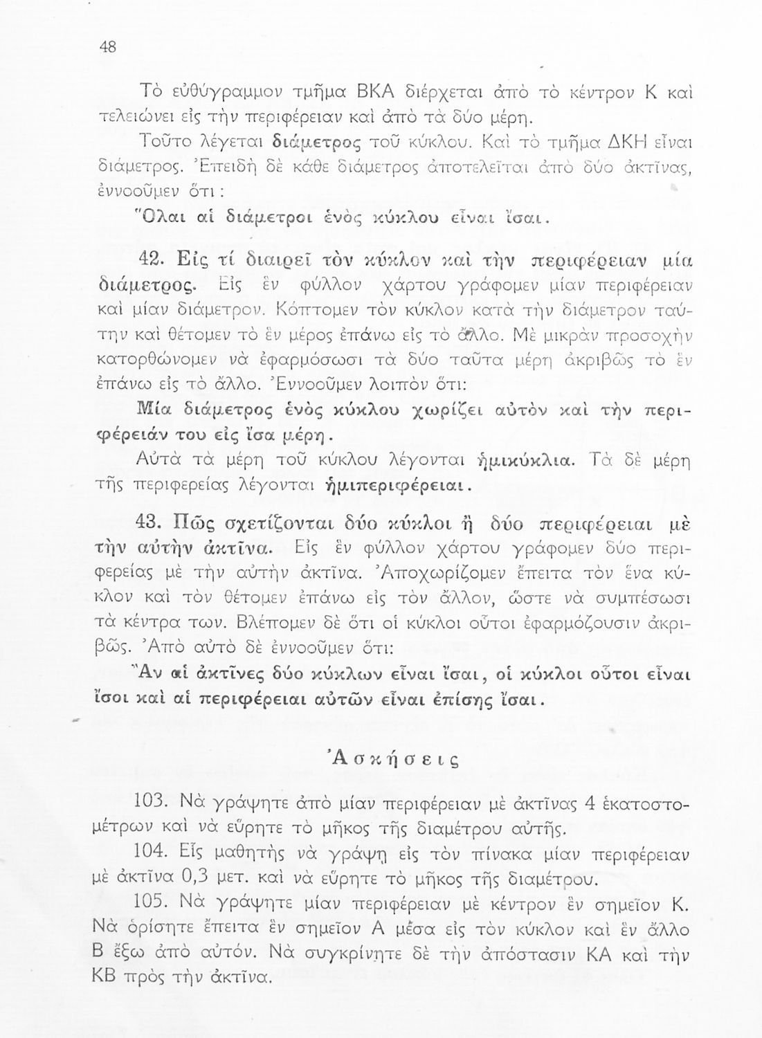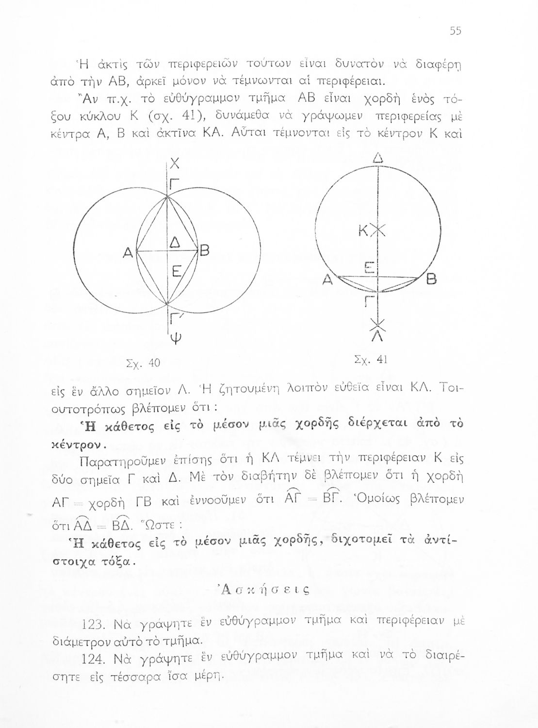 Σχολικό εγχειρίδιο των κατωτέρων τάξεων του Γυμνασίου για το μάθημα της Γεωμετρίας. Το εγχειρίδιο αποτελείται από την εισαγωγή, όπου αναλύονται οι βασικές έννοιες των ιδιοτήτων και γνωρισμάτων των γεωμετρικών σχημάτων, της επιπεδομετρίας δηλαδή των ευθειών, των γωνιών, των παραλλήλων, των κύκλων, των ευθύγραμμων σχημάτων και της στερεομετρίας, της θεματικής εκείνης που αναλύει τις θέσεις της ευθείας, του κυλίνδρου, του κώνου, των πολυέδρων κ.α.