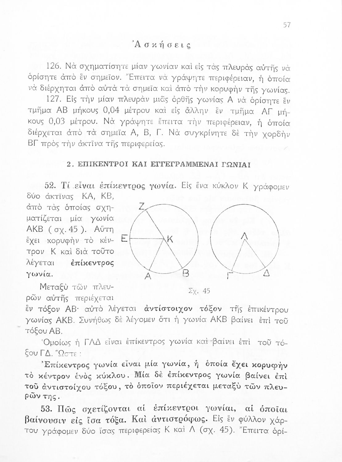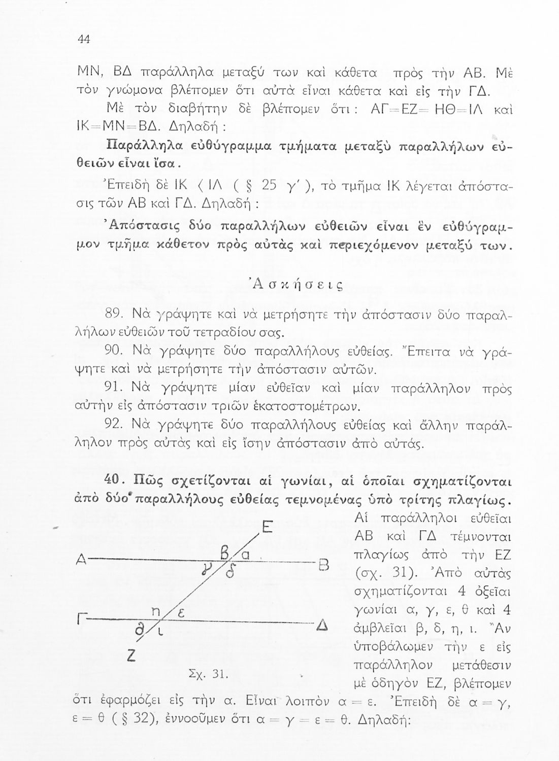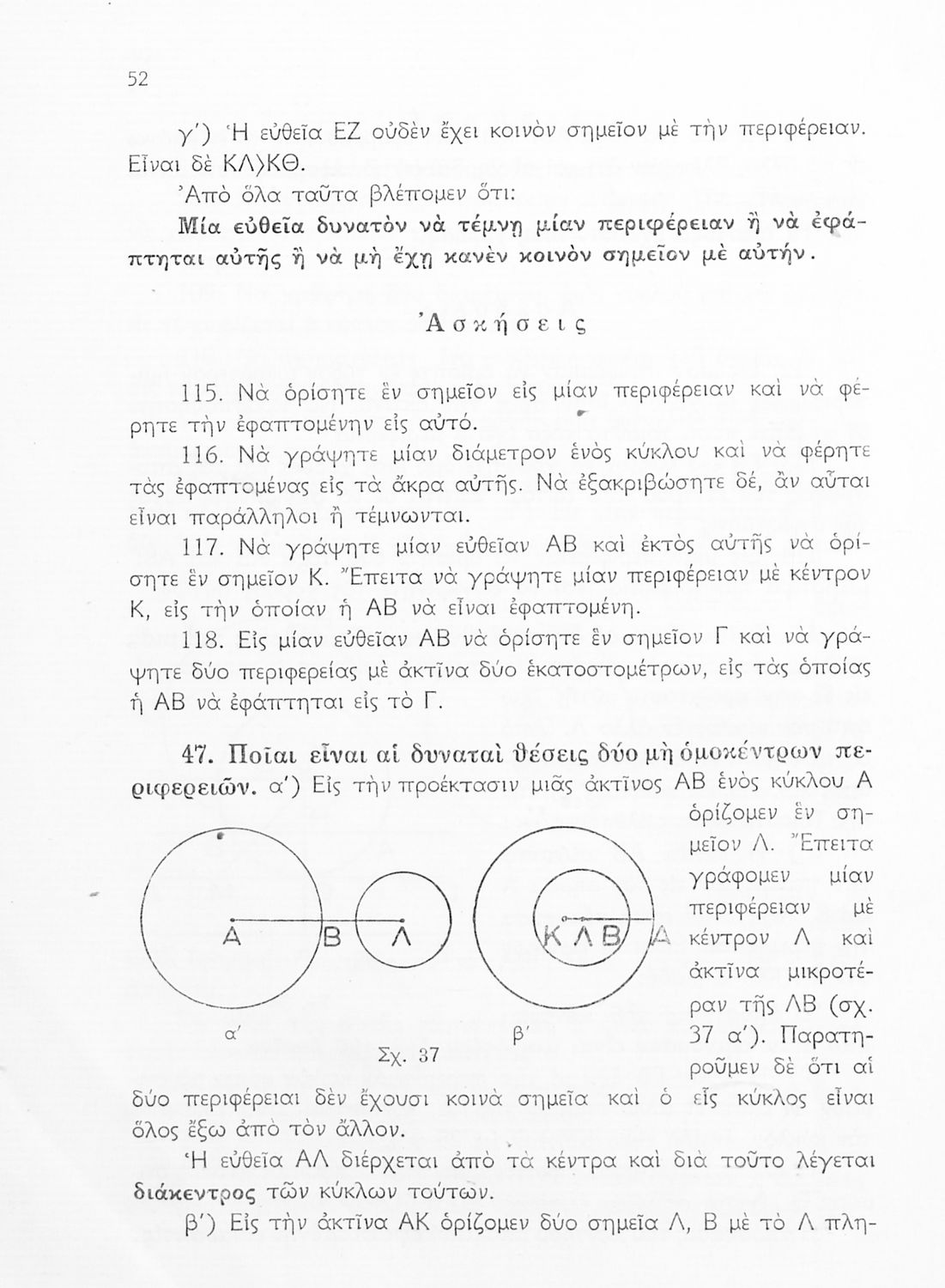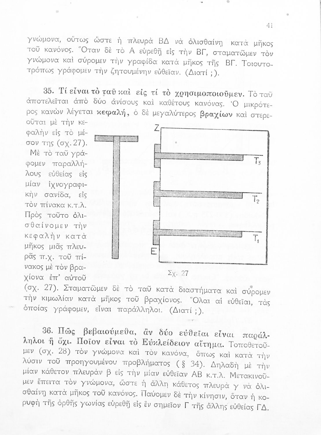 Σχολικό εγχειρίδιο των κατωτέρων τάξεων του Γυμνασίου για το μάθημα της Γεωμετρίας. Το εγχειρίδιο αποτελείται από την εισαγωγή, όπου αναλύονται οι βασικές έννοιες των ιδιοτήτων και γνωρισμάτων των γεωμετρικών σχημάτων, της επιπεδομετρίας δηλαδή των ευθειών, των γωνιών, των παραλλήλων, των κύκλων, των ευθύγραμμων σχημάτων και της στερεομετρίας, της θεματικής εκείνης που αναλύει τις θέσεις της ευθείας, του κυλίνδρου, του κώνου, των πολυέδρων κ.α.