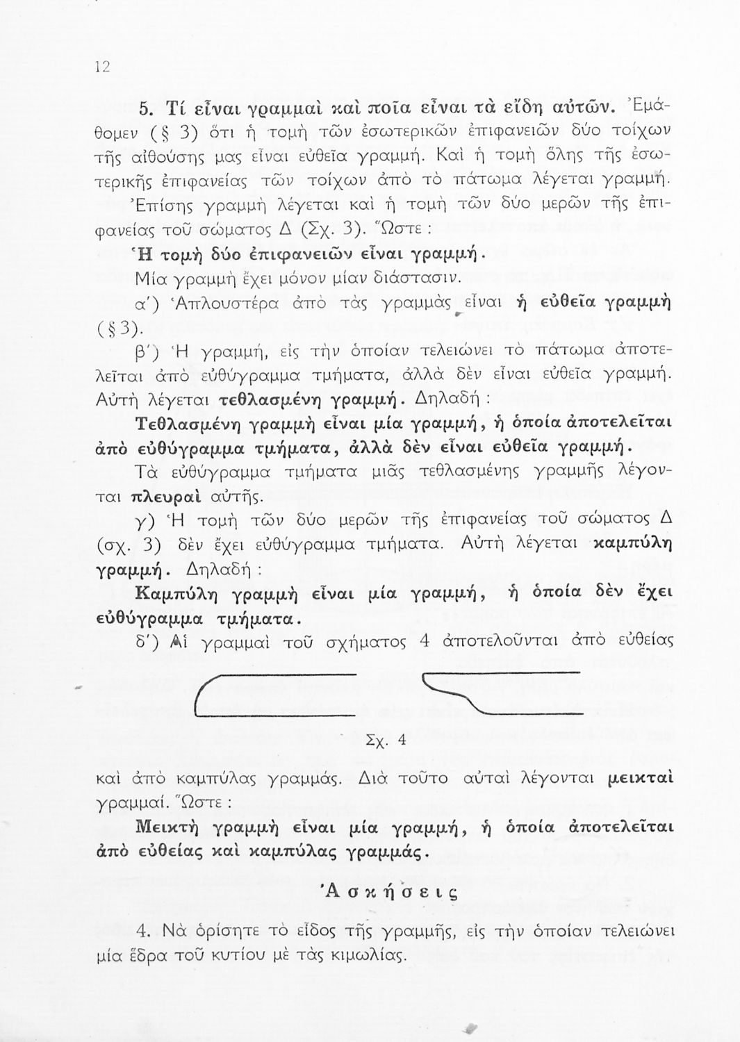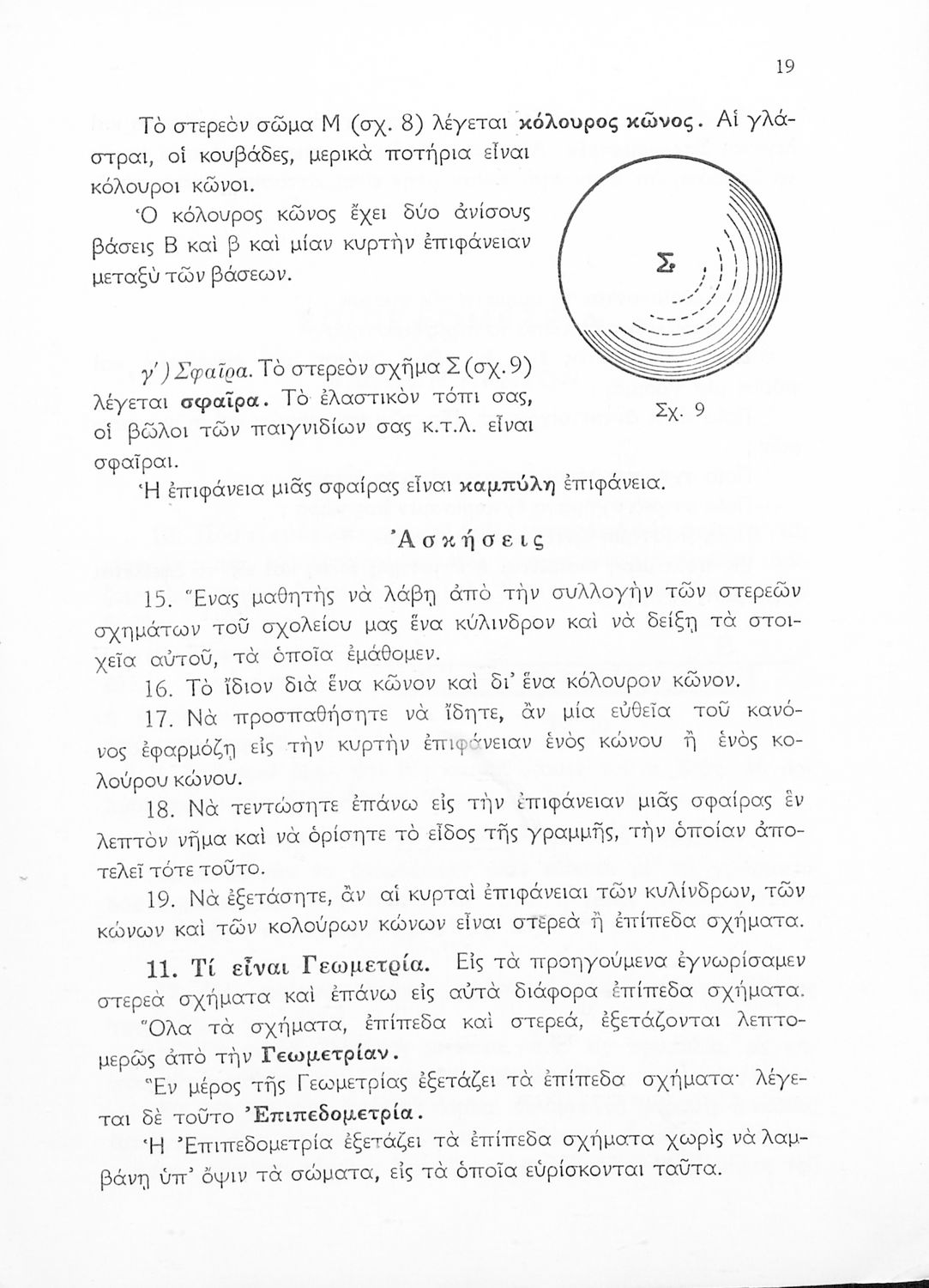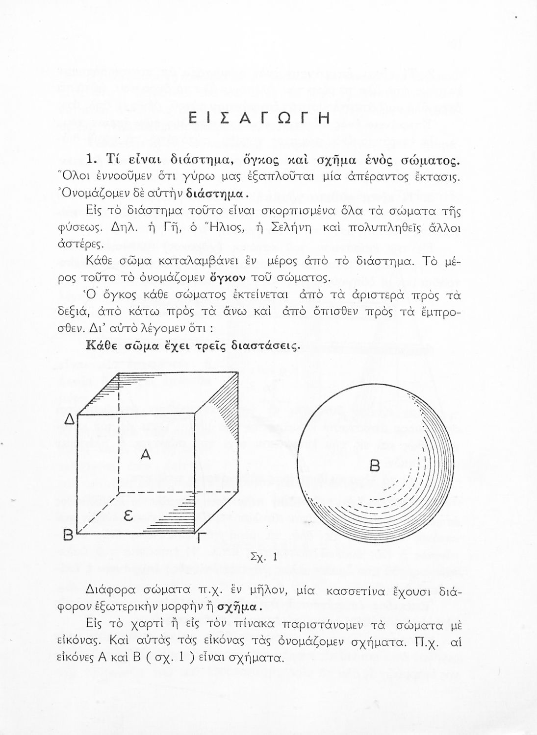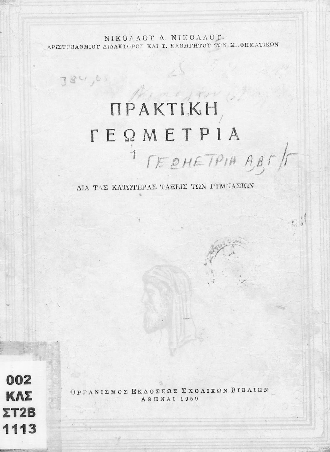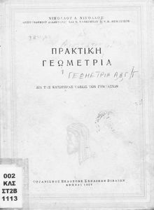 Σχολικό εγχειρίδιο των κατωτέρων τάξεων του Γυμνασίου για το μάθημα της Γεωμετρίας. Το εγχειρίδιο αποτελείται από την εισαγωγή, όπου αναλύονται οι βασικές έννοιες των ιδιοτήτων και γνωρισμάτων των γεωμετρικών σχημάτων, της επιπεδομετρίας δηλαδή των ευθειών, των γωνιών, των παραλλήλων, των κύκλων, των ευθύγραμμων σχημάτων και της στερεομετρίας, της θεματικής εκείνης που αναλύει τις θέσεις της ευθείας, του κυλίνδρου, του κώνου, των πολυέδρων κ.α.