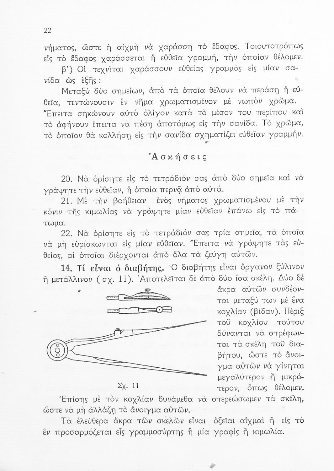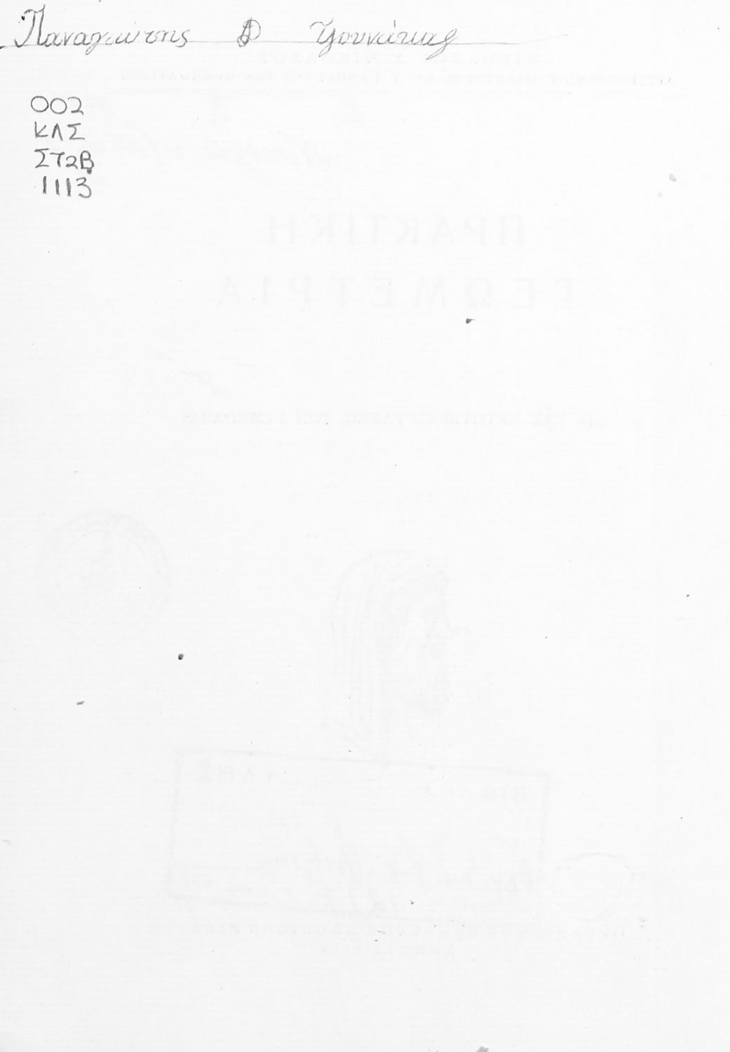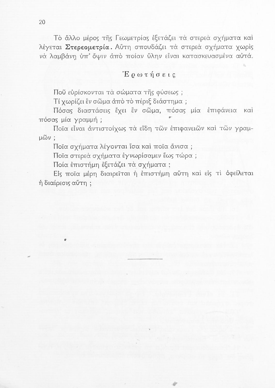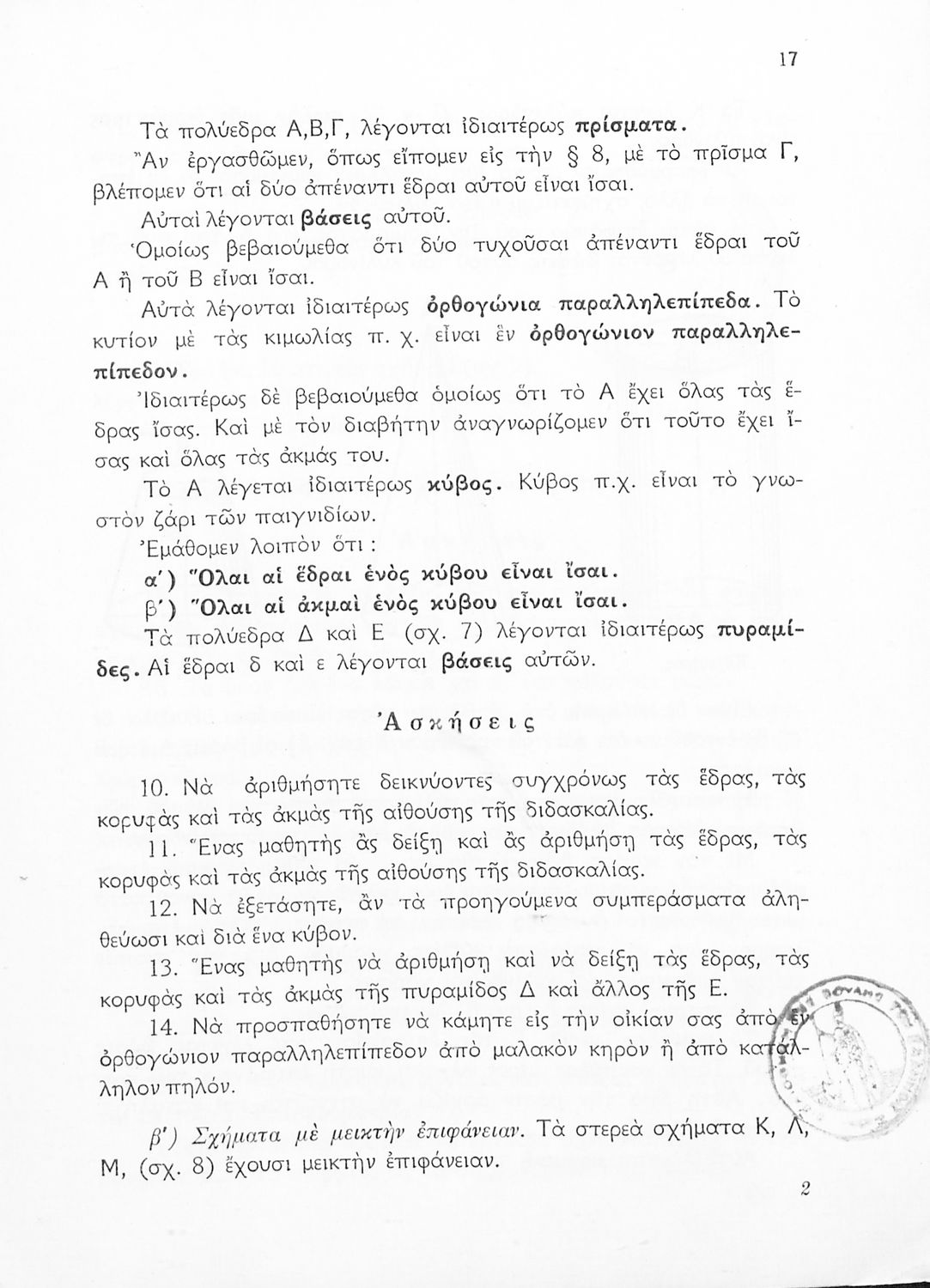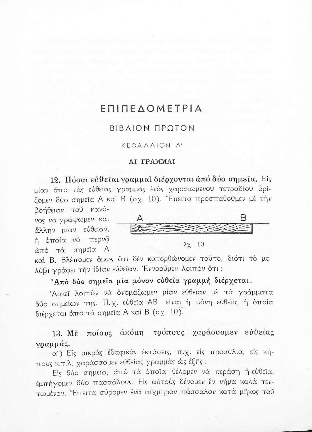 Σχολικό εγχειρίδιο των κατωτέρων τάξεων του Γυμνασίου για το μάθημα της Γεωμετρίας. Το εγχειρίδιο αποτελείται από την εισαγωγή, όπου αναλύονται οι βασικές έννοιες των ιδιοτήτων και γνωρισμάτων των γεωμετρικών σχημάτων, της επιπεδομετρίας δηλαδή των ευθειών, των γωνιών, των παραλλήλων, των κύκλων, των ευθύγραμμων σχημάτων και της στερεομετρίας, της θεματικής εκείνης που αναλύει τις θέσεις της ευθείας, του κυλίνδρου, του κώνου, των πολυέδρων κ.α.