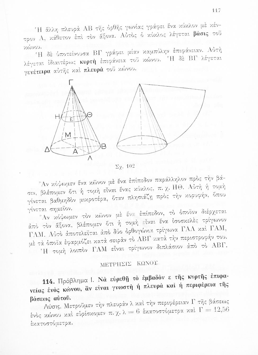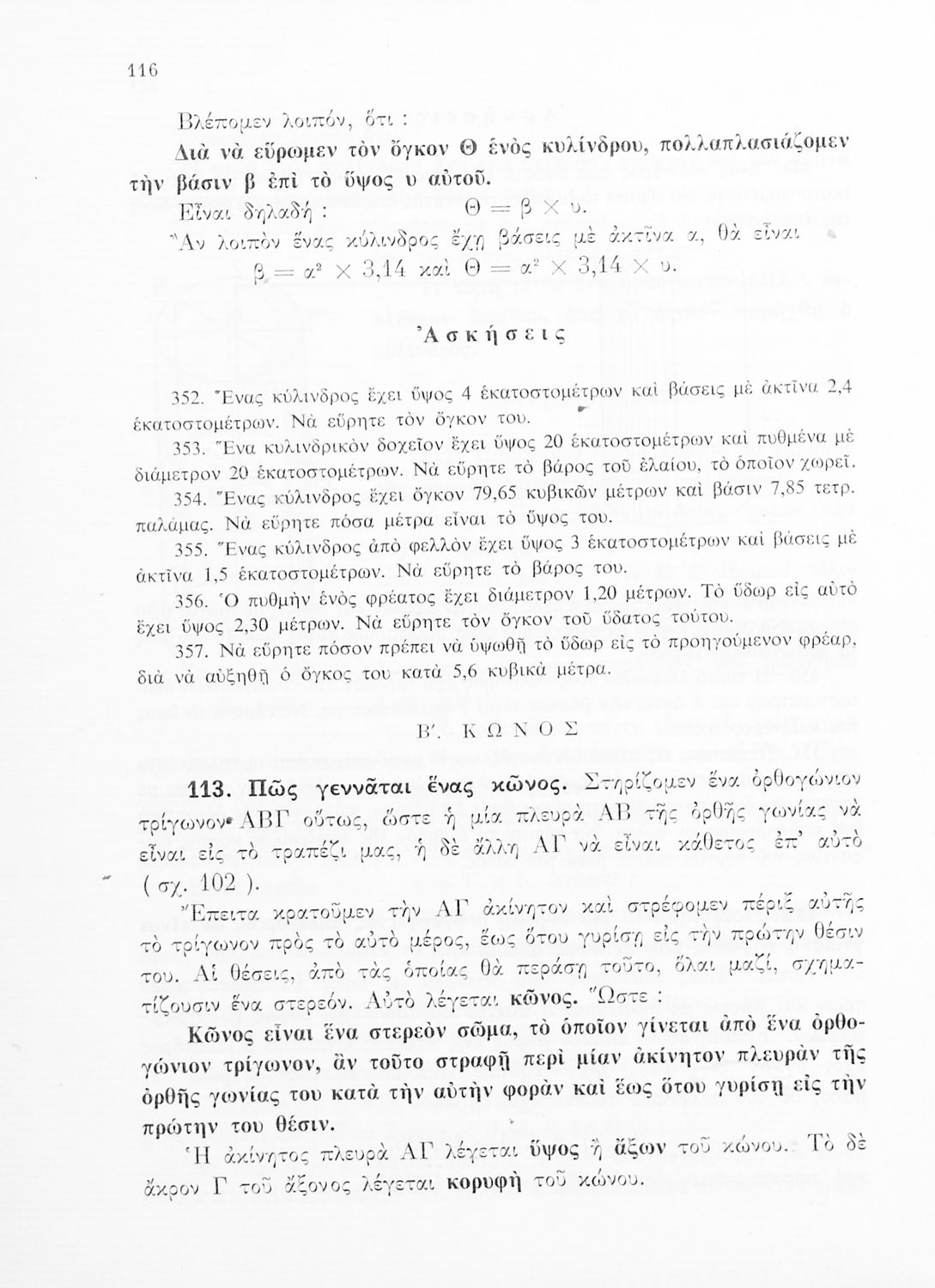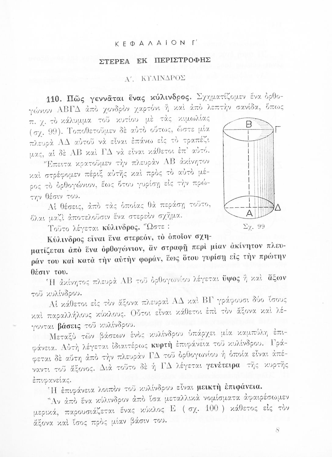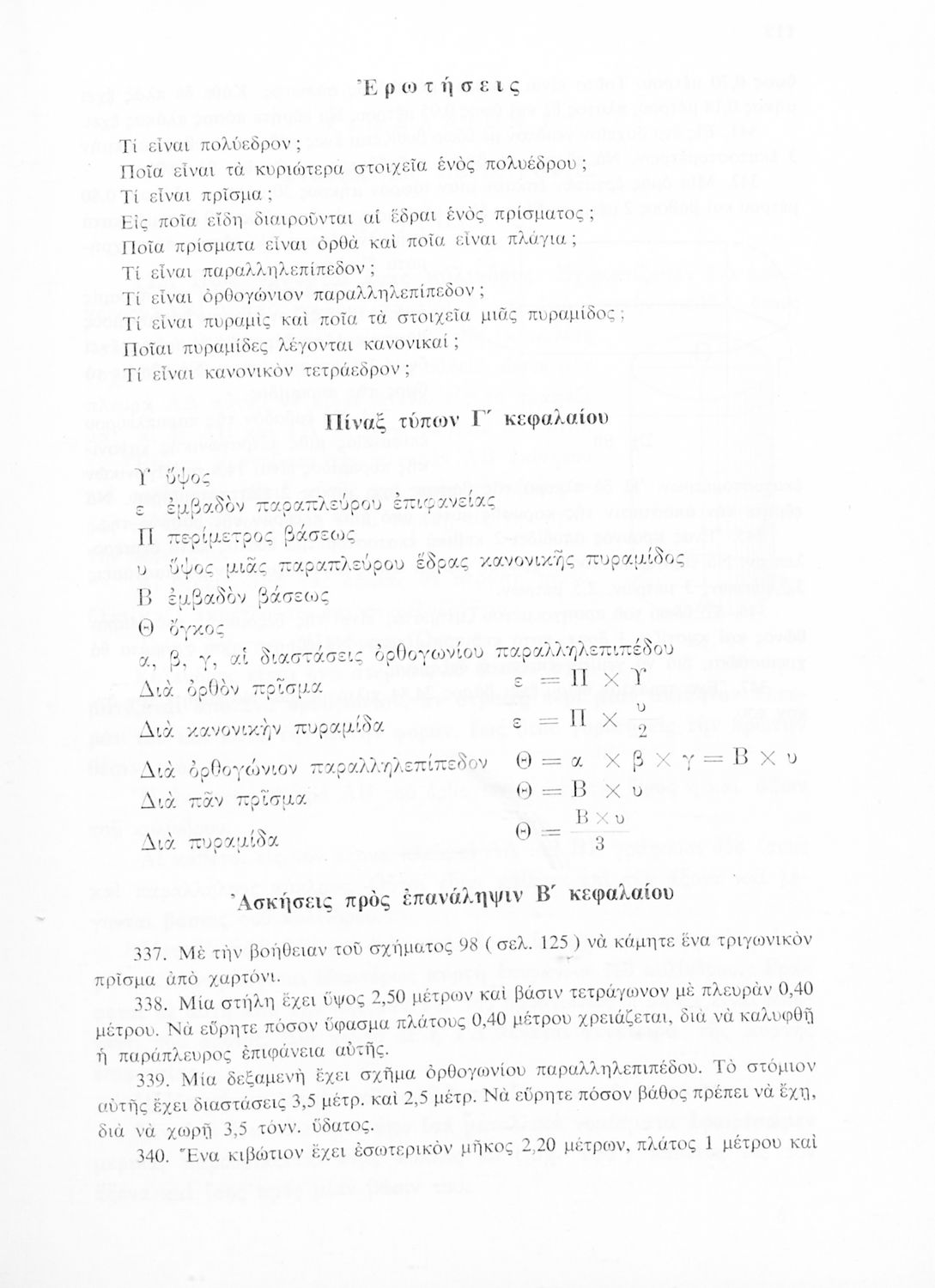 Σχολικό εγχειρίδιο των κατωτέρων τάξεων του Γυμνασίου για το μάθημα της Γεωμετρίας. Το εγχειρίδιο αποτελείται από την εισαγωγή, όπου αναλύονται οι βασικές έννοιες των ιδιοτήτων και γνωρισμάτων των γεωμετρικών σχημάτων, της επιπεδομετρίας δηλαδή των ευθειών, των γωνιών, των παραλλήλων, των κύκλων, των ευθύγραμμων σχημάτων και της στερεομετρίας, της θεματικής εκείνης που αναλύει τις θέσεις της ευθείας, του κυλίνδρου, του κώνου, των πολυέδρων κ.α.