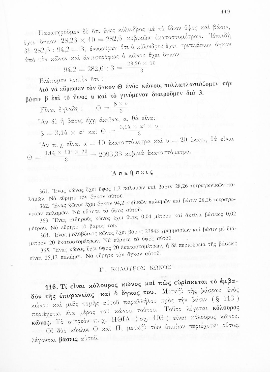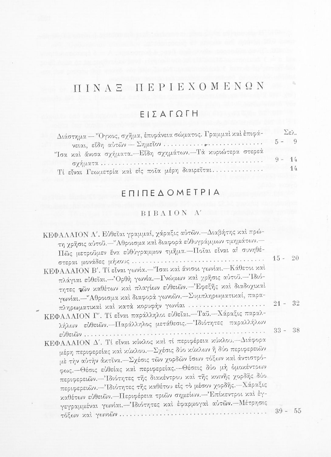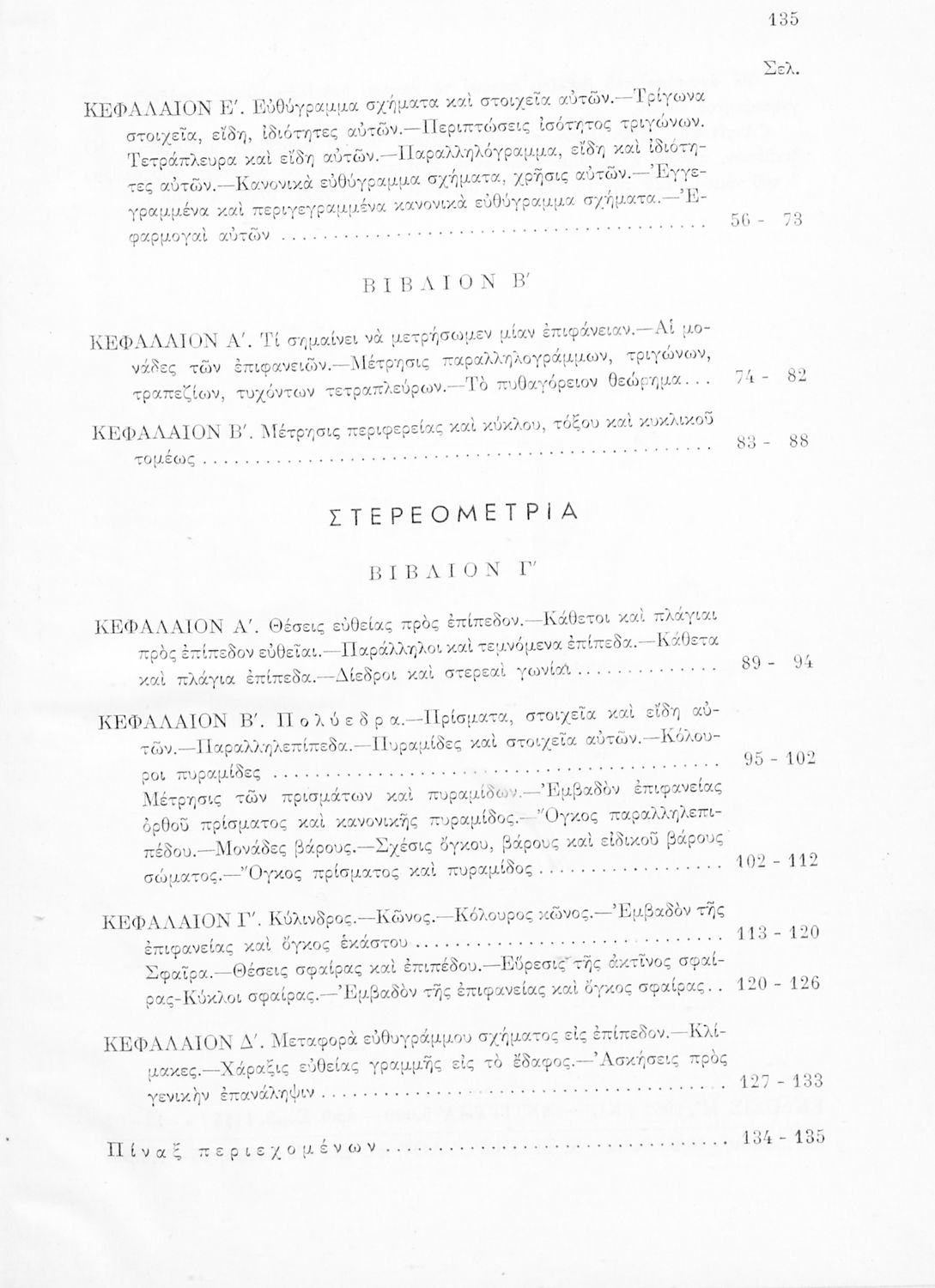 Σχολικό εγχειρίδιο Γεωμετρίας Γυμνασίων και Αστικών Σχολείων χωρισμένο σε Επιπεδομετρία και Στερεομετρία. Περιλαμβάνει και στοιχεία Χωρομετρίας.