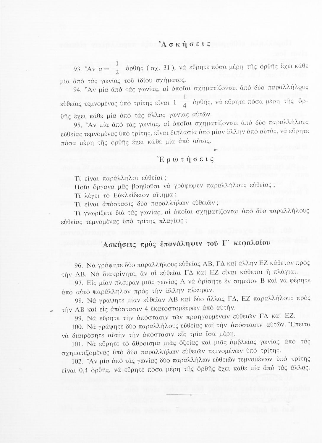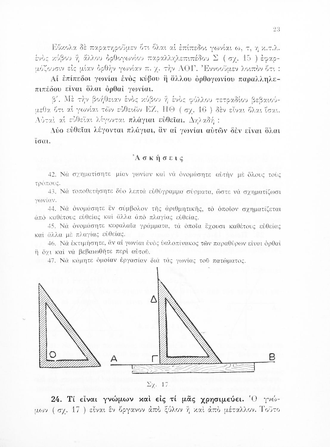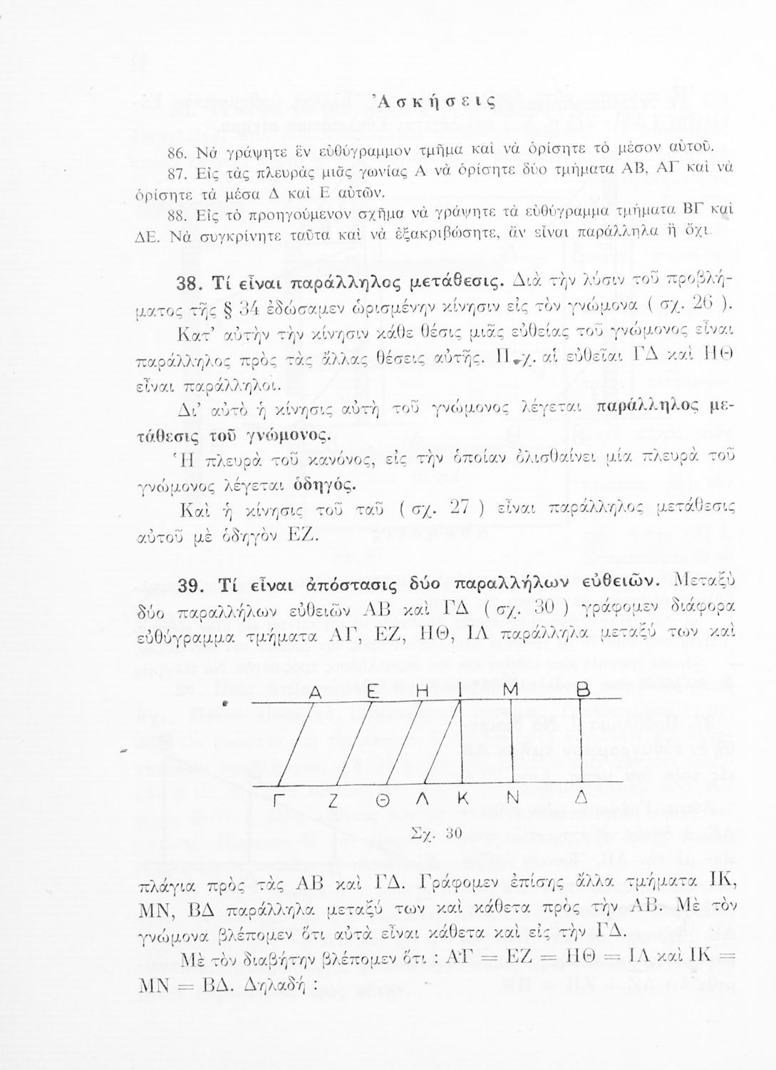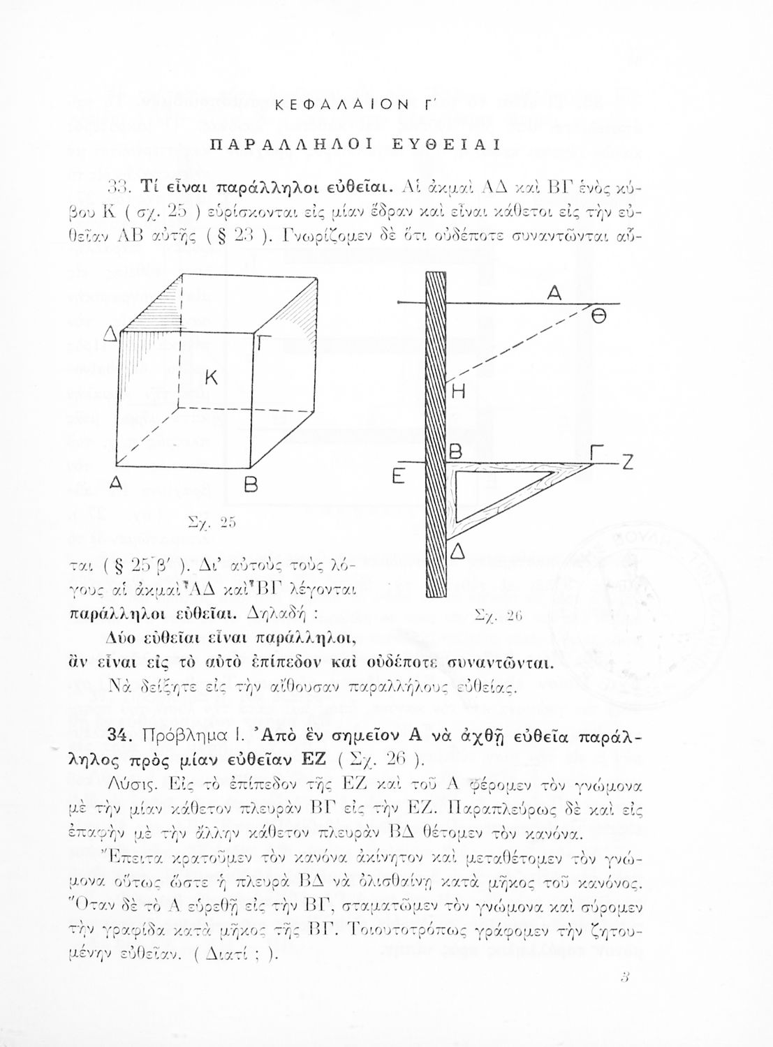 Σχολικό εγχειρίδιο των κατωτέρων τάξεων του Γυμνασίου για το μάθημα της Γεωμετρίας. Το εγχειρίδιο αποτελείται από την εισαγωγή, όπου αναλύονται οι βασικές έννοιες των ιδιοτήτων και γνωρισμάτων των γεωμετρικών σχημάτων, της επιπεδομετρίας δηλαδή των ευθειών, των γωνιών, των παραλλήλων, των κύκλων, των ευθύγραμμων σχημάτων και της στερεομετρίας, της θεματικής εκείνης που αναλύει τις θέσεις της ευθείας, του κυλίνδρου, του κώνου, των πολυέδρων κ.α.