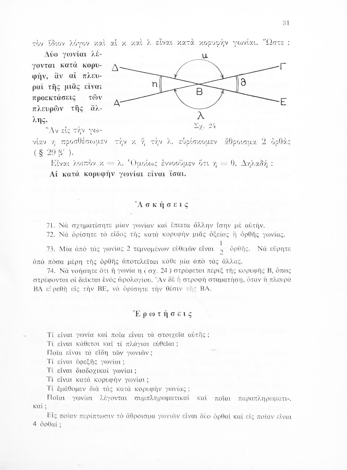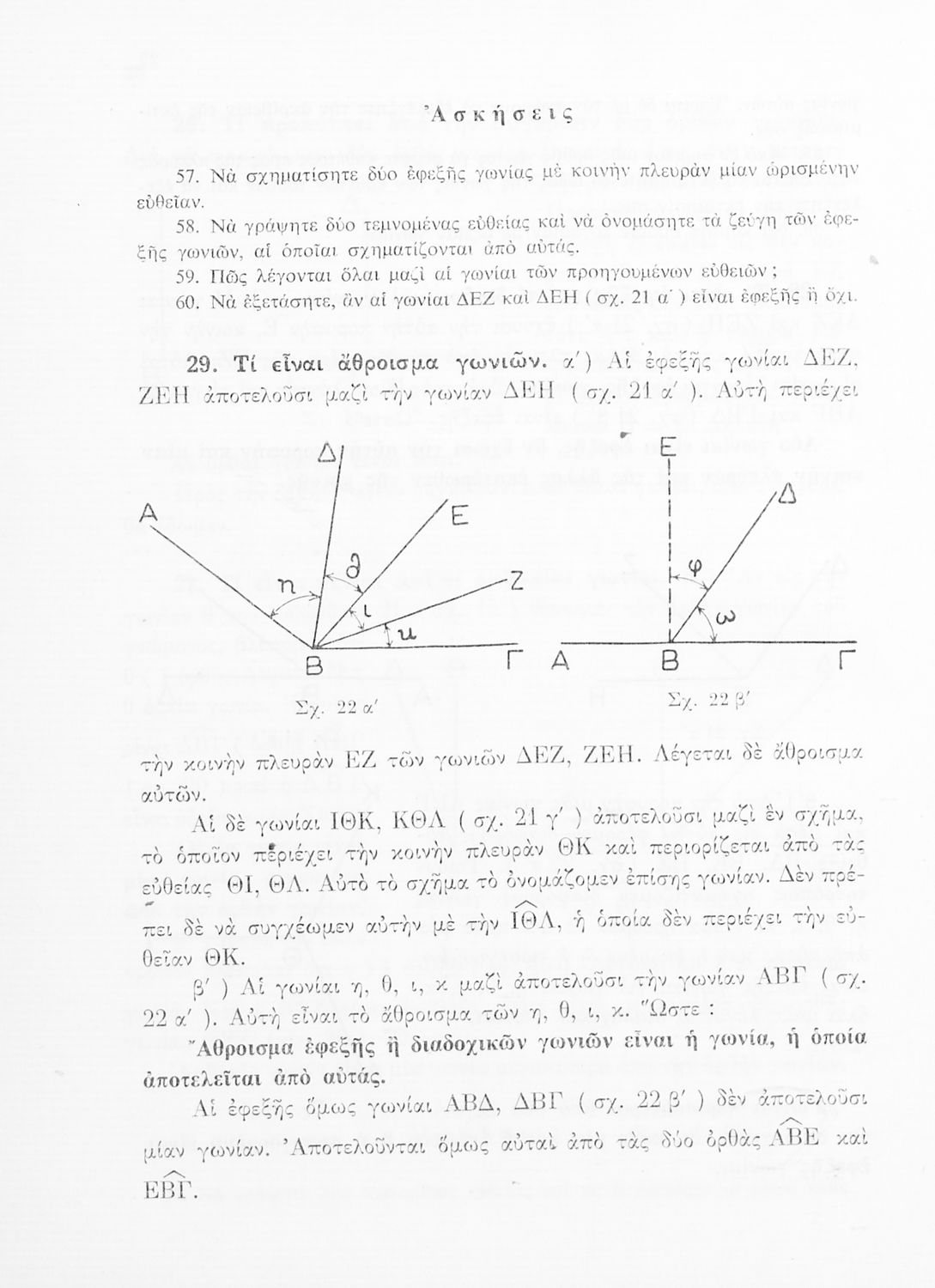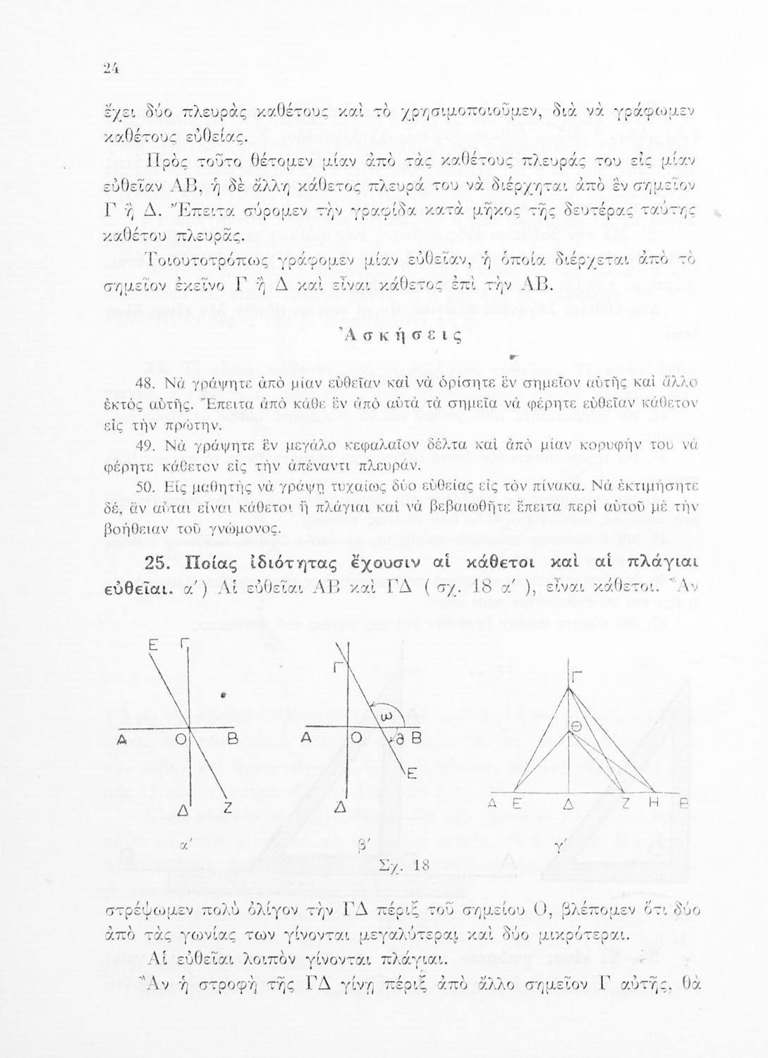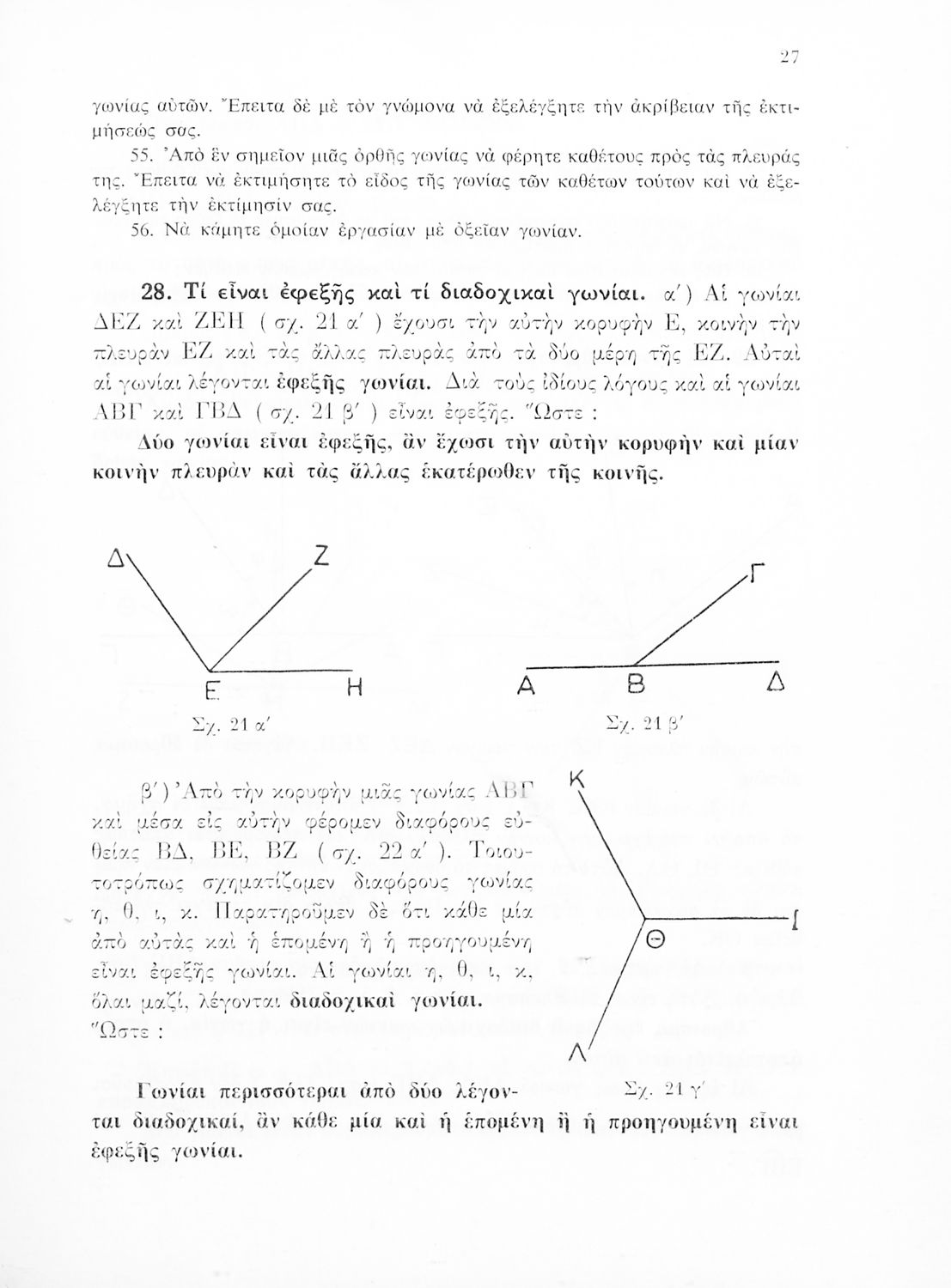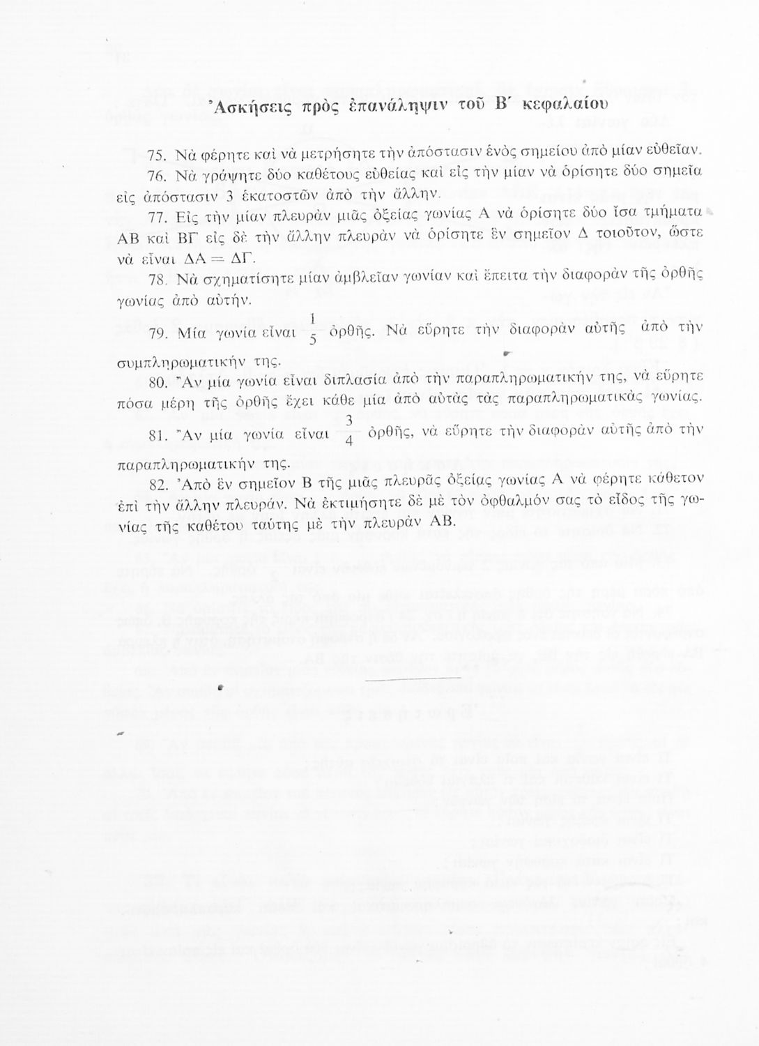 Σχολικό εγχειρίδιο των κατωτέρων τάξεων του Γυμνασίου για το μάθημα της Γεωμετρίας. Το εγχειρίδιο αποτελείται από την εισαγωγή, όπου αναλύονται οι βασικές έννοιες των ιδιοτήτων και γνωρισμάτων των γεωμετρικών σχημάτων, της επιπεδομετρίας δηλαδή των ευθειών, των γωνιών, των παραλλήλων, των κύκλων, των ευθύγραμμων σχημάτων και της στερεομετρίας, της θεματικής εκείνης που αναλύει τις θέσεις της ευθείας, του κυλίνδρου, του κώνου, των πολυέδρων κ.α.
