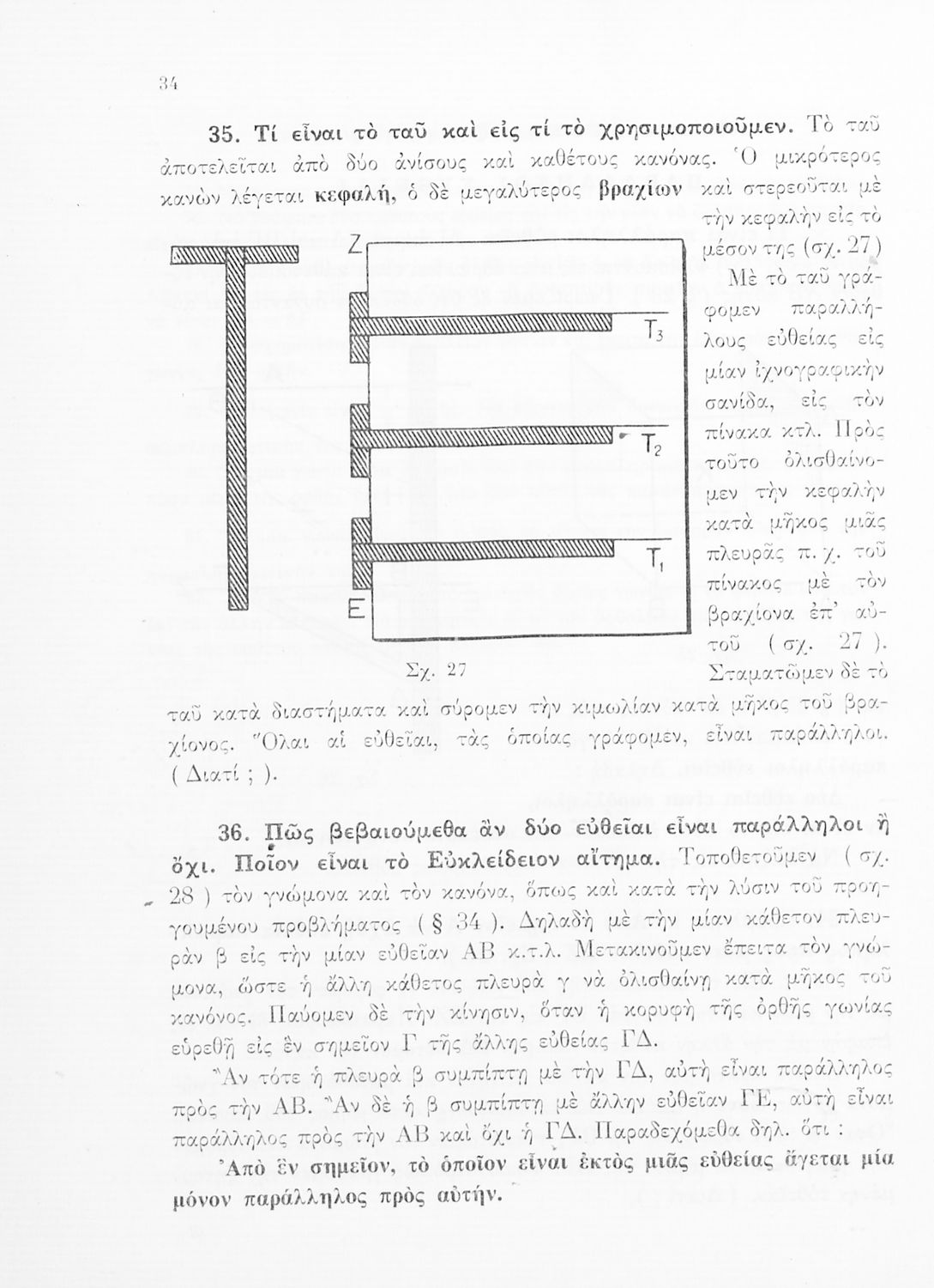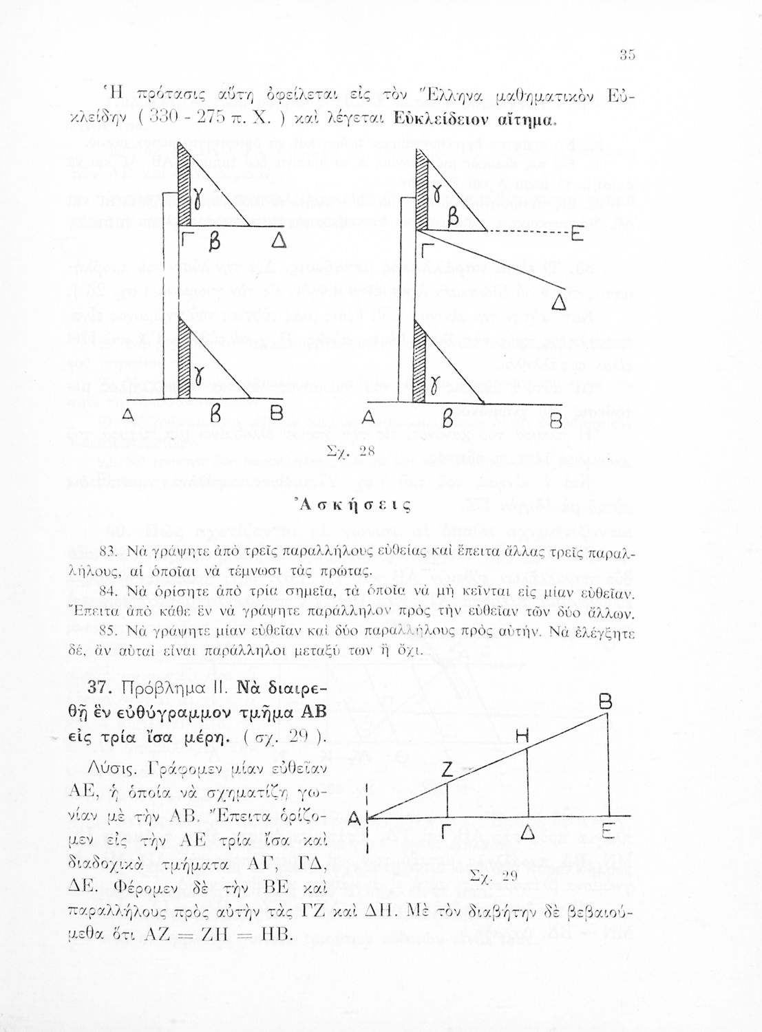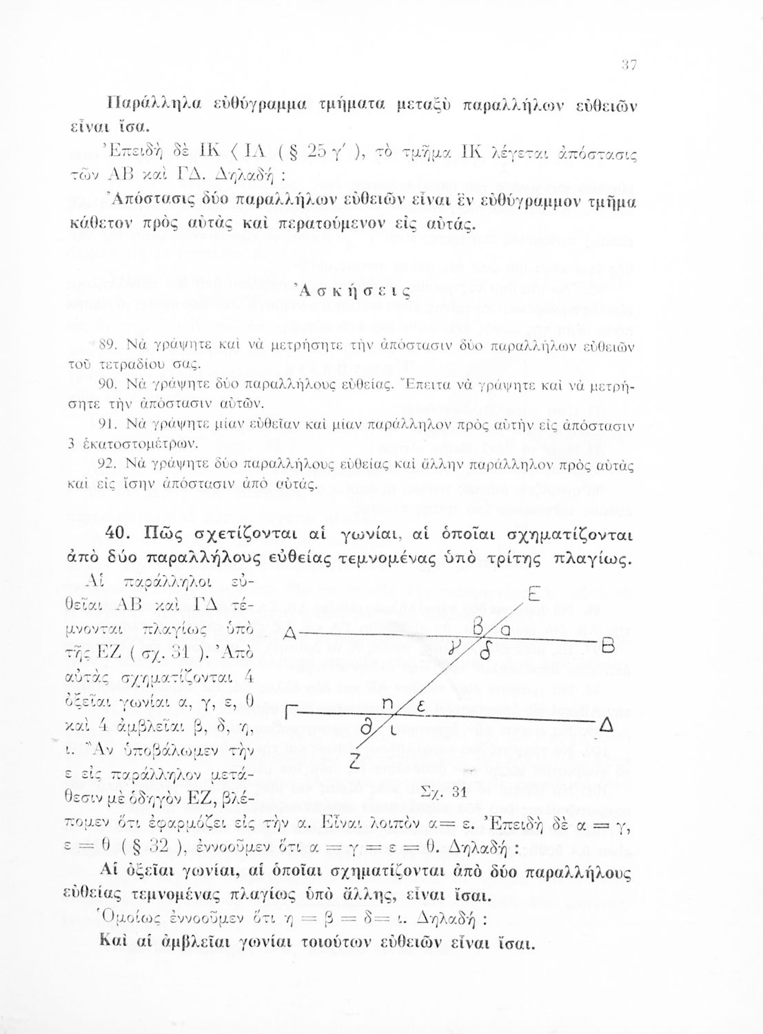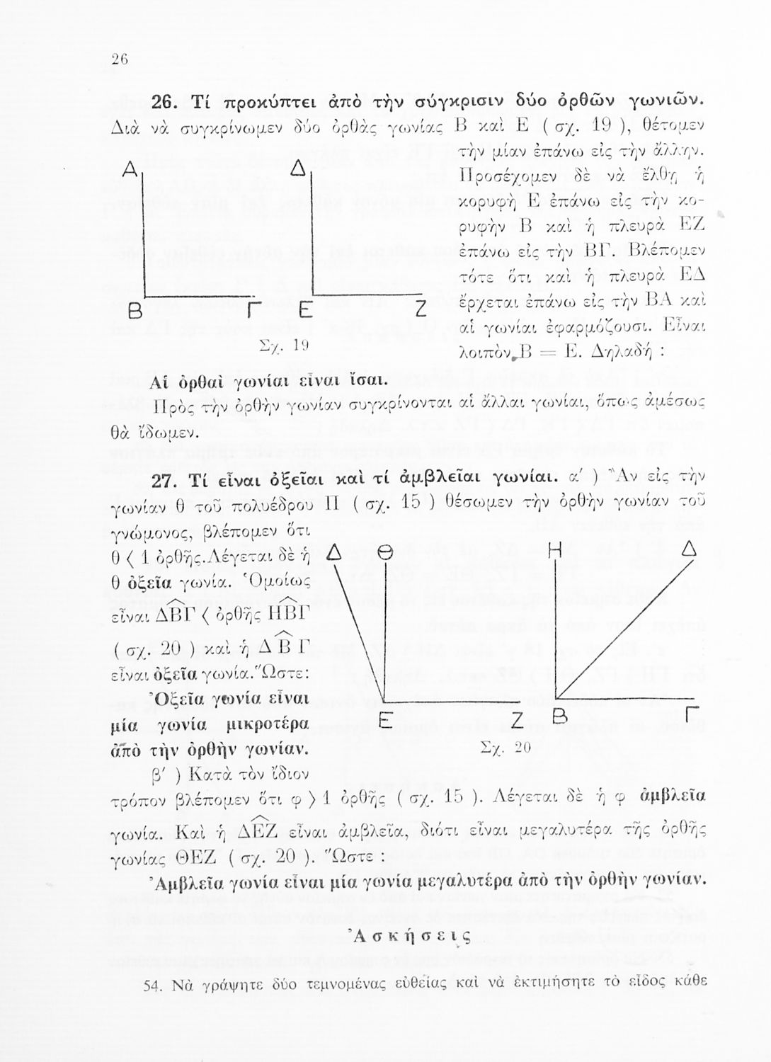 Σχολικό εγχειρίδιο των κατωτέρων τάξεων του Γυμνασίου για το μάθημα της Γεωμετρίας. Το εγχειρίδιο αποτελείται από την εισαγωγή, όπου αναλύονται οι βασικές έννοιες των ιδιοτήτων και γνωρισμάτων των γεωμετρικών σχημάτων, της επιπεδομετρίας δηλαδή των ευθειών, των γωνιών, των παραλλήλων, των κύκλων, των ευθύγραμμων σχημάτων και της στερεομετρίας, της θεματικής εκείνης που αναλύει τις θέσεις της ευθείας, του κυλίνδρου, του κώνου, των πολυέδρων κ.α.