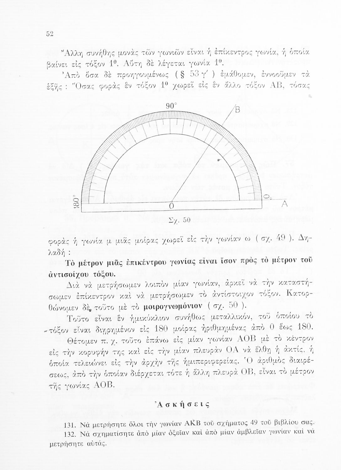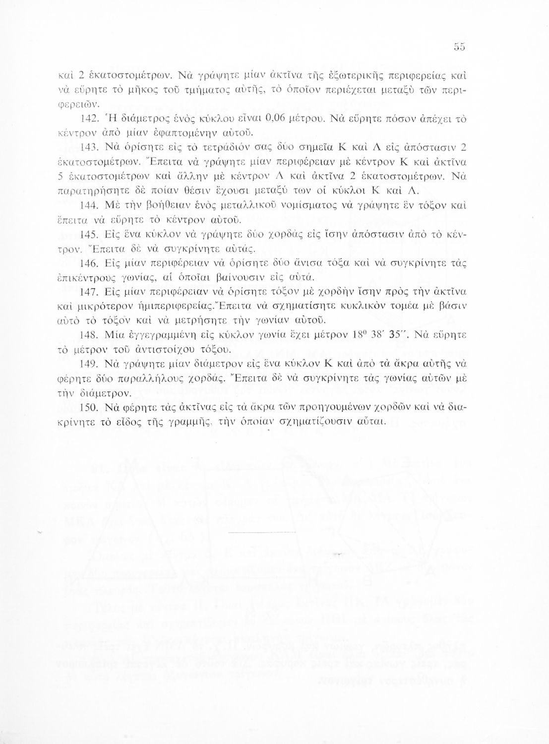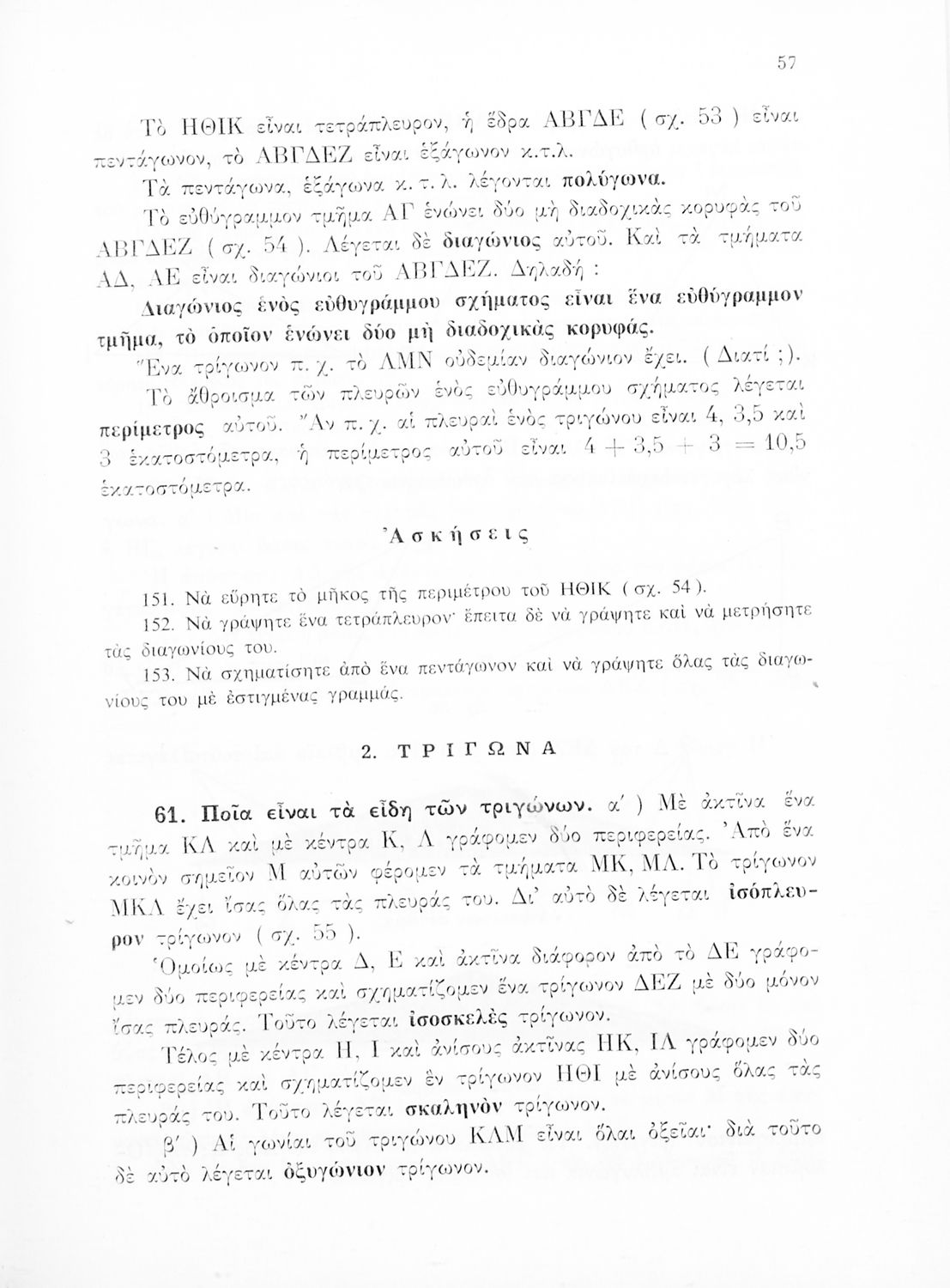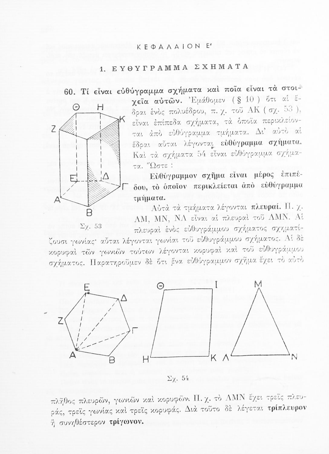 520 ## _aΣχολικό εγχειρίδιο των κατωτέρων τάξεων του Γυμνασίου για το μάθημα της Γεωμετρίας. Το εγχειρίδιο αποτελείται από την εισαγωγή, όπου αναλύονται οι βασικές έννοιες των ιδιοτήτων και γνωρισμάτων των γεωμετρικών σχημάτων, της επιπεδομετρίας δηλαδή των ευθειών, των γωνιών, των παραλλήλων, των κύκλων, των ευθύγραμμων σχημάτων και της στερεομετρίας, της θεματικής εκείνης που αναλύει τις θέσεις της ευθείας, του κυλίνδρου, του κώνου, των πολυέδρων κ.α.