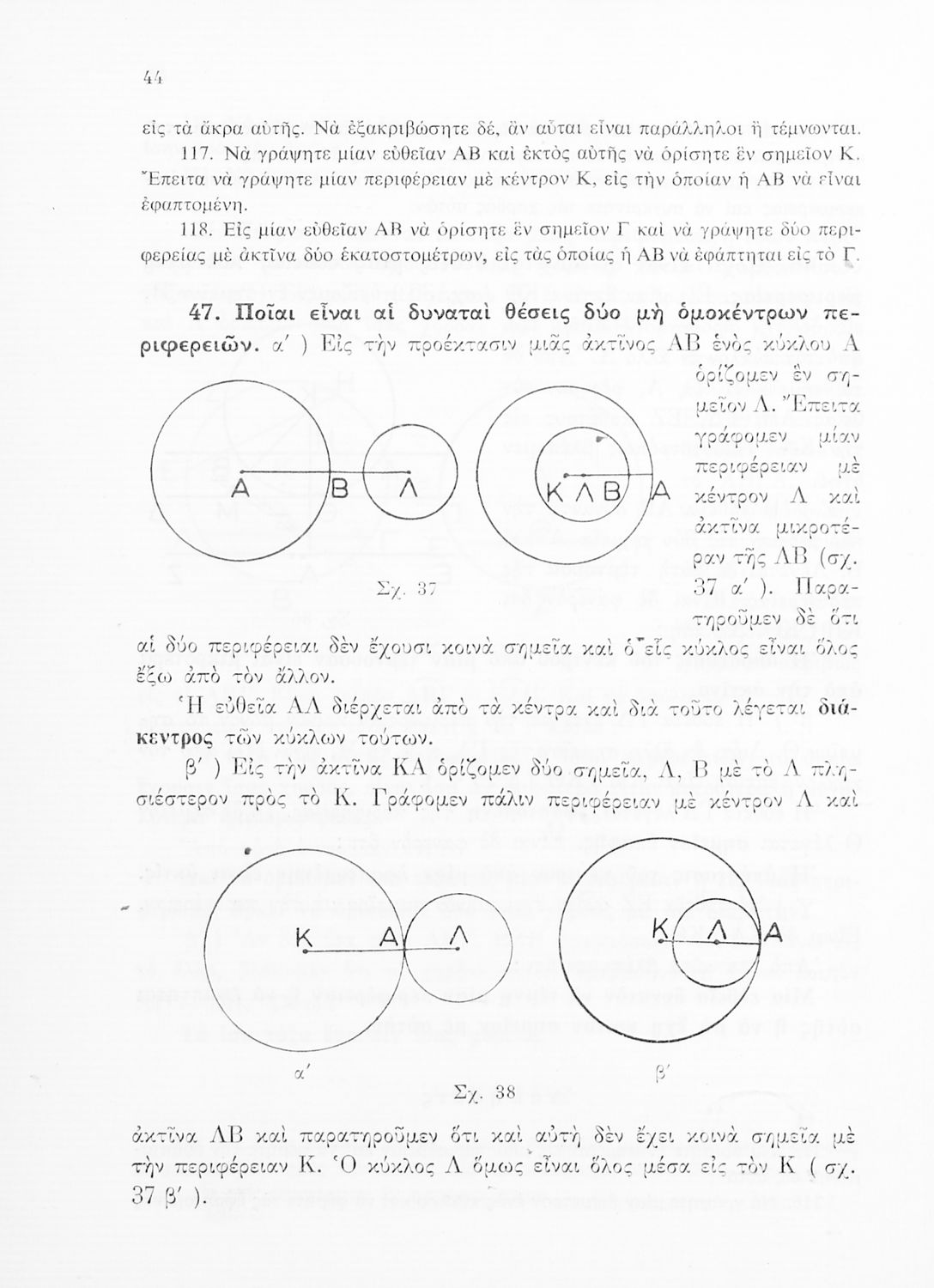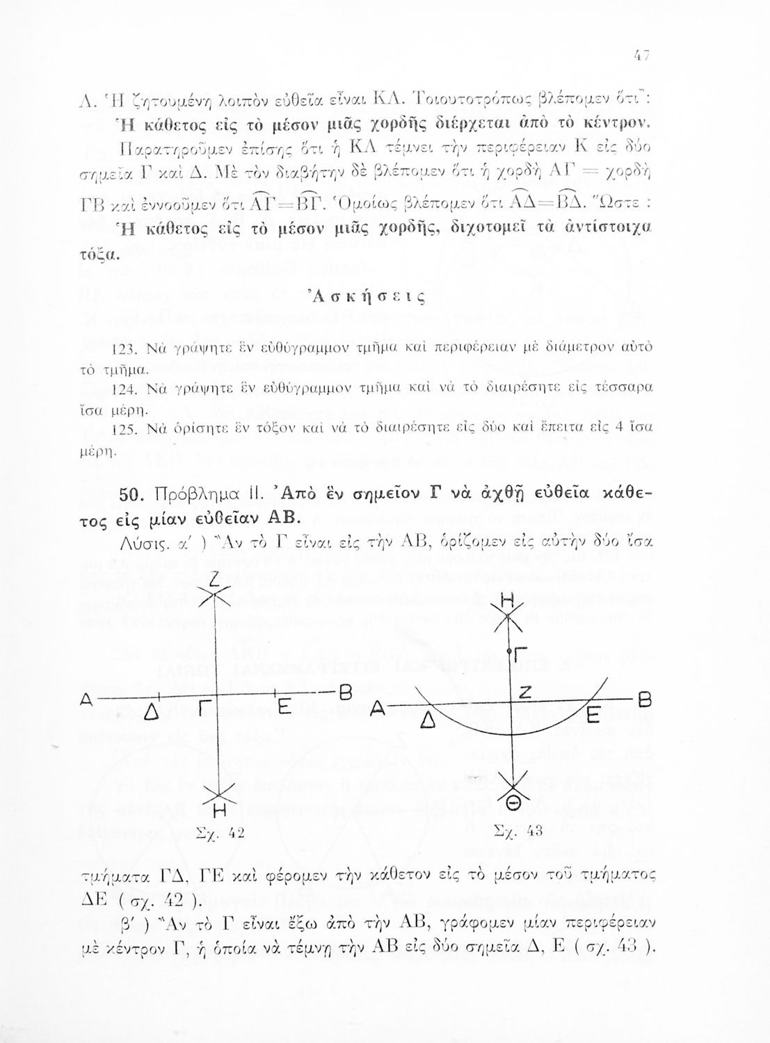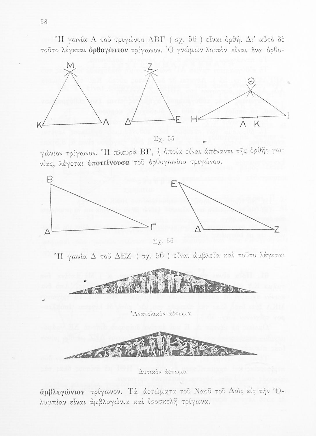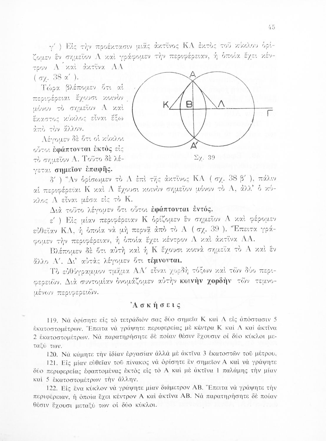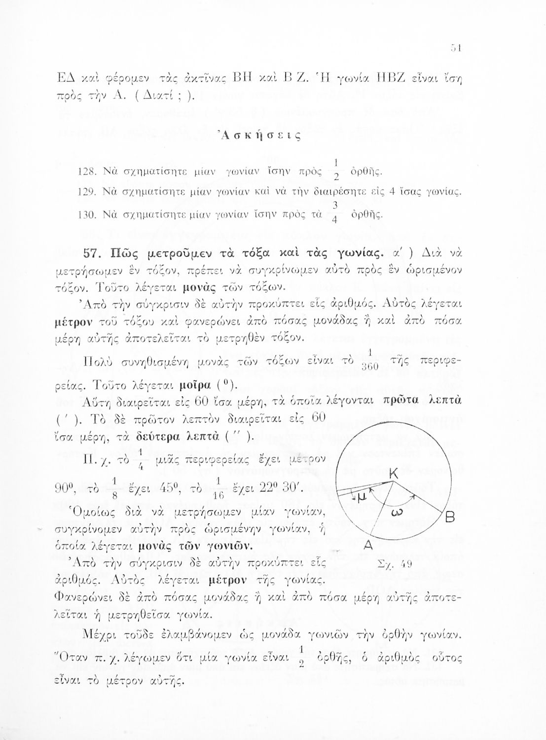 520 ## _aΣχολικό εγχειρίδιο των κατωτέρων τάξεων του Γυμνασίου για το μάθημα της Γεωμετρίας. Το εγχειρίδιο αποτελείται από την εισαγωγή, όπου αναλύονται οι βασικές έννοιες των ιδιοτήτων και γνωρισμάτων των γεωμετρικών σχημάτων, της επιπεδομετρίας δηλαδή των ευθειών, των γωνιών, των παραλλήλων, των κύκλων, των ευθύγραμμων σχημάτων και της στερεομετρίας, της θεματικής εκείνης που αναλύει τις θέσεις της ευθείας, του κυλίνδρου, του κώνου, των πολυέδρων κ.α.