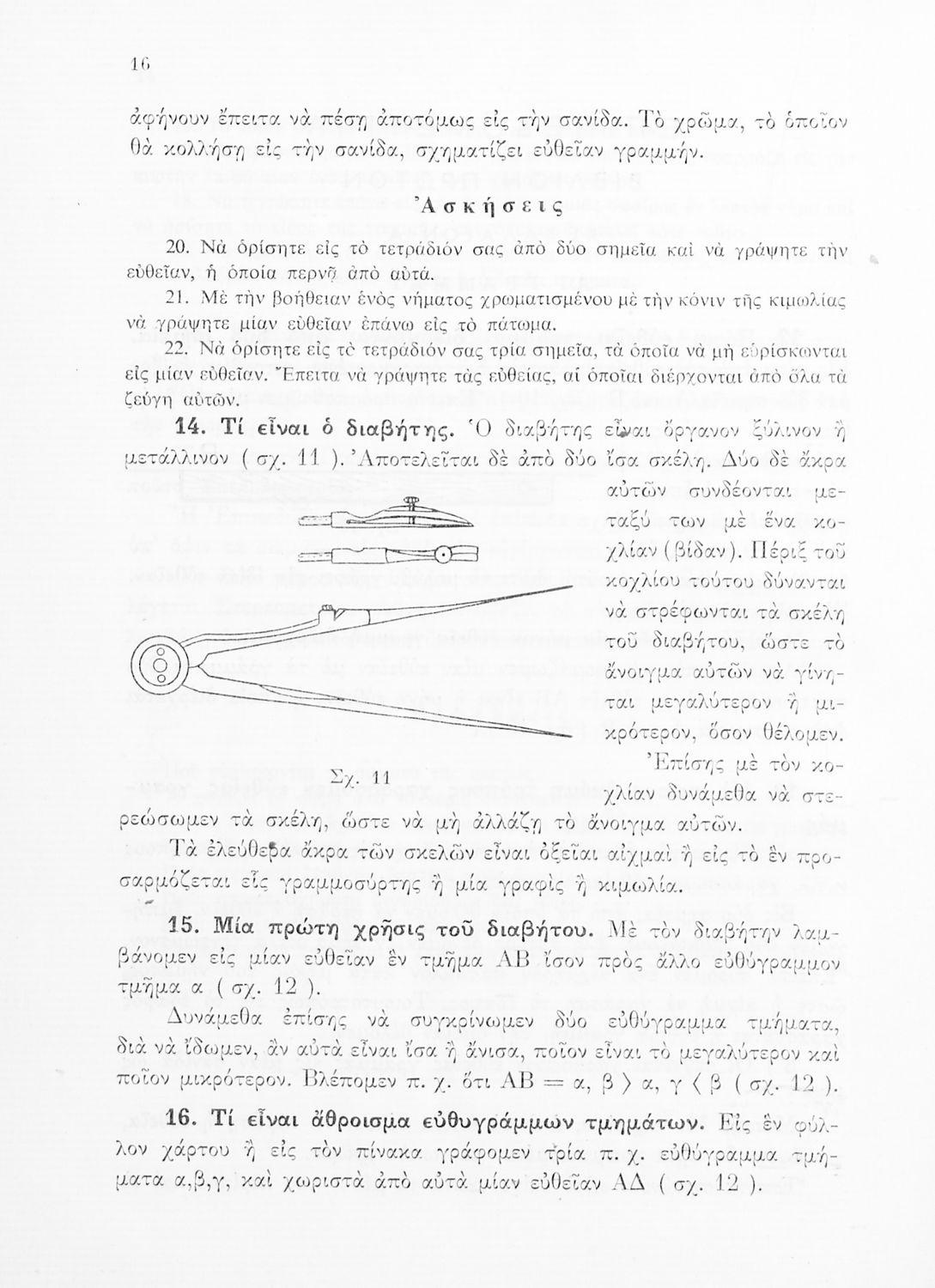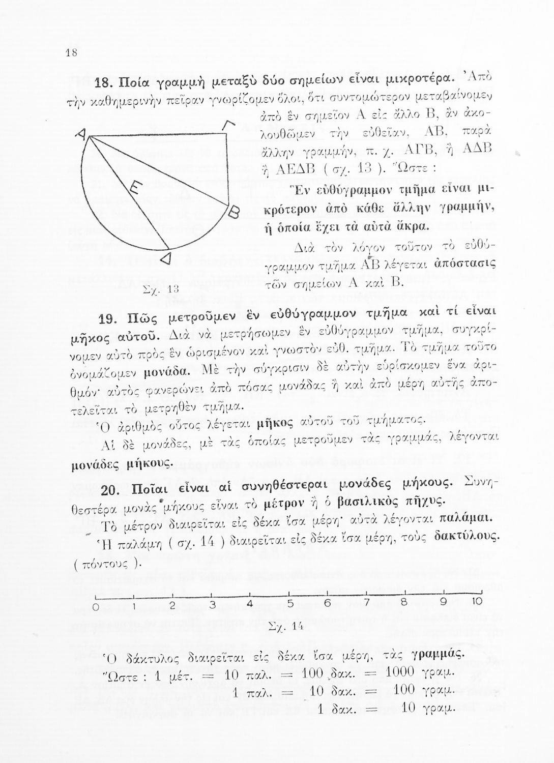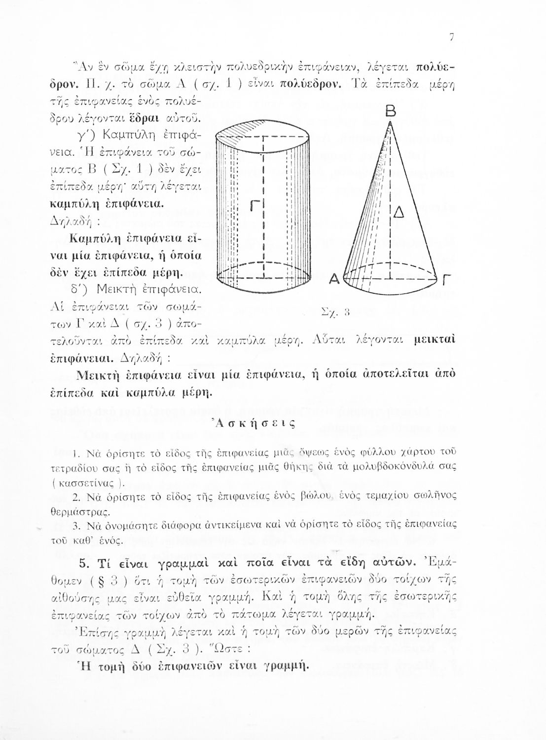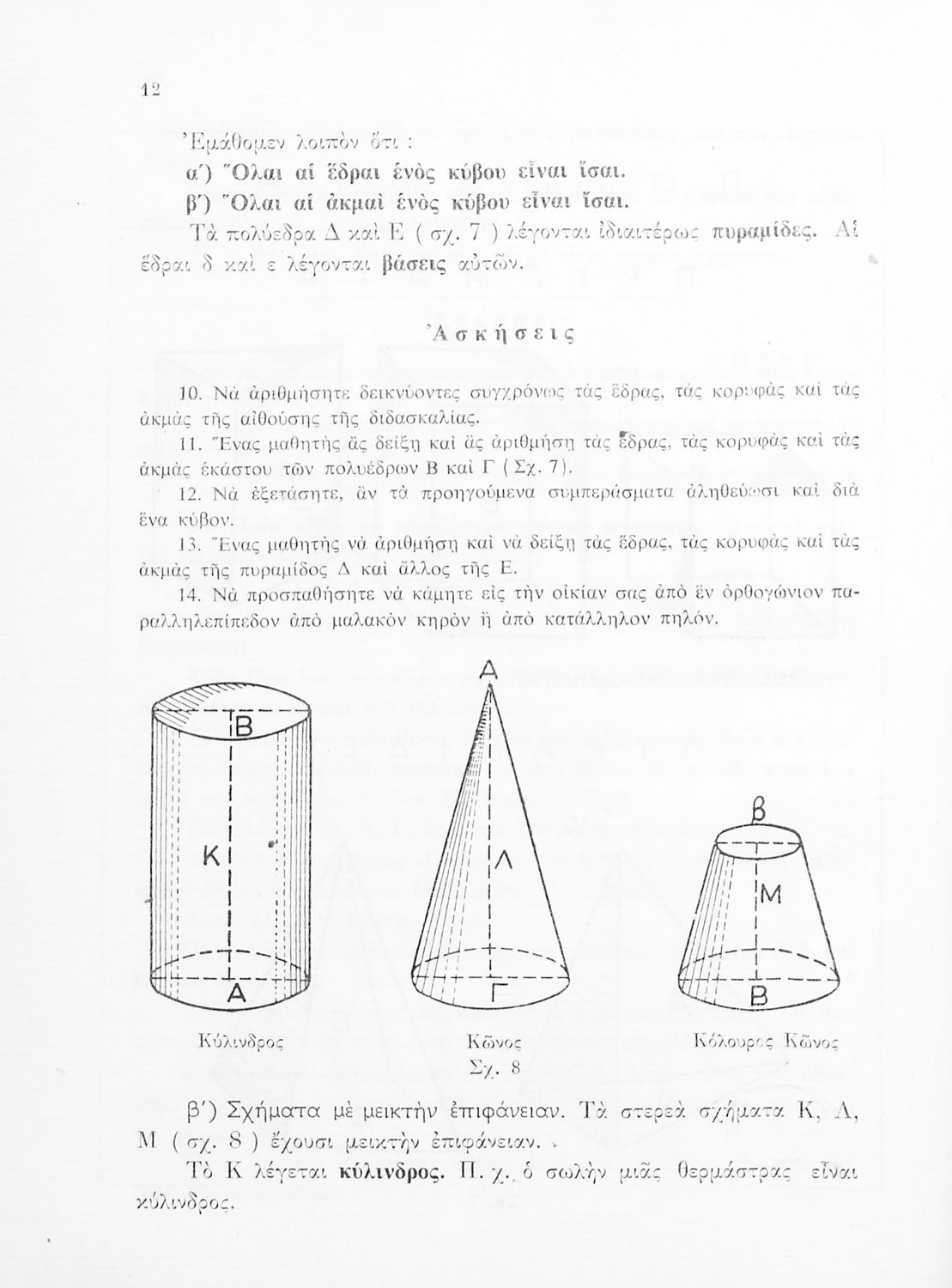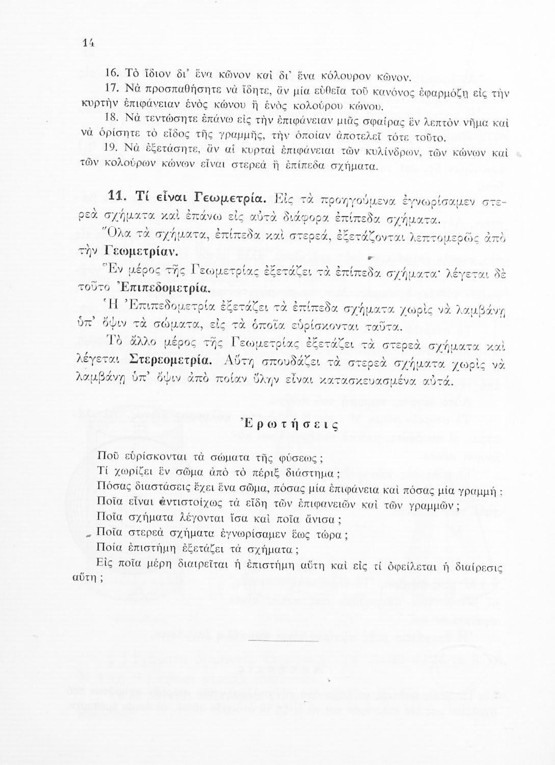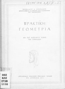 Σχολικό εγχειρίδιο των κατωτέρων τάξεων του Γυμνασίου για το μάθημα της Γεωμετρίας. Το εγχειρίδιο αποτελείται από την εισαγωγή, όπου αναλύονται οι βασικές έννοιες των ιδιοτήτων και γνωρισμάτων των γεωμετρικών σχημάτων, της επιπεδομετρίας δηλαδή των ευθειών, των γωνιών, των παραλλήλων, των κύκλων, των ευθύγραμμων σχημάτων και της στερεομετρίας, της θεματικής εκείνης που αναλύει τις θέσεις της ευθείας, του κυλίνδρου, του κώνου, των πολυέδρων κ.α.