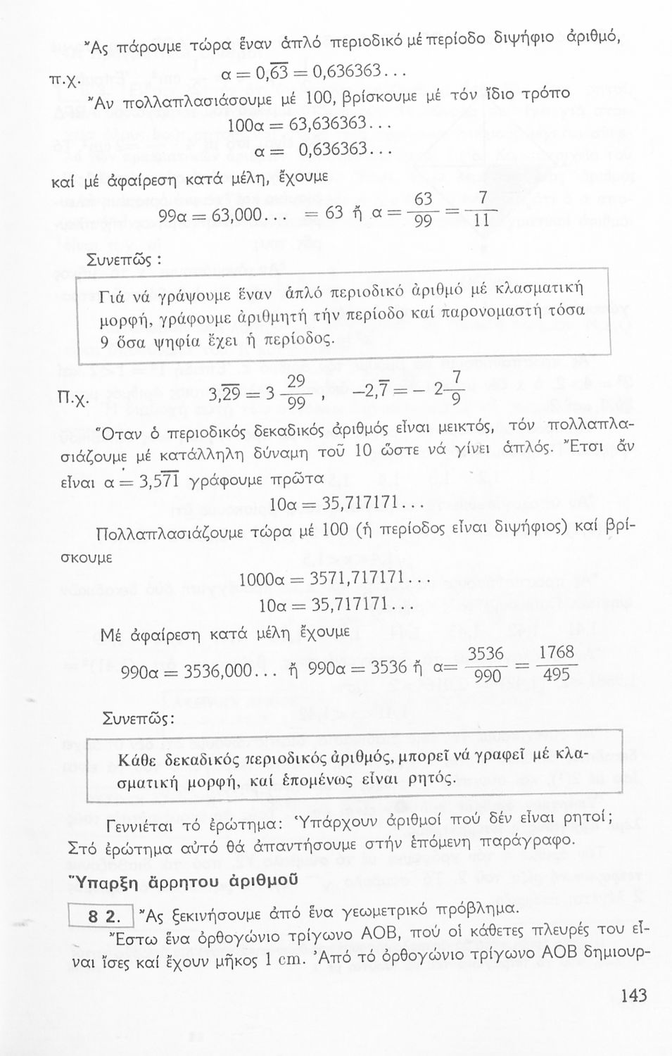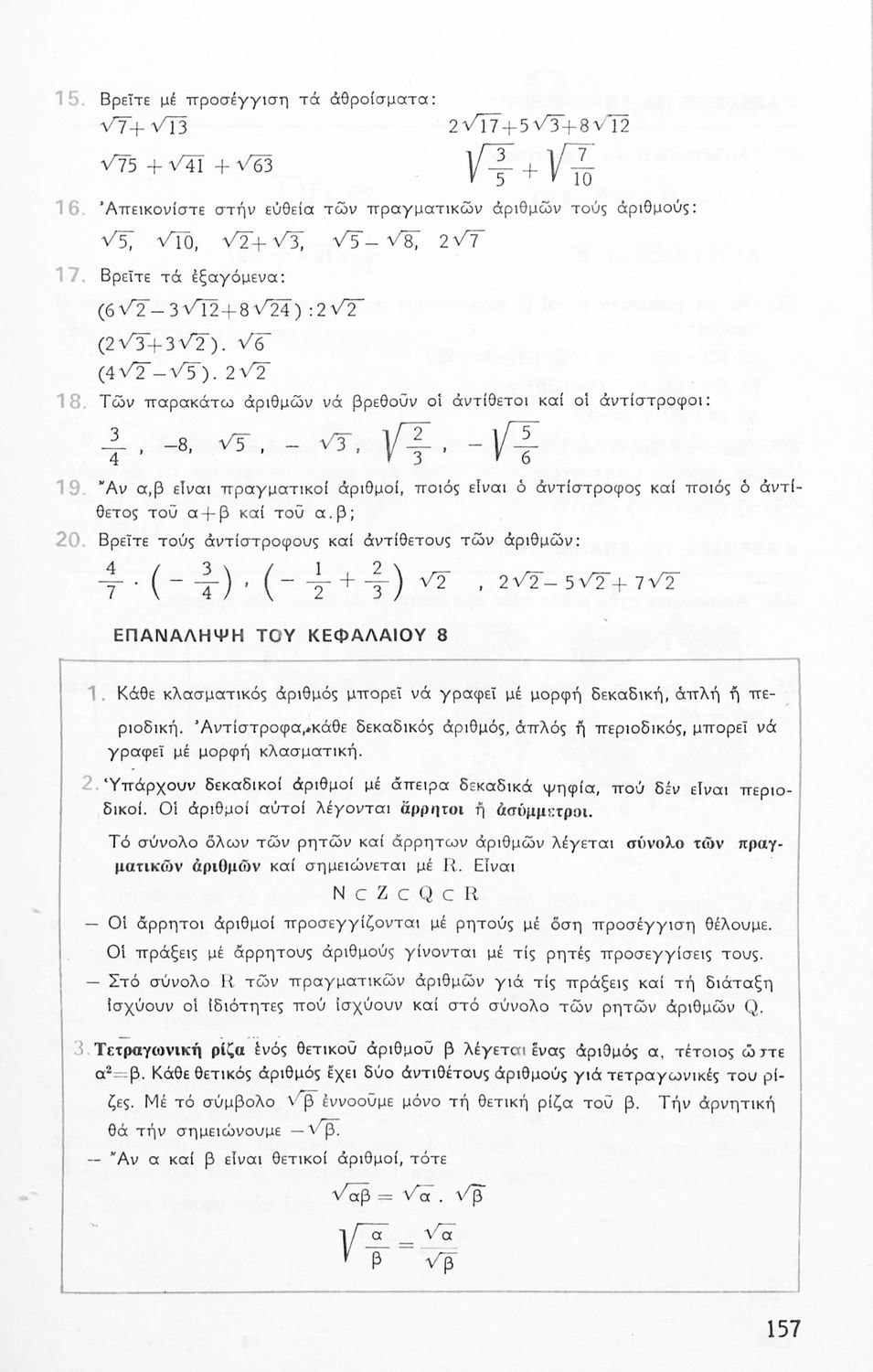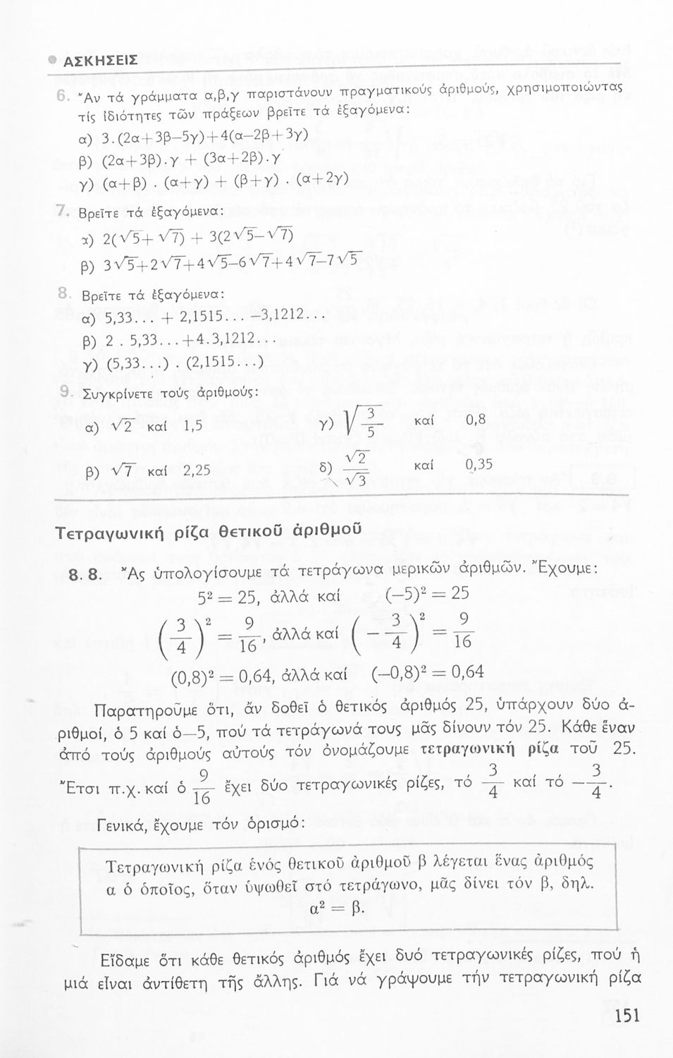 Σχολικό εγχειρίδιο Αριθμητικής για τις Α΄, Β΄, Γ΄ Γυμνασίου που είναι χωρισμένο σε ορισμούς και ασκήσεις και εστιάζει στις ιδιότητες των αριθμητικών πράξεων, τα κλάσματα και την τετραγωνική ρίζα.