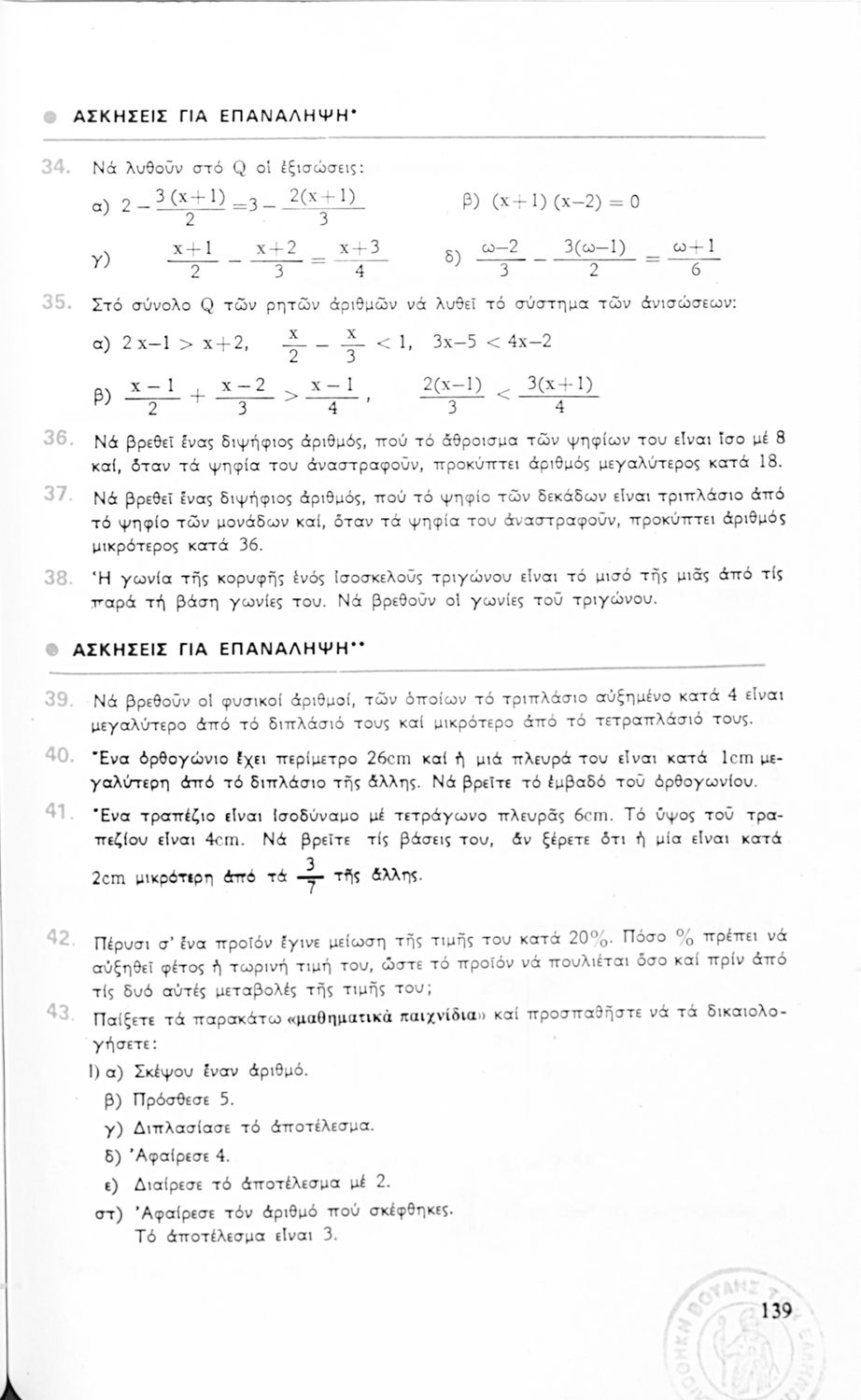 Σχολικό εγχειρίδιο Άλγεβρας Γυμνασίου που περιέχει θεωρία και ασκήσεις. Ο συγγραφέας ήταν υφηγητής στο Εθνικό Πανεπιστήμιο.
