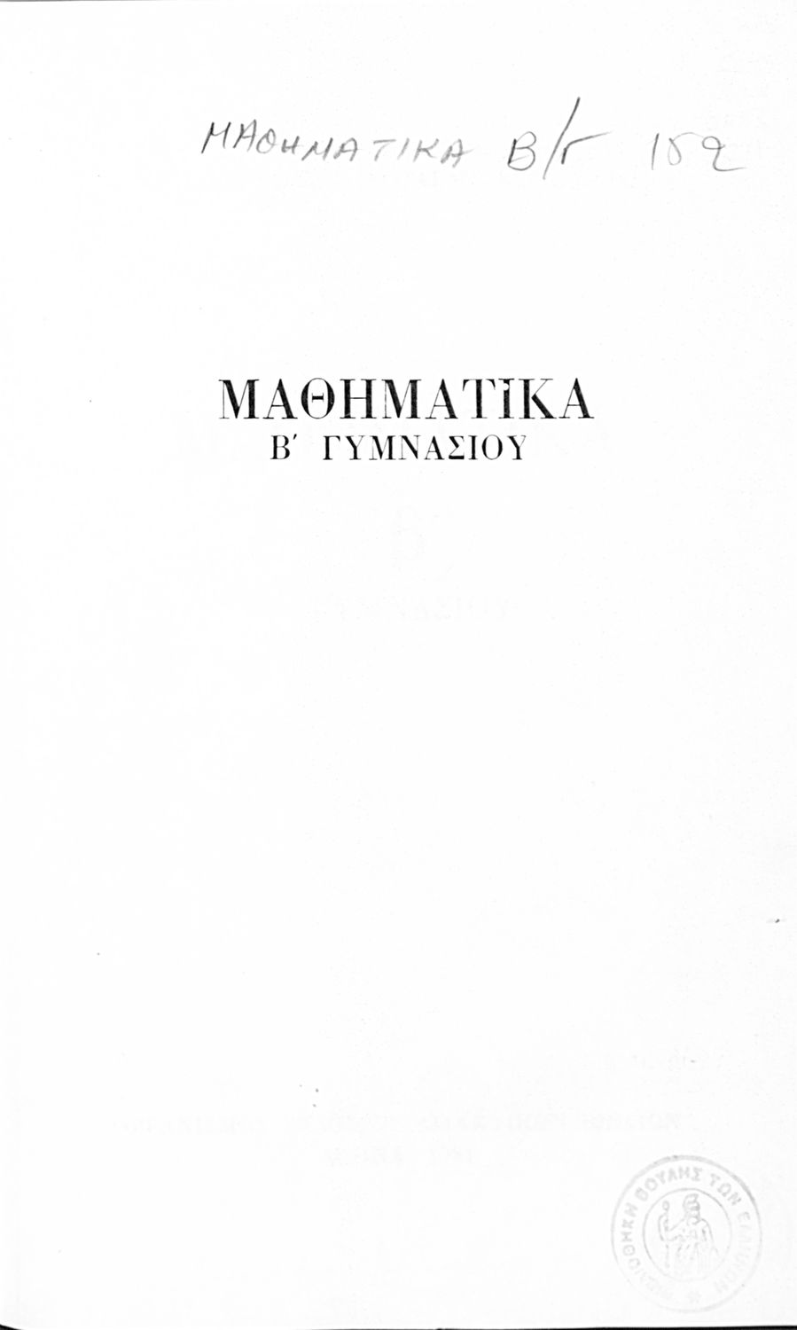 Βαθμίδα εκπαίδευσης: Δευτεροβάθμια Τάξη: Β' Γυμνασίου Μάθημα: Μαθηματικά Γλώσσα: Δημοτική Παρουσίαση περιεχομένου: Σχολικό εγχειρίδιο Μαθηματικών Β΄ Γυμνασίου που περιλαμβάνει Άλγεβρα, Γεωμετρία και Τριγωνομετρία. |