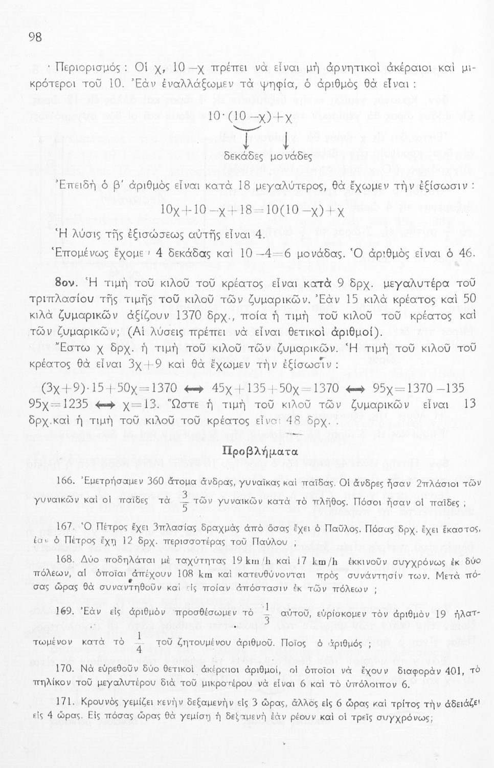 Βαθμίδα εκπαίδευσης: Δευτεροβάθμια Τάξη: Β' Γυμνασίου Μάθημα: Μαθηματικά Γλώσσα: Απλή καθαρεύουσα Παρουσίαση περιεχομένου: Σχολικό Εγχειρίδιο Μαθηματικών Β' Γυμνασίου που περιλαμβάνει αριθμητική με έμφαση στα σύνολα, τις μεθόδους υπολογισμού τόκων και επιτοκίων, και την μέθοδο των τριών, και γεωμετρία με έμφαση στα γεωμετρικά σχήματα και σώματα και τρόπους υπολογισμού τους. |