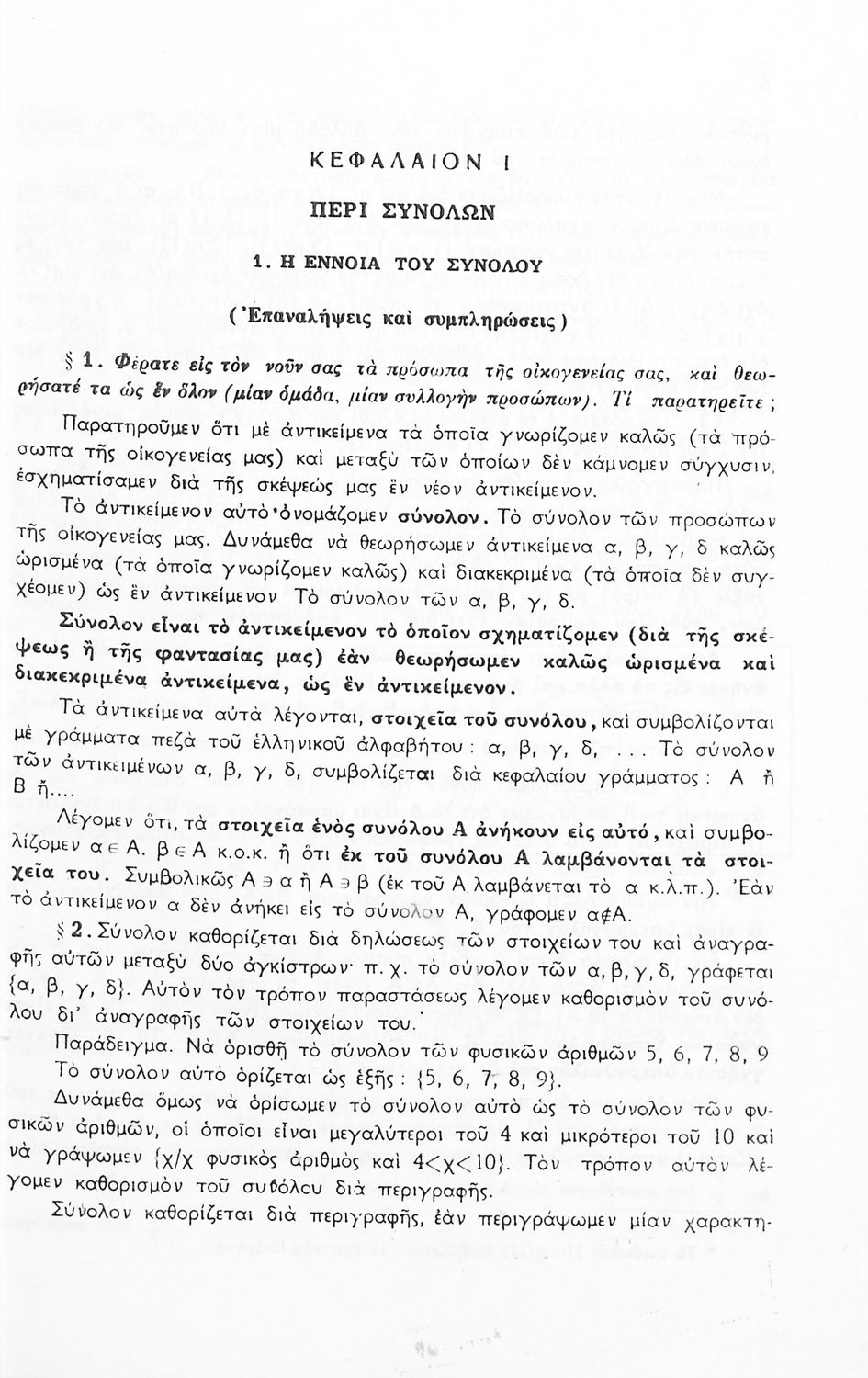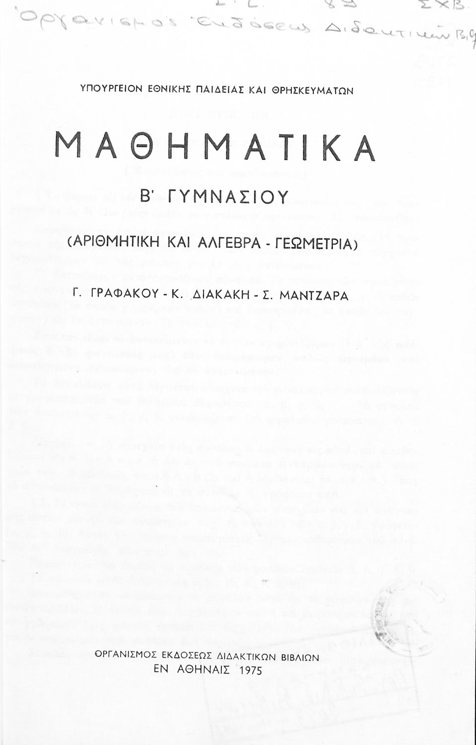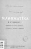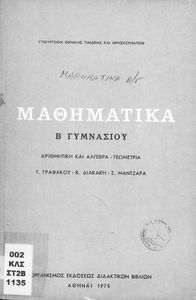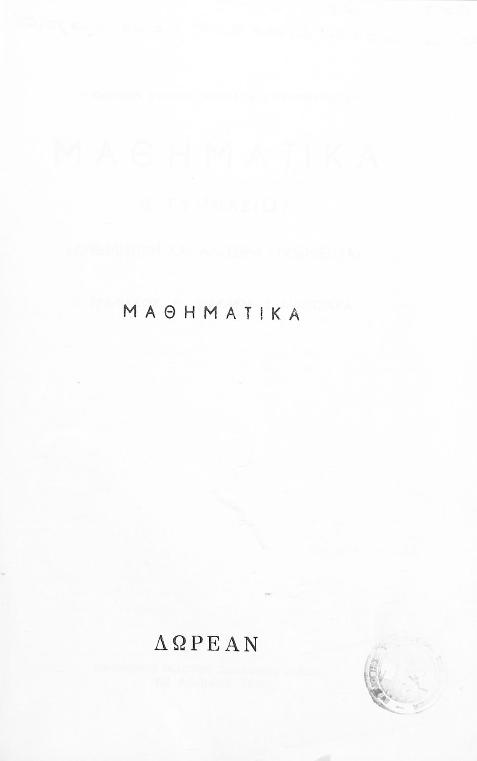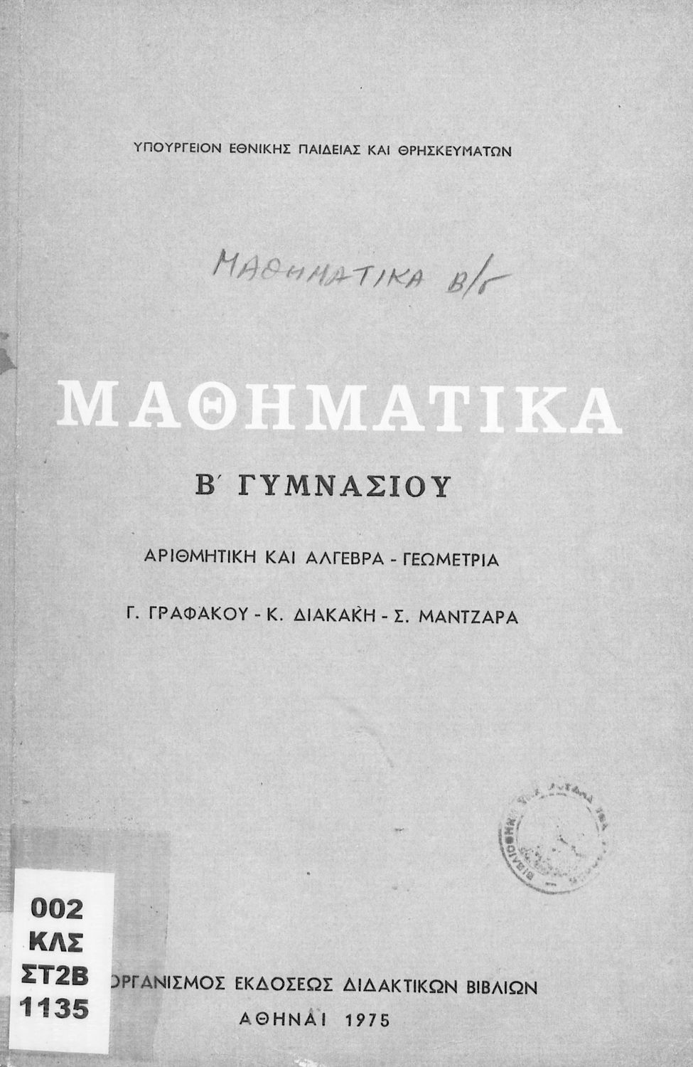 Βαθμίδα εκπαίδευσης: Δευτεροβάθμια Τάξη: Β' Γυμνασίου Μάθημα: Μαθηματικά Γλώσσα: Καθαρεύουσα Παρουσίαση περιεχομένου: Σχολικό Εγχειρίδιο Μαθηματικών Β' Γυμνασίου που περιλαμβάνει αριθμητική με έμφαση στα σύνολα, τις μεθόδους υπολογισμού τόκων και επιτοκίων, και την μέθοδο των τριών, και γεωμετρία με έμφαση στα γεωμετρικά σχήματα και σώματα και τρόπους υπολογισμού τους. |