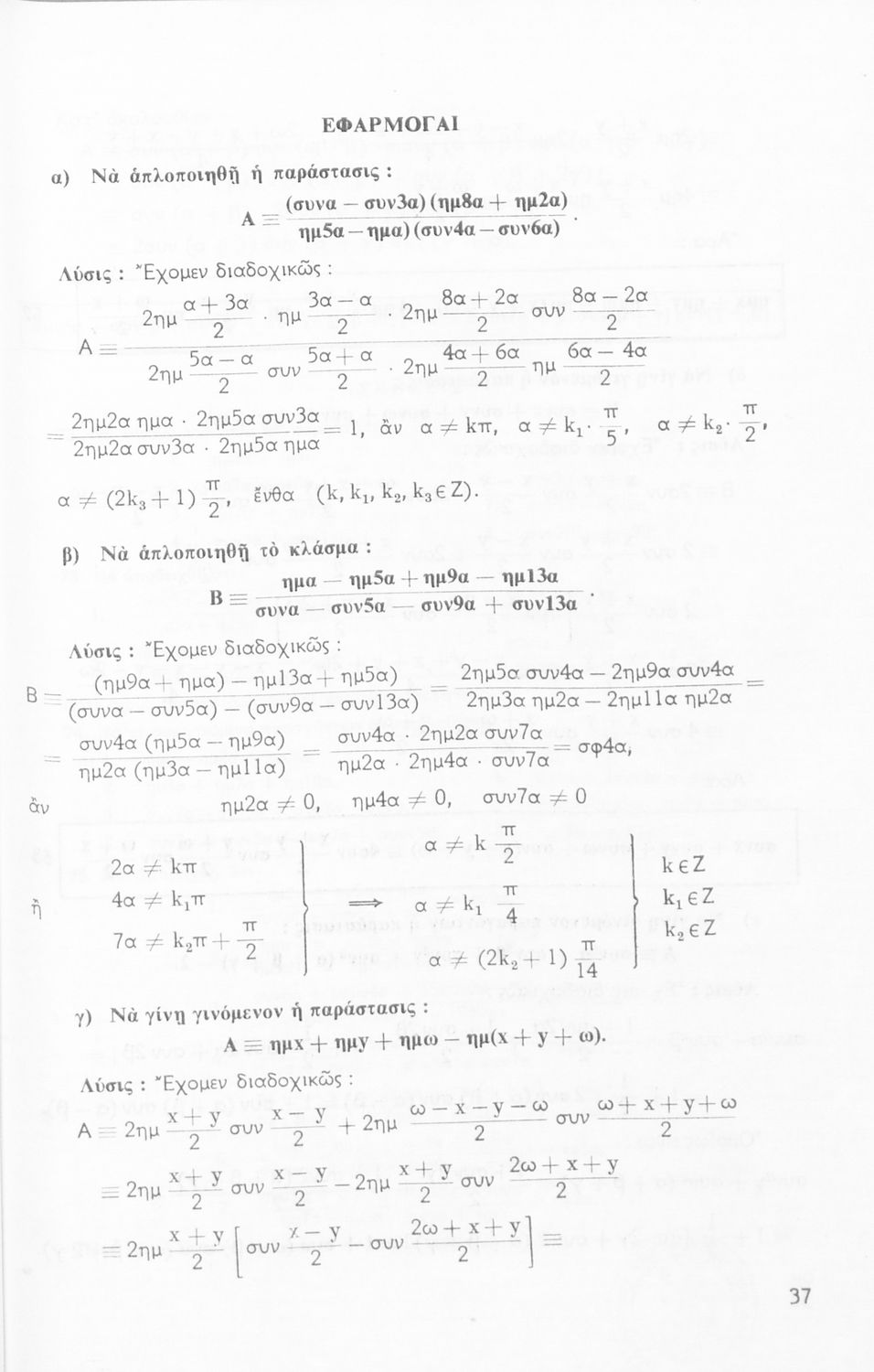 Σχολικό εγχειρίδιο Μαθηματικών για την Ε΄ Γυμνασίου, χωρισμένο σε προβλήματα, εφαρμογές και ασκήσεις, που εστιάζει στην Τριγωνομετρία. Φέρει το σύμβολο της δικτατορίας.