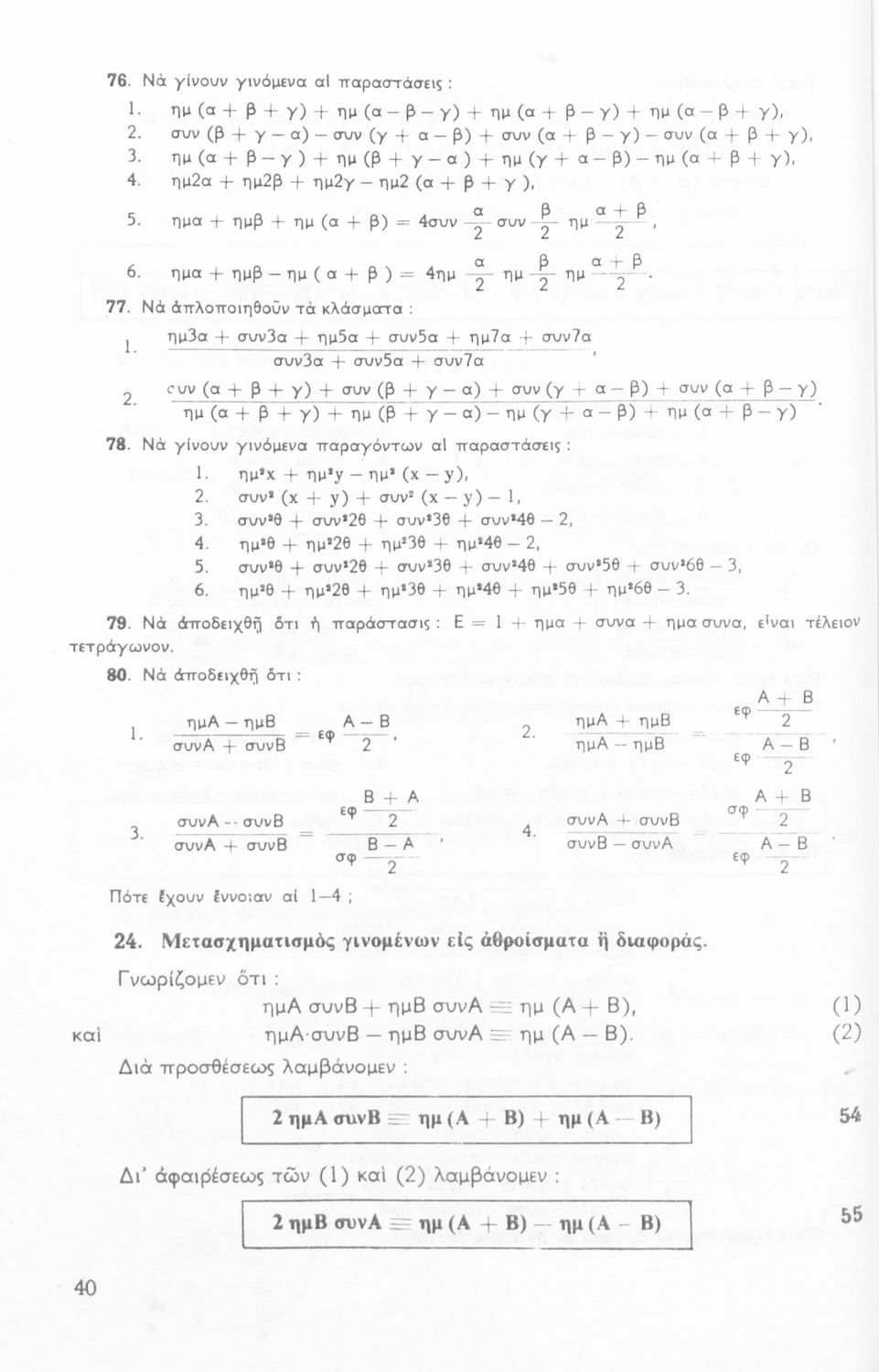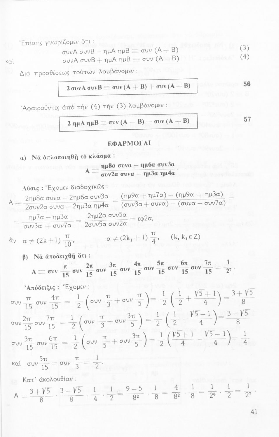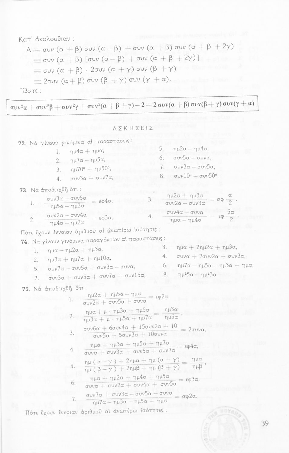 Σχολικό εγχειρίδιο Μαθηματικών για την Ε΄ Γυμνασίου, χωρισμένο σε προβλήματα, εφαρμογές και ασκήσεις, που εστιάζει στην Τριγωνομετρία. Φέρει το σύμβολο της δικτατορίας.
