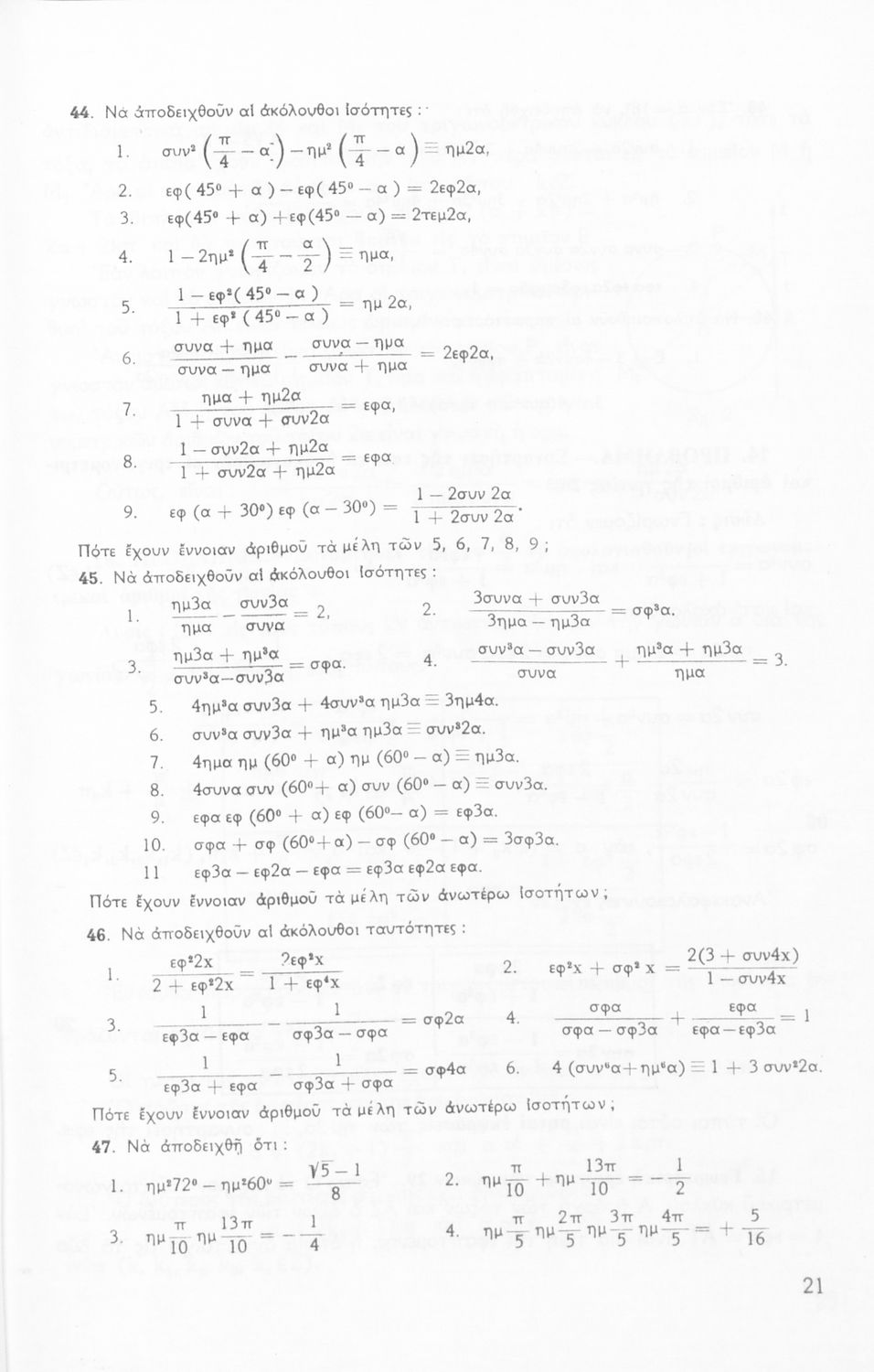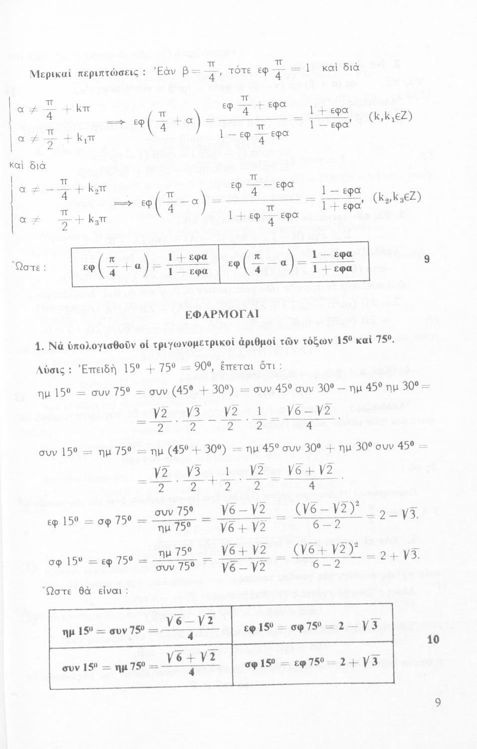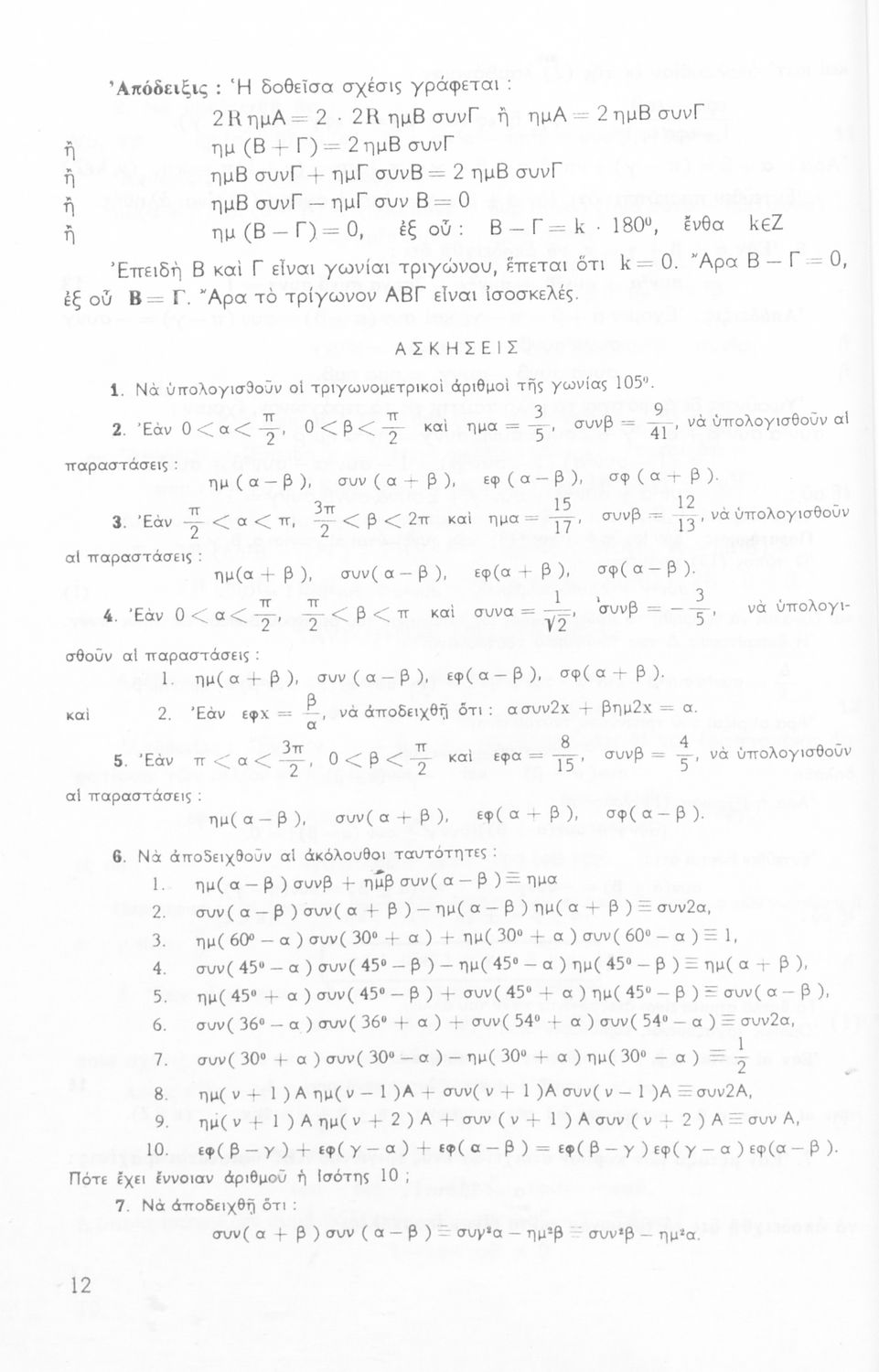 Σχολικό εγχειρίδιο Μαθηματικών για την Ε΄ Γυμνασίου, χωρισμένο σε προβλήματα, εφαρμογές και ασκήσεις, που εστιάζει στην Τριγωνομετρία. Φέρει το σύμβολο της δικτατορίας.