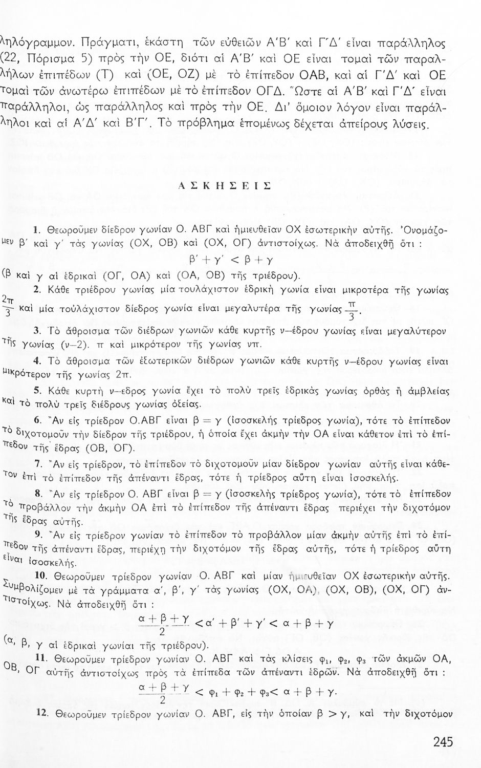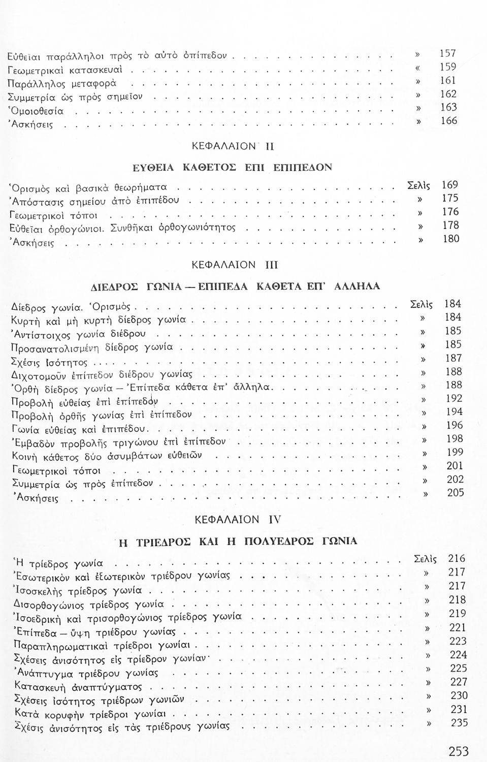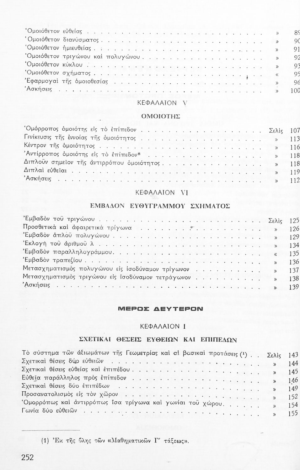 Σχολικό εγχειρίδιο Γεωμετρίας για τις Δ΄, Ε΄ και ΣΤ΄ Γυμνασίου που περιλαμβάνει αξιώματα, θεωρήματα και κατασκευές και είναι χωρισμένο σε γεωμετρία επιπέδου και γεωμετρία χώρου.