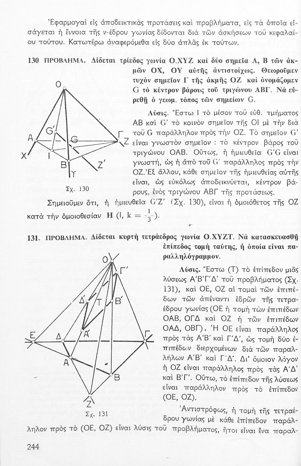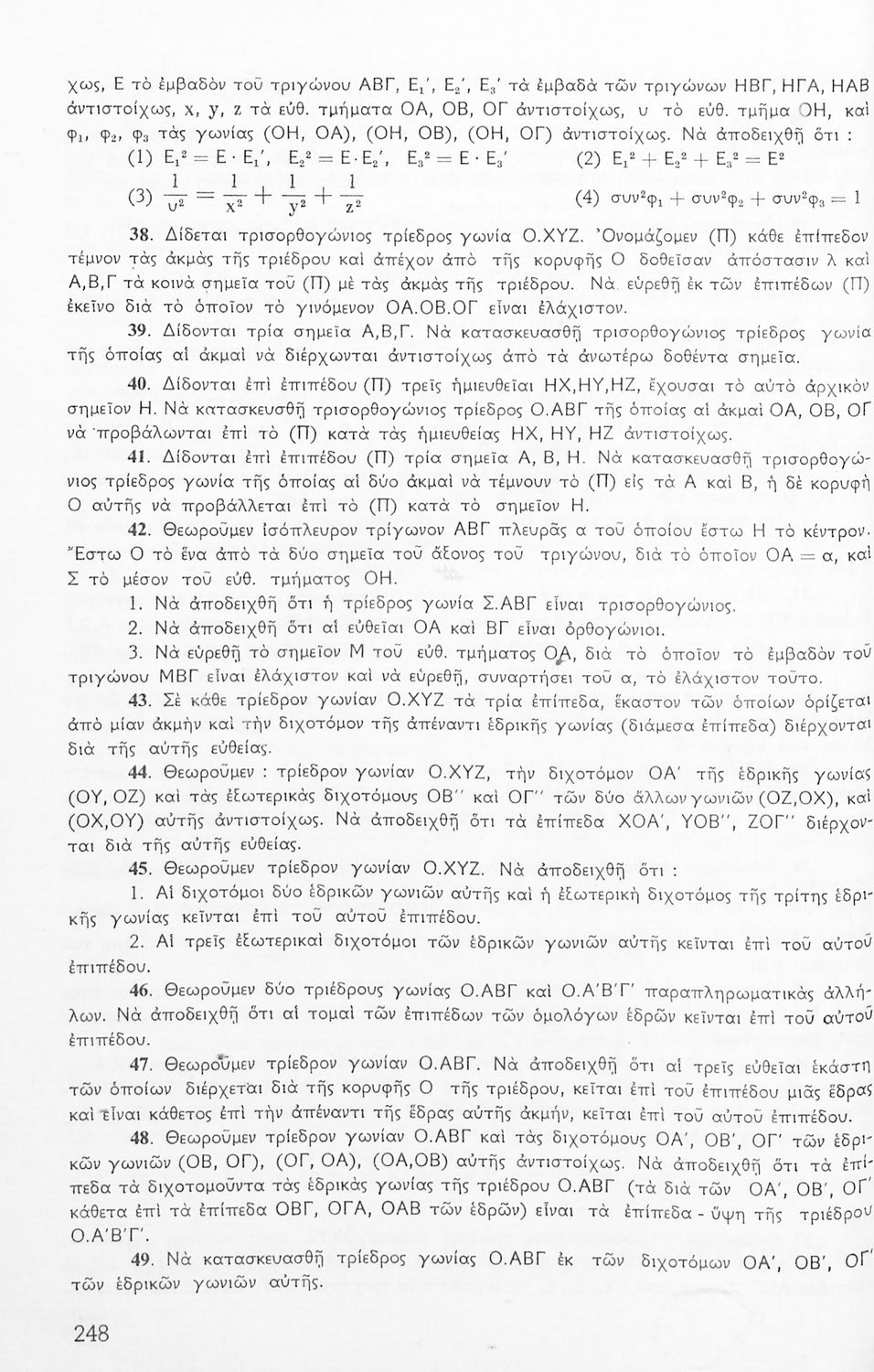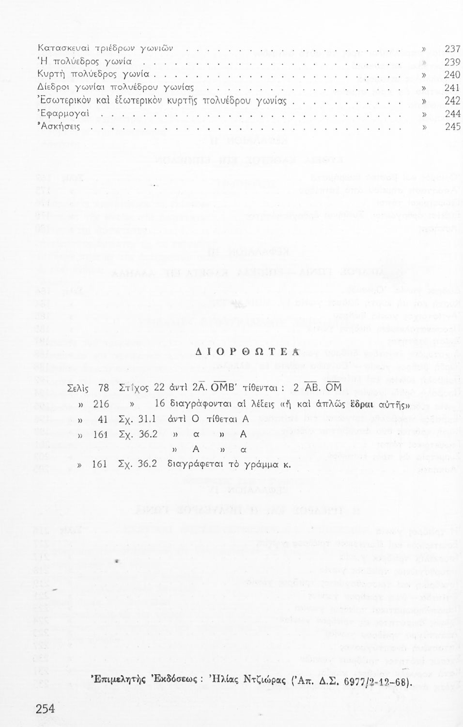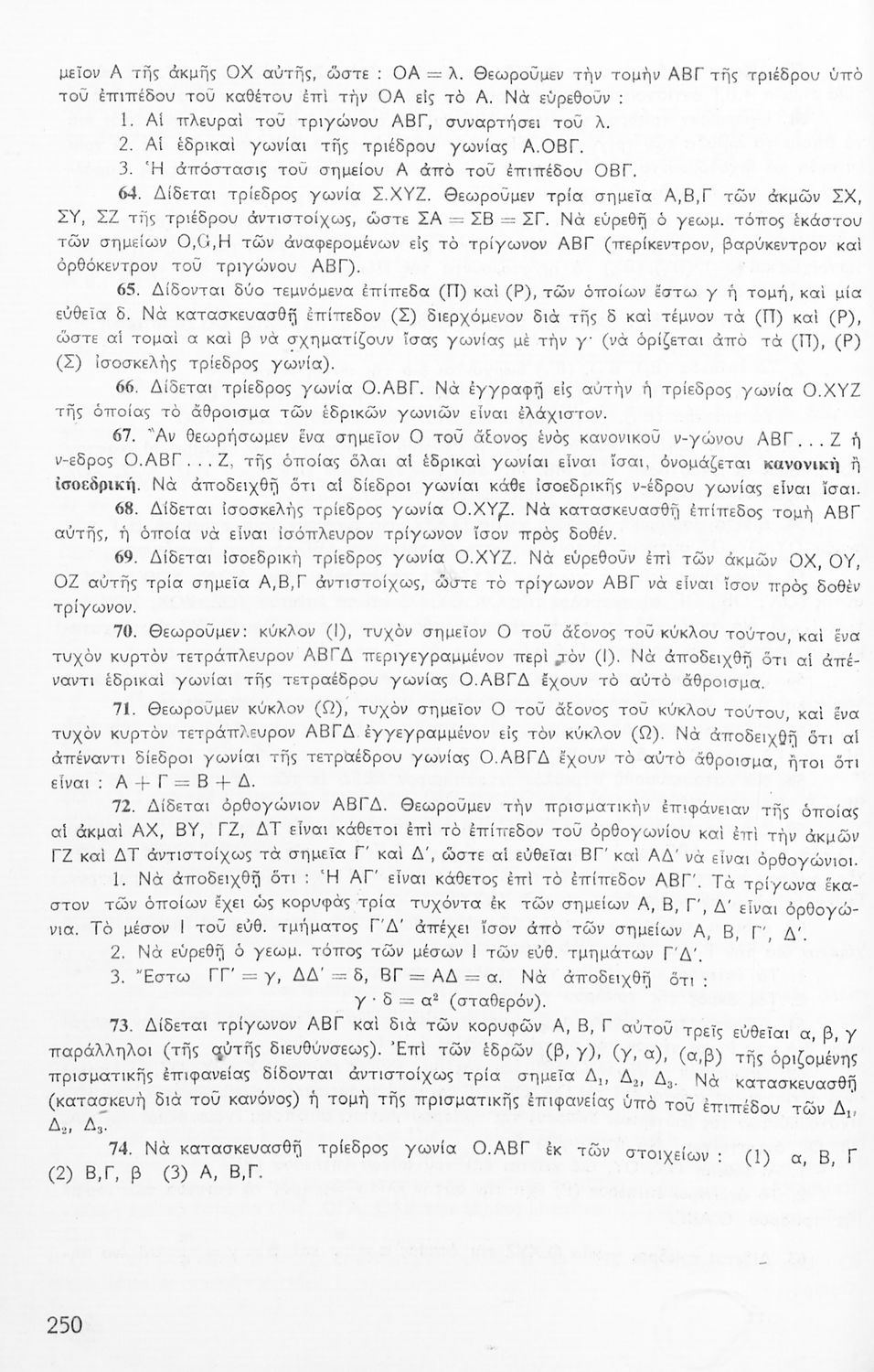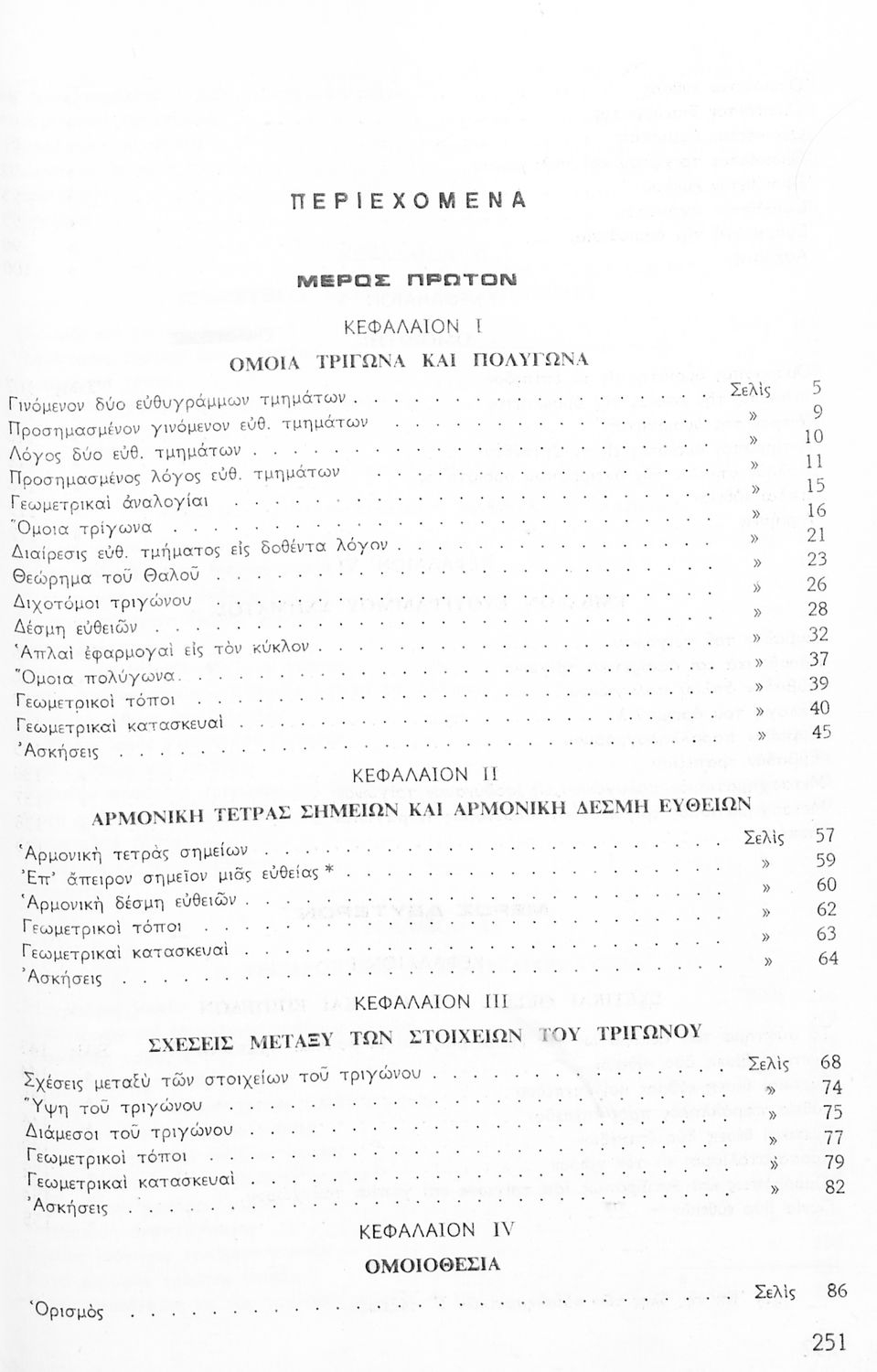 Σχολικό εγχειρίδιο Γεωμετρίας για τις Γ΄, Δ΄, Ε΄, ΣΤ΄ Γυμνασίου που περιλαμβάνει θεωρία και ασκήσεις και είναι χωρισμένο σε Επιπεδομετρία και Στερεομετρία. Φέρει το σύμβολο της δικτατορίας.