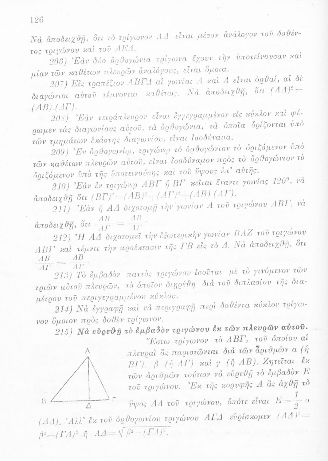 Σχολικό εγχειρίδιο Γεωμετρίας Γυμνασίου που είναι χωρισμένο σε θεωρήματα και ασκήσεις και εστιάζει στα βασικά θεωρήματα και ιδιότητες των γεωμετρικών σχημάτων. .