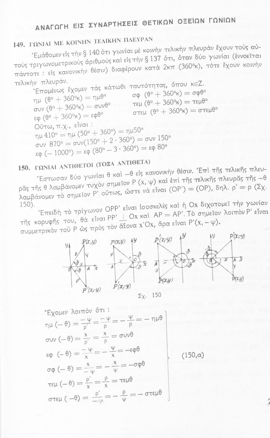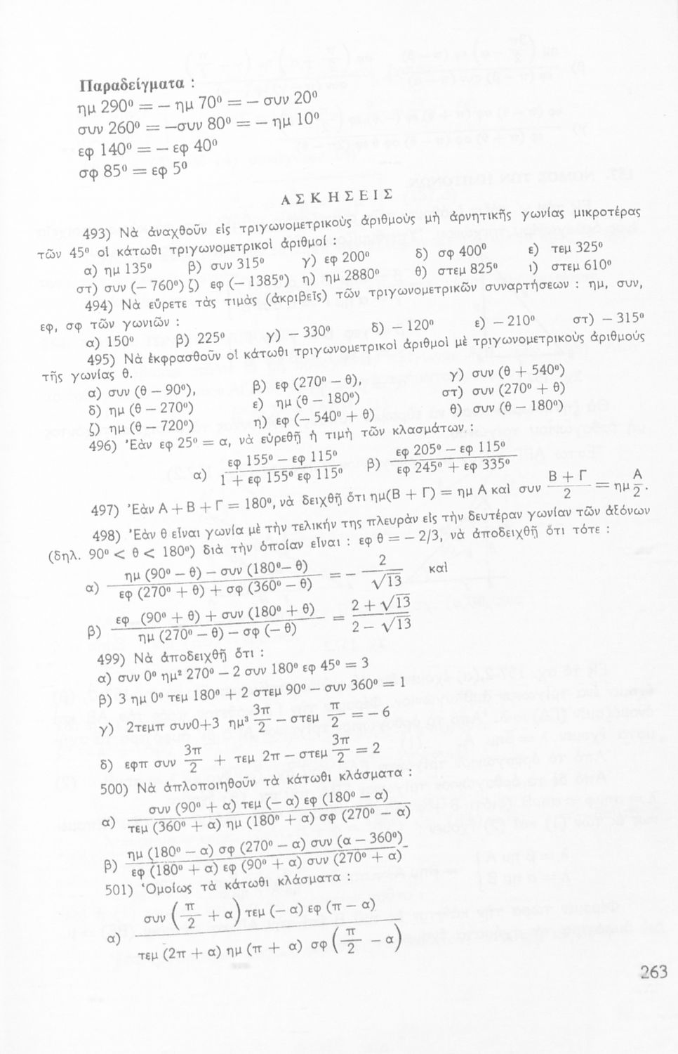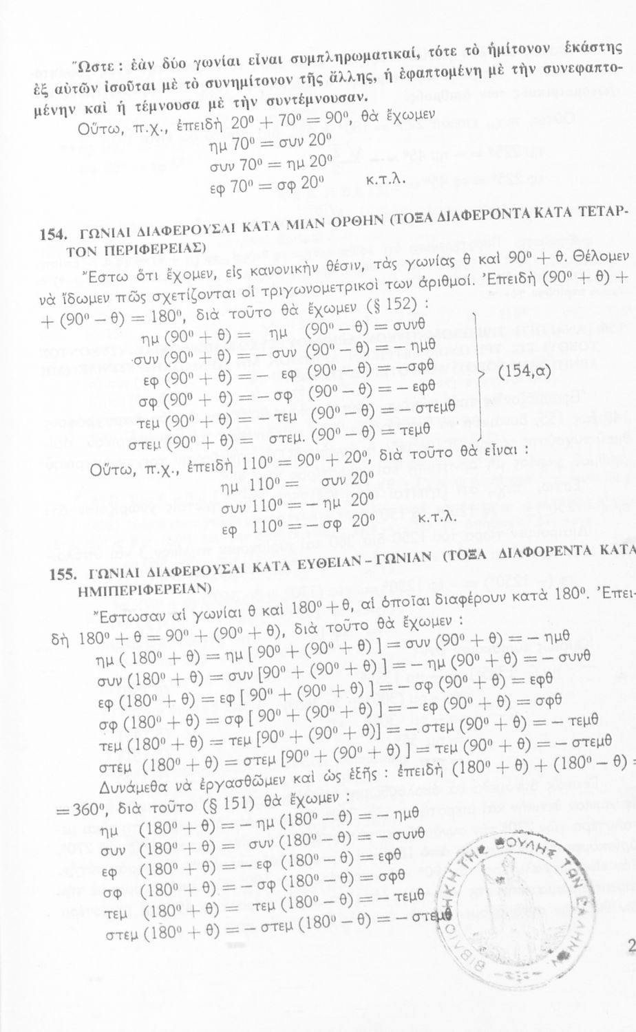 Σχολικό εγχειρίδιο Μαθηματικών για την Ε΄ Γυμνασίου, χωρισμένο σε προβλήματα, εφαρμογές και ασκήσεις, που εστιάζει στην Τριγωνομετρία. Φέρει το σύμβολο της δικτατορίας.