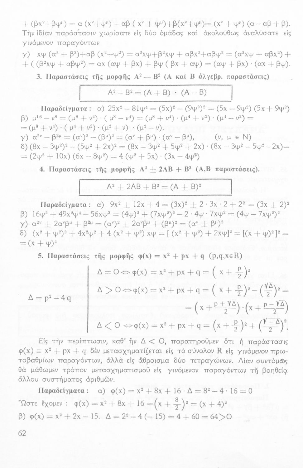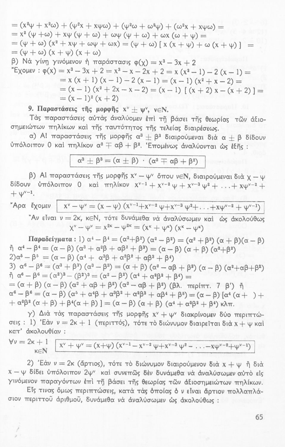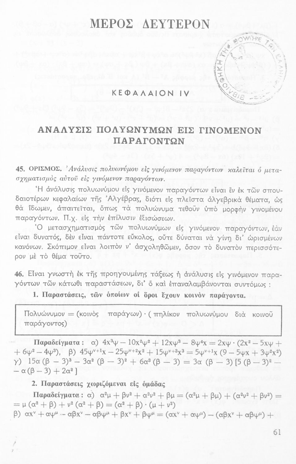 Βαθμίδα εκπαίδευσης: Δευτεροβάθμια Τάξη: Δ' Γυμνασίου Μάθημα: Μαθηματικά Γλώσσα: Καθαρεύουσα Παρουσίαση περιεχομένου: Σχολικό εγχειρίδιο για την Δ΄ Γυμνασίου για το μάθημα των Μαθηματικών. Το εγχειρίδιο περιλαμβάνει στοιχεία λογικής, τα σύνολα των αριθμών, την ανάλυση των πολυωνύμων στο γινόμενο των παραγόντων, τα στοιχεία περιγραφικής στατιστικής κ.α. |