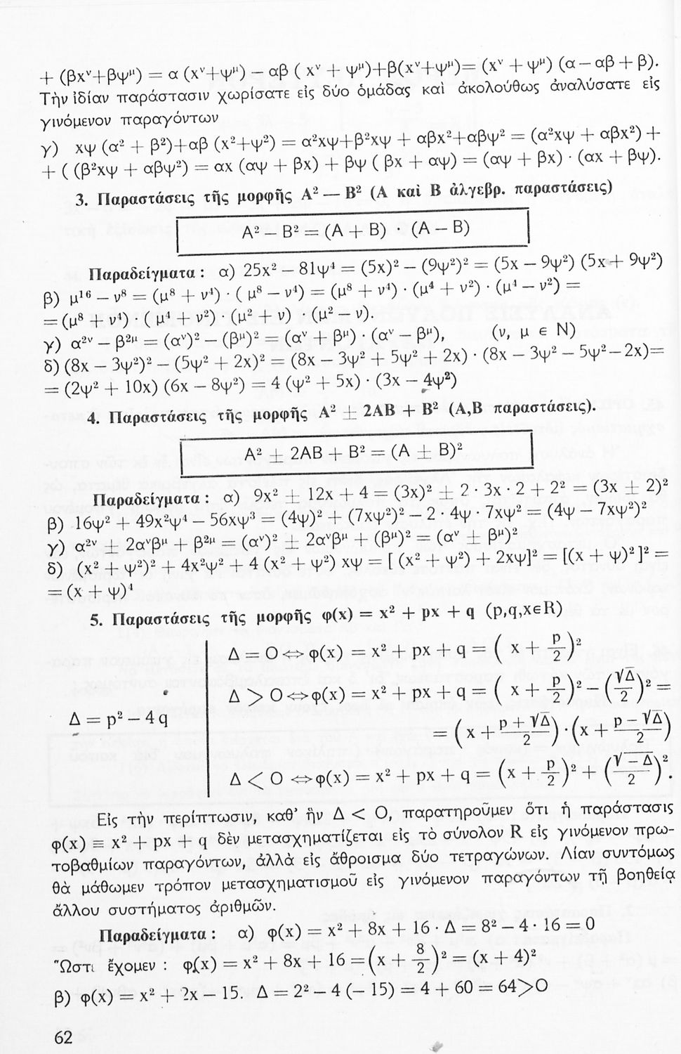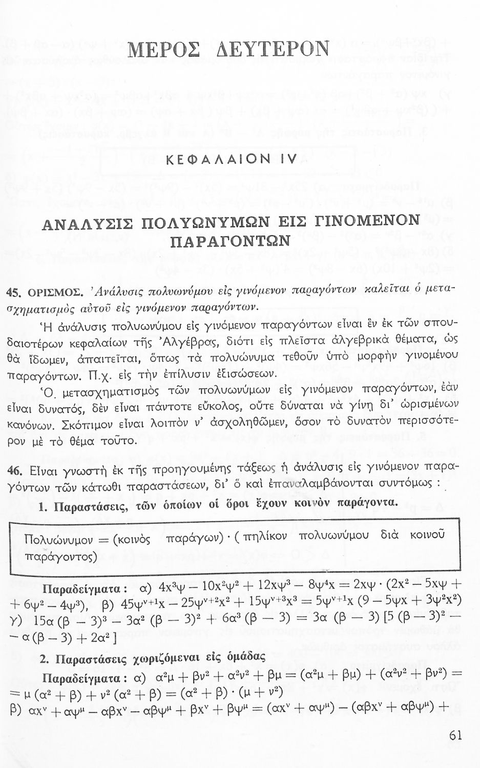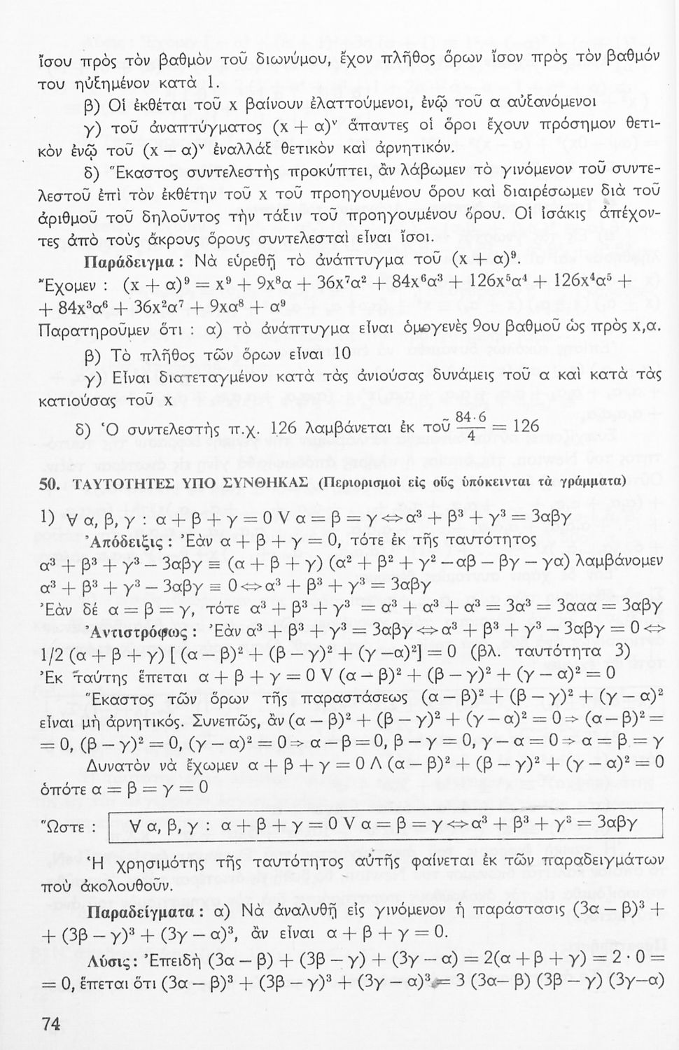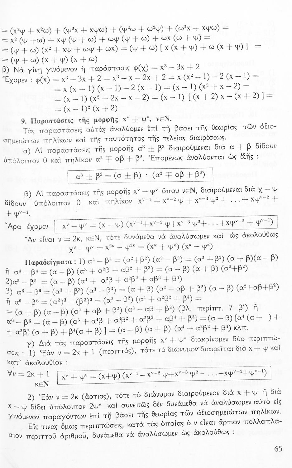 Σχολικό εγχειρίδιο Μαθηματικών Γυμνασίου που είναι χωρισμένο σε θεωρήματα, παραδείγματα και ασκήσεις και περιλαμβάνει στοιχεία Ανώτερης Άλγεβρας και Μαθηματικής Ανάλυσης.