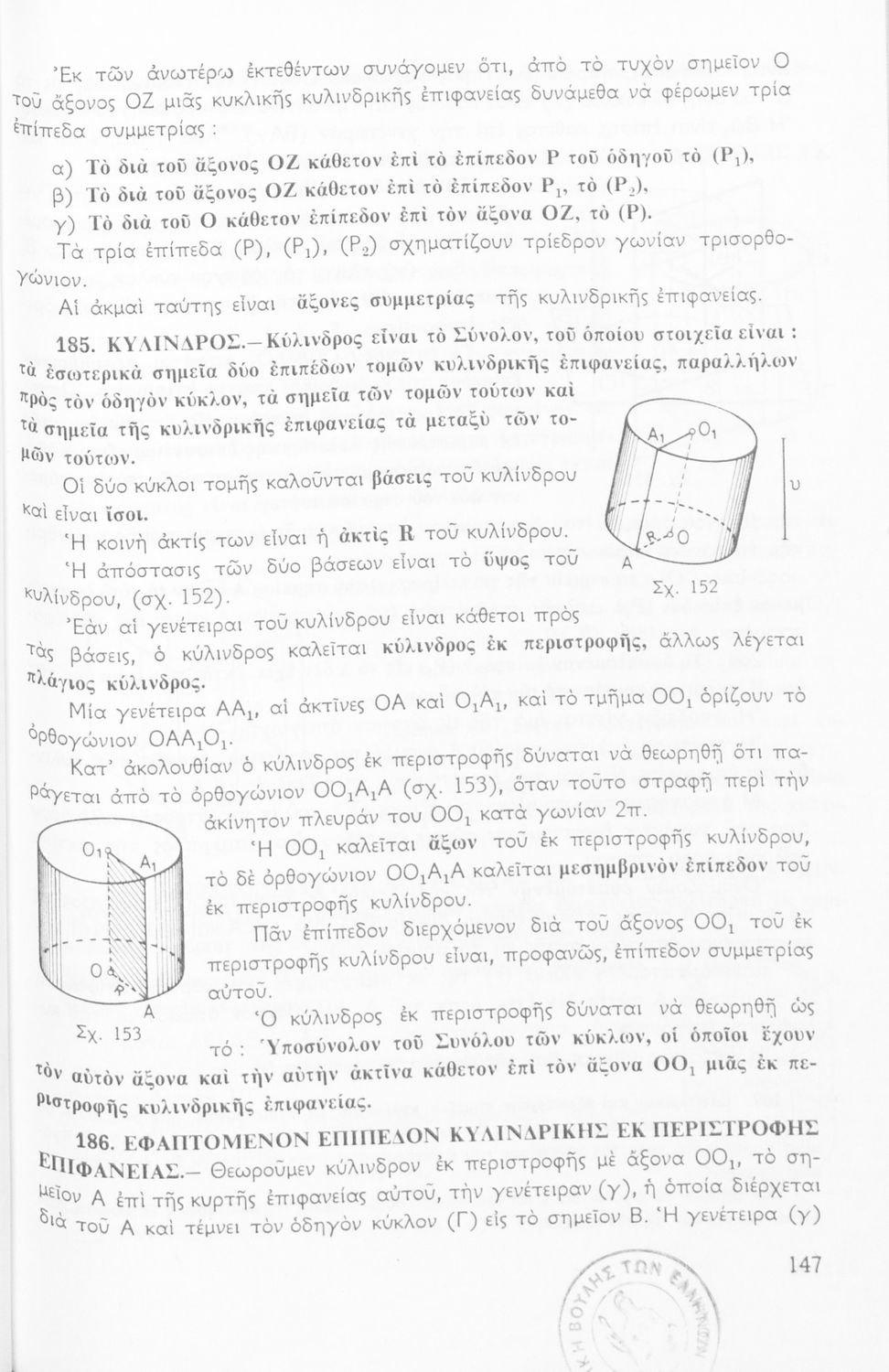 Σχολικό εγχειρίδιο Μαθηματικών Δ΄ και Ε΄ Γυμνασίου που είναι χωρισμένο σε θεωρήματα και ασκήσεις και εστιάζει στη Γεωμετρία. Φέρει το σύμβολο της δικτατορίας.