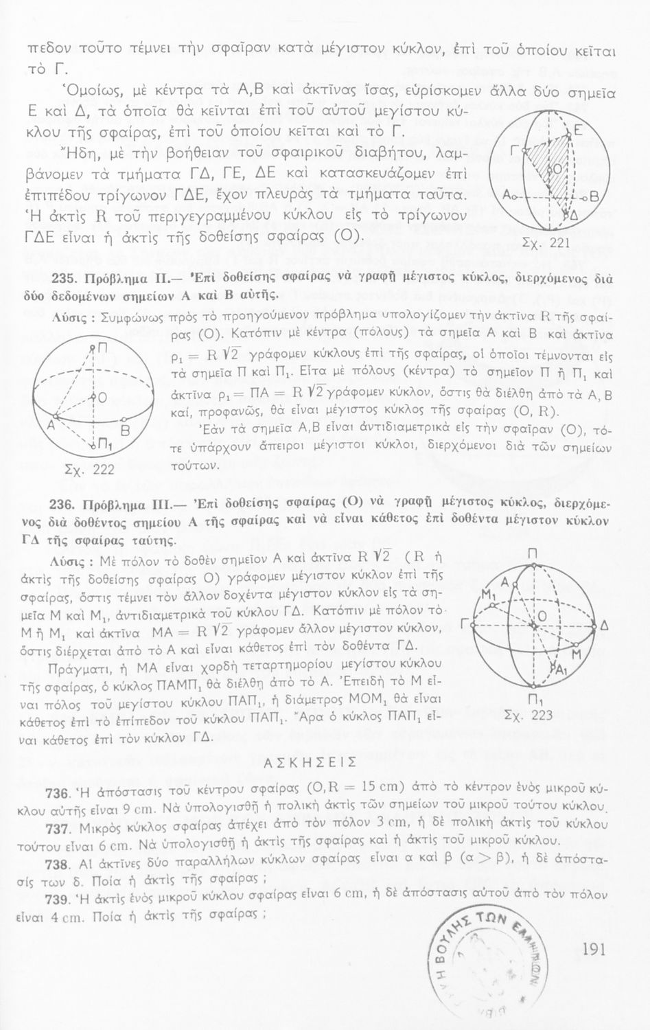 Σχολικό εγχειρίδιο Μαθηματικών Δ΄ και Ε΄ Γυμνασίου που είναι χωρισμένο σε θεωρήματα και ασκήσεις και εστιάζει στη Γεωμετρία. Φέρει το σύμβολο της δικτατορίας.