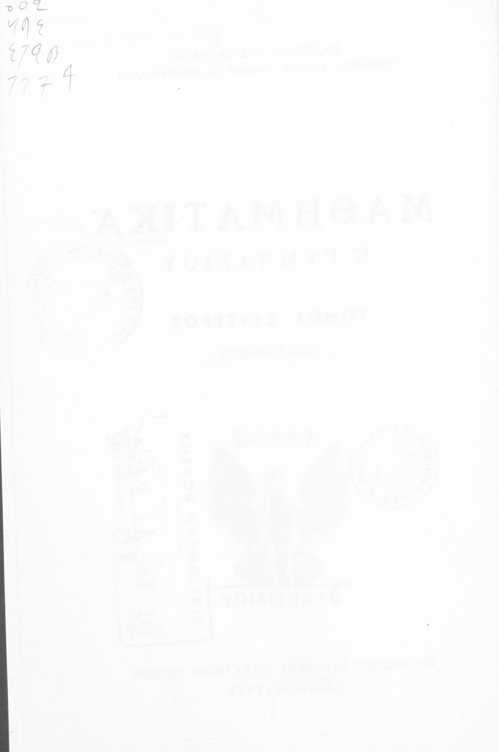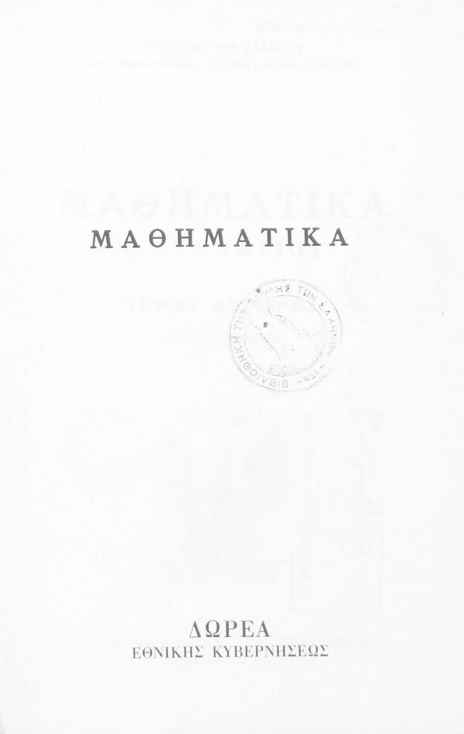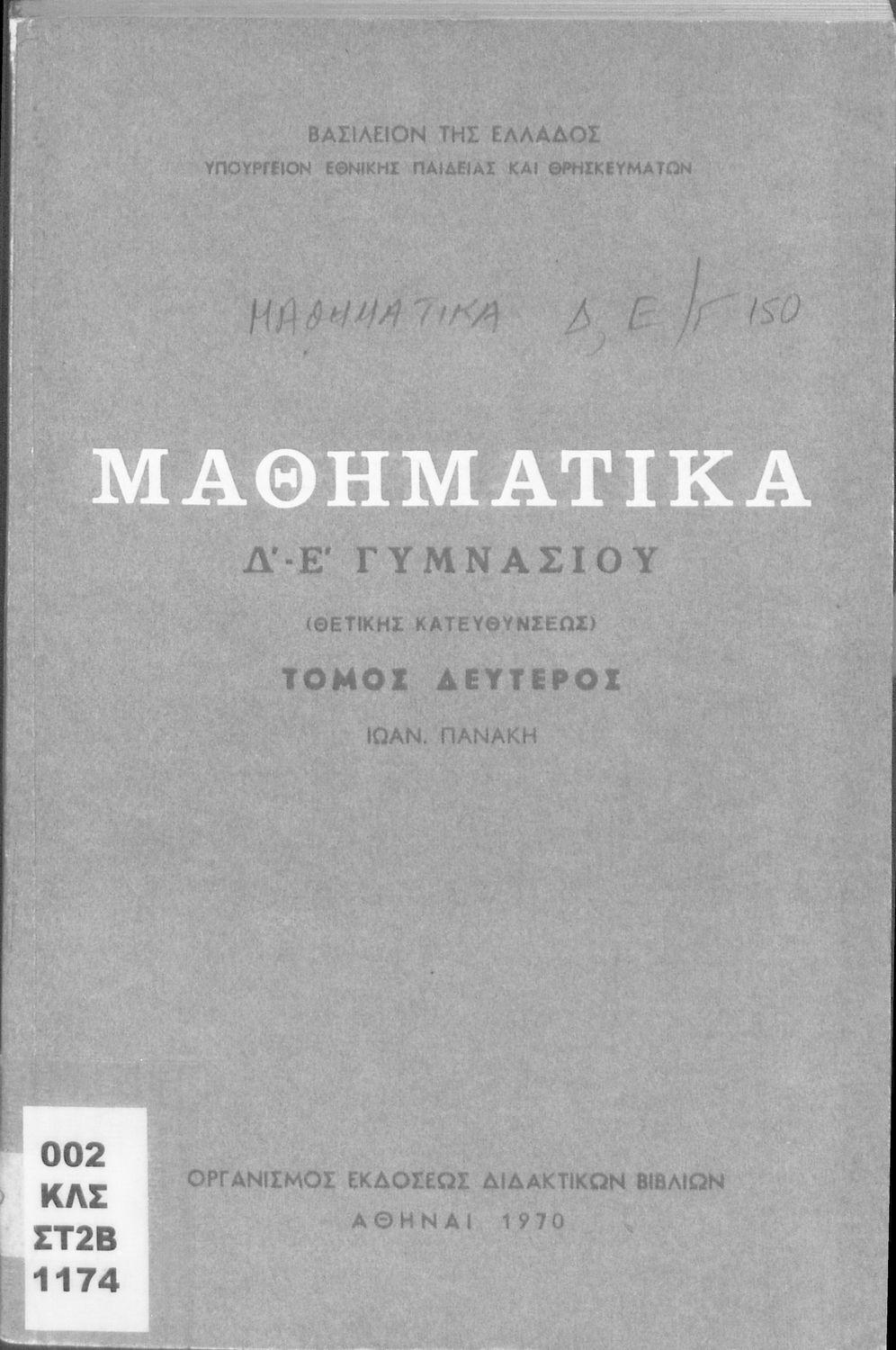 Σχολικό εγχειρίδιο Μαθηματικών Δ΄ και Ε΄ Γυμνασίου που είναι χωρισμένο σε θεωρήματα και ασκήσεις και εστιάζει στη Γεωμετρία. Φέρει το σύμβολο της δικτατορίας.