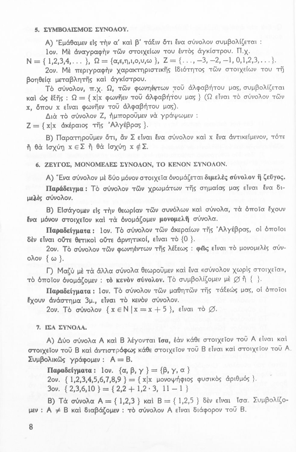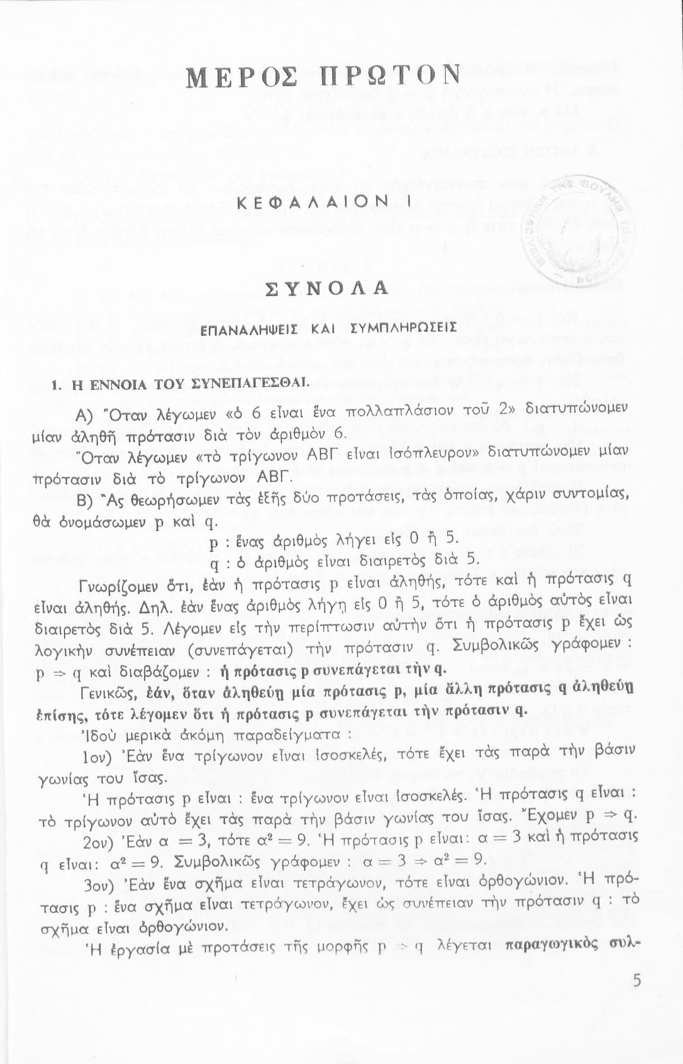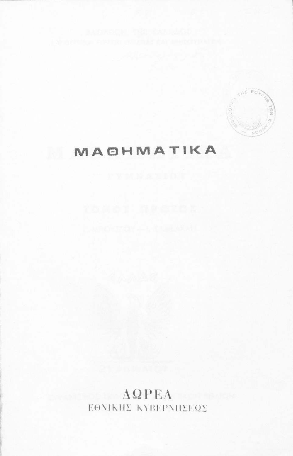 Σχολικό εγχειρίδιο Μαθηματικών Ε΄ Γυμνασίου χωρισμένο σε θεωρία και ασκήσεις. Φέρει το σύμβολο της δικτατορίας.
