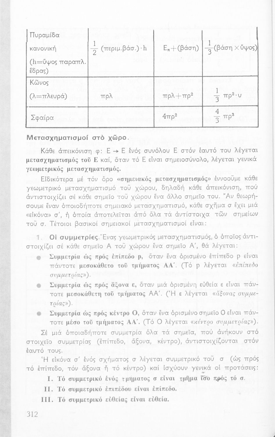 Σχολικό εγχειρίδιο Γεωμετρίας για τις Γ΄, Δ΄, Ε΄, ΣΤ΄ Γυμνασίου που περιλαμβάνει θεωρία και ασκήσεις και είναι χωρισμένο σε Επιπεδομετρία και Στερεομετρία. Φέρει το σύμβολο της δικτατορίας.