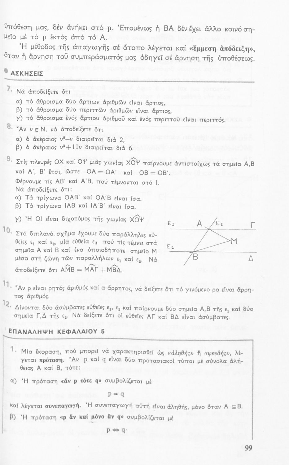 Σχολικό εγχειρίδιο Μαθηματικών για την Ε΄ Γυμνασίου, χωρισμένο σε προβλήματα, εφαρμογές και ασκήσεις, που εστιάζει στην Τριγωνομετρία. Φέρει το σύμβολο της δικτατορίας.