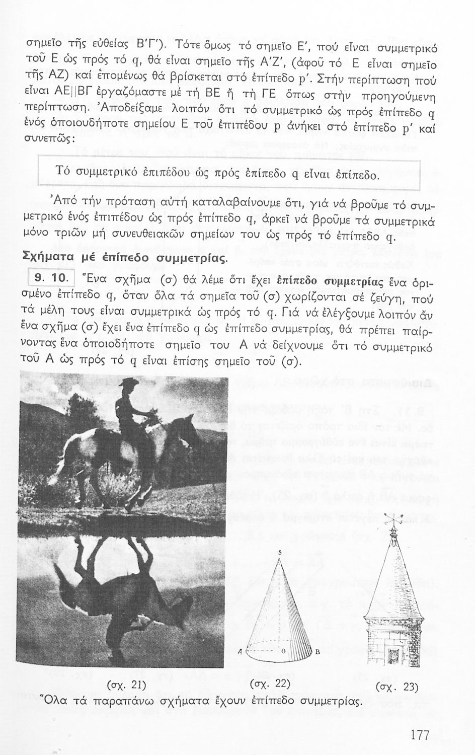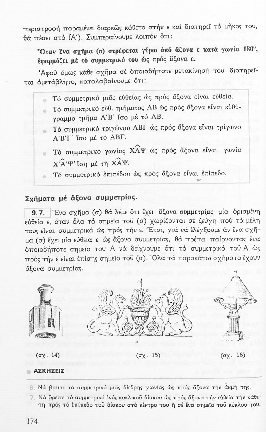 Σχολικό εγχειρίδιο Γεωμετρίας για τις Γ΄, Δ΄, Ε΄, ΣΤ΄ Γυμνασίου που περιλαμβάνει θεωρία και ασκήσεις και είναι χωρισμένο σε Επιπεδομετρία και Στερεομετρία. Φέρει το σύμβολο της δικτατορίας.