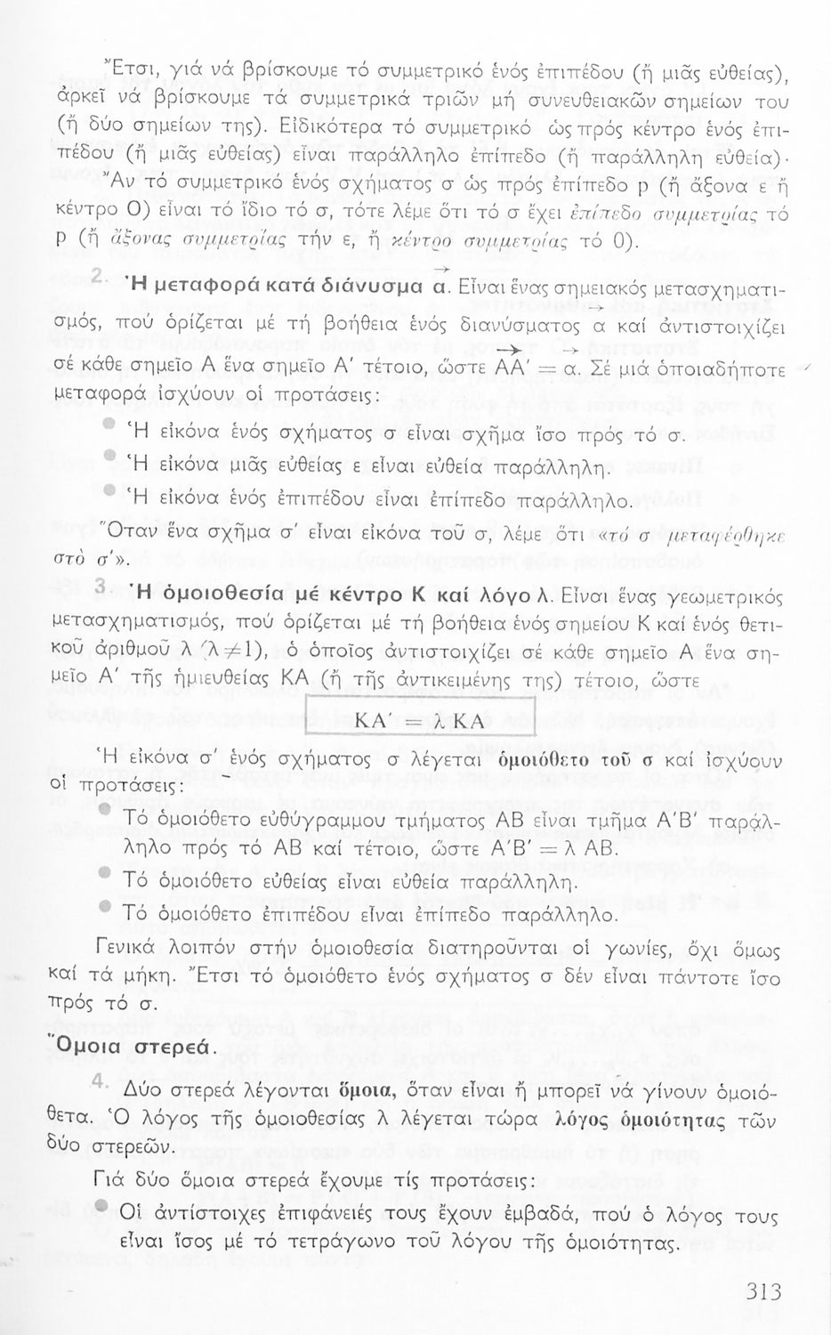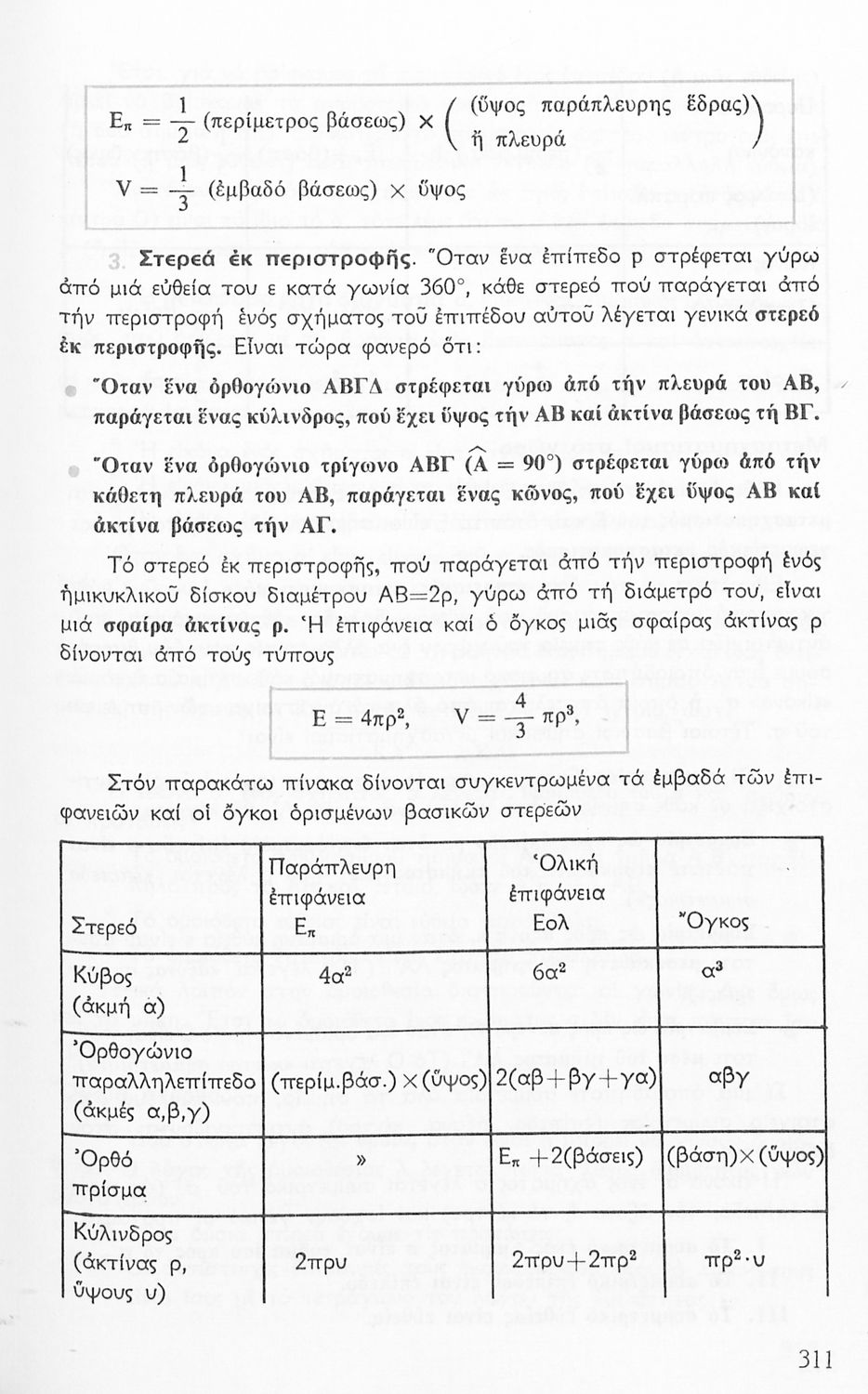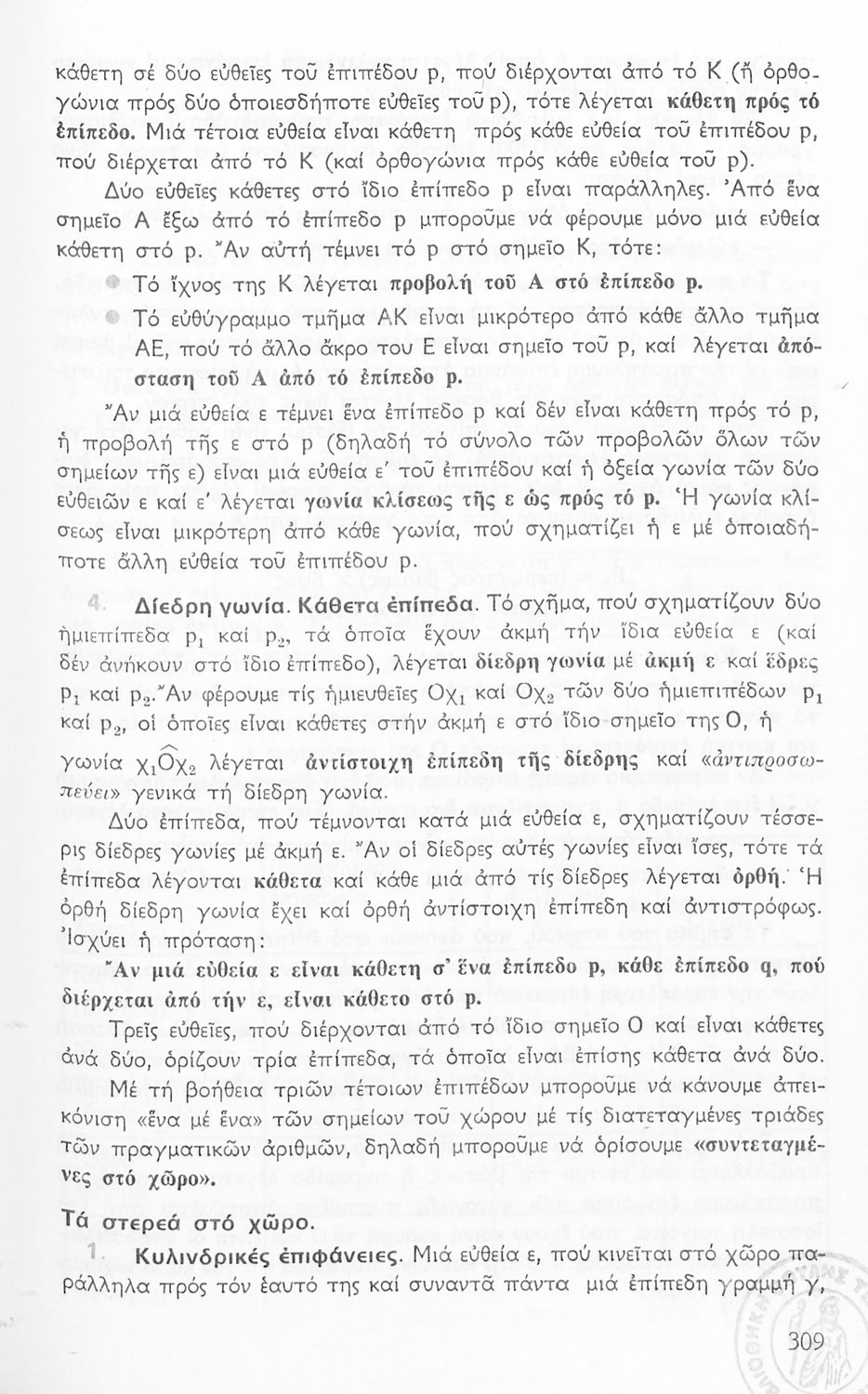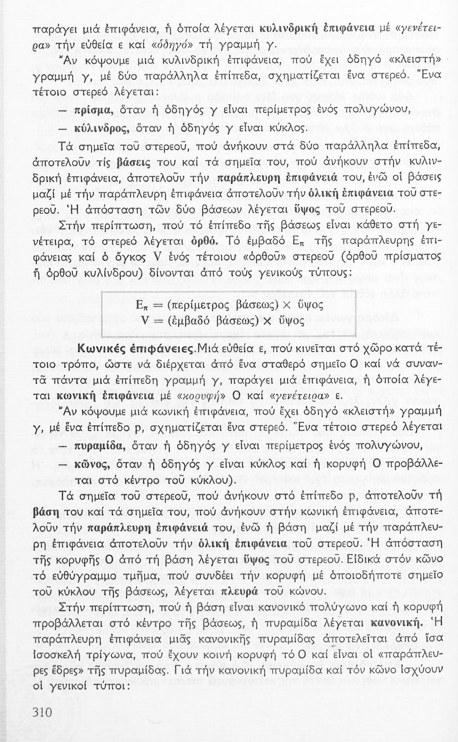 Σχολικό εγχειρίδιο Γεωμετρίας για τις Γ΄, Δ΄, Ε΄, ΣΤ΄ Γυμνασίου που περιλαμβάνει θεωρία και ασκήσεις και είναι χωρισμένο σε Επιπεδομετρία και Στερεομετρία.