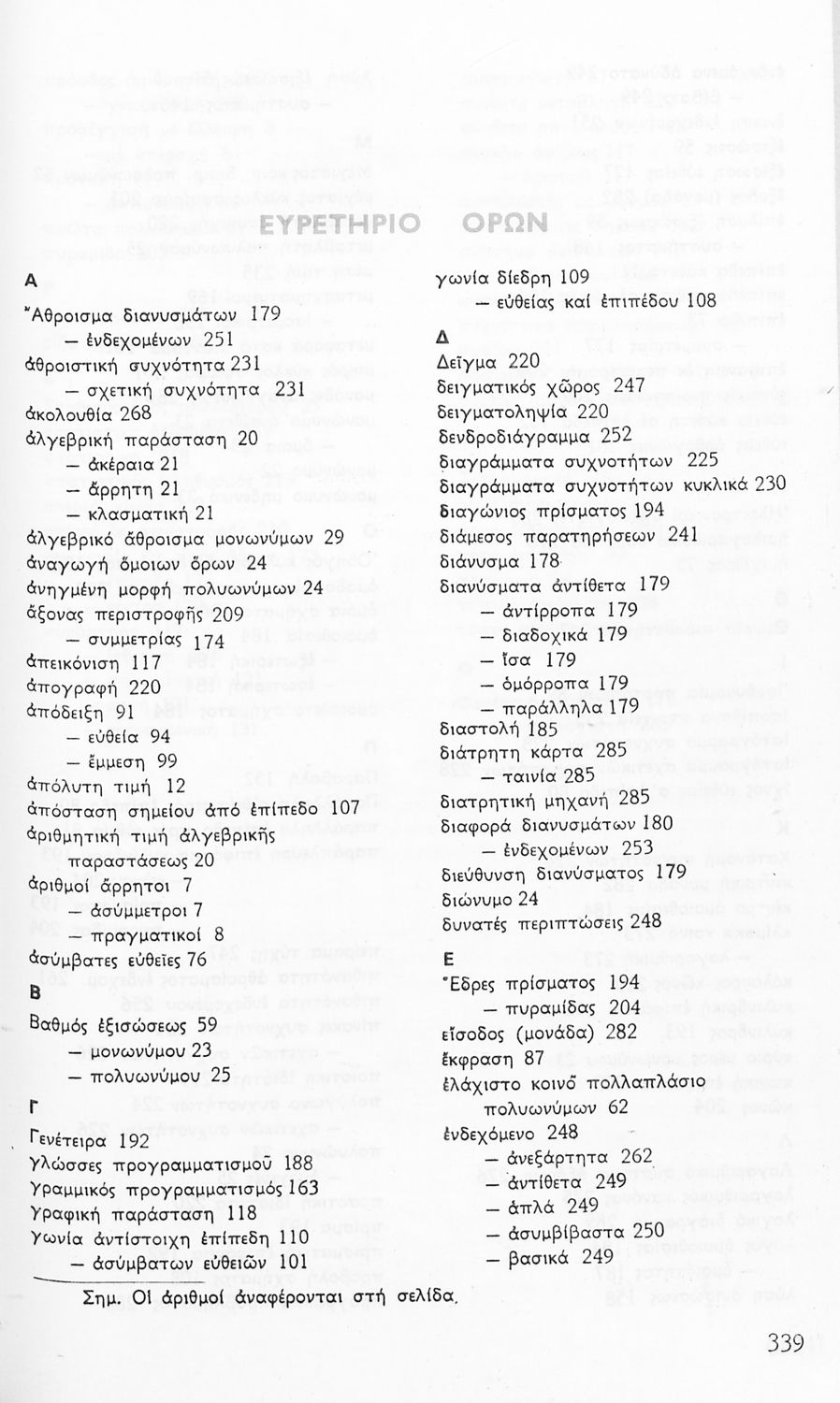 Σχολικό εγχειρίδιο Γεωμετρίας για τις Γ΄, Δ΄, Ε΄, ΣΤ΄ Γυμνασίου που περιλαμβάνει θεωρία και ασκήσεις και είναι χωρισμένο σε Επιπεδομετρία και Στερεομετρία. Φέρει το σύμβολο της δικτατορίας.
