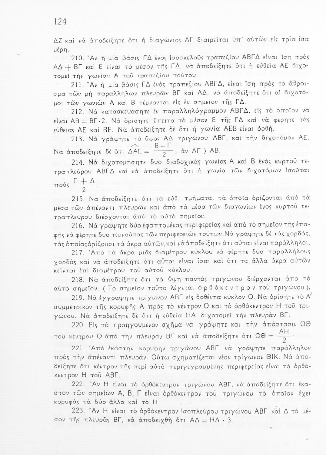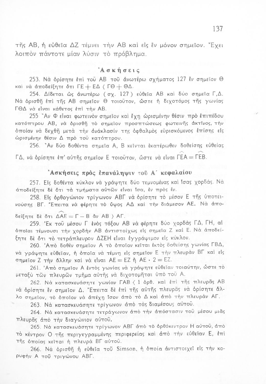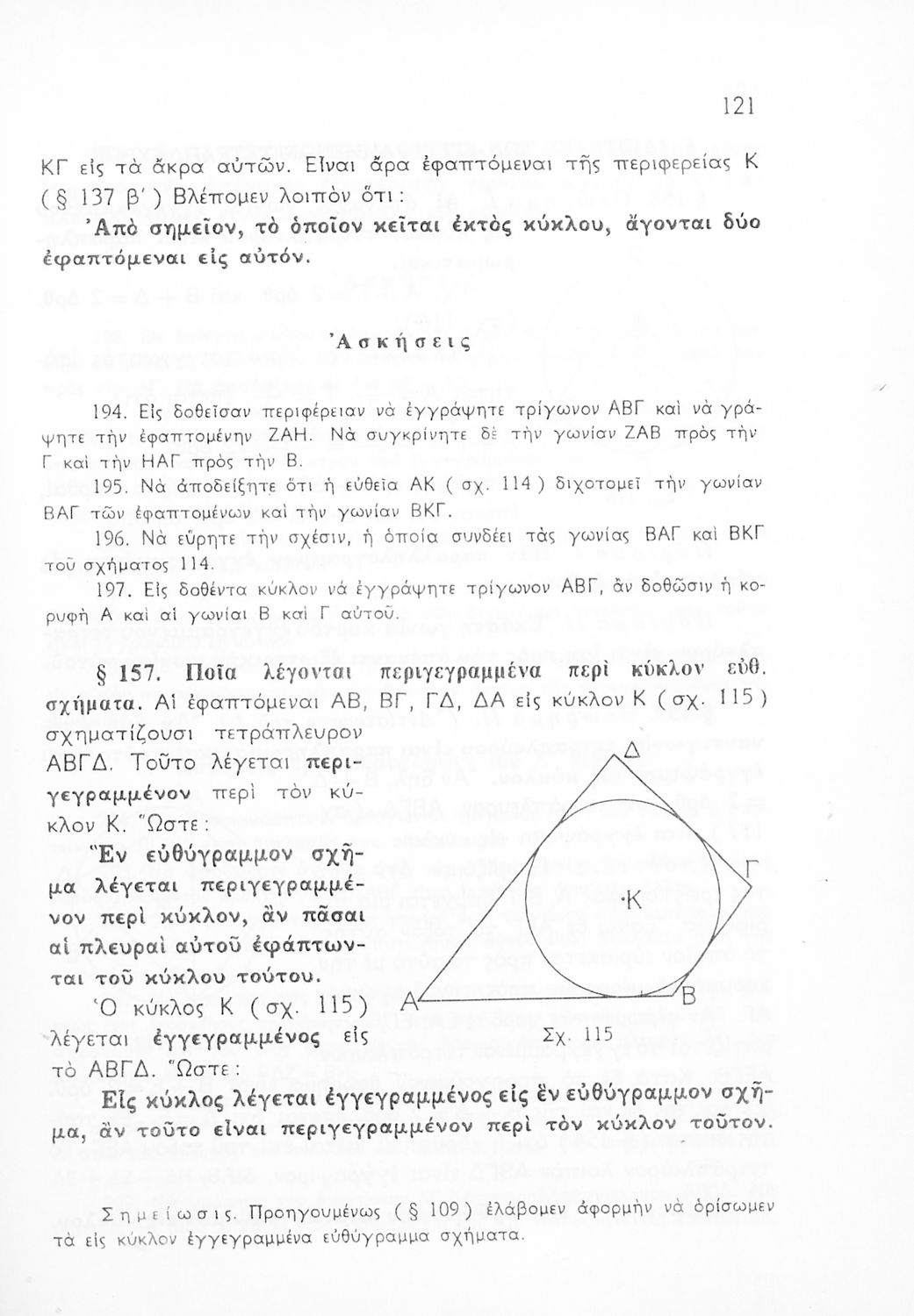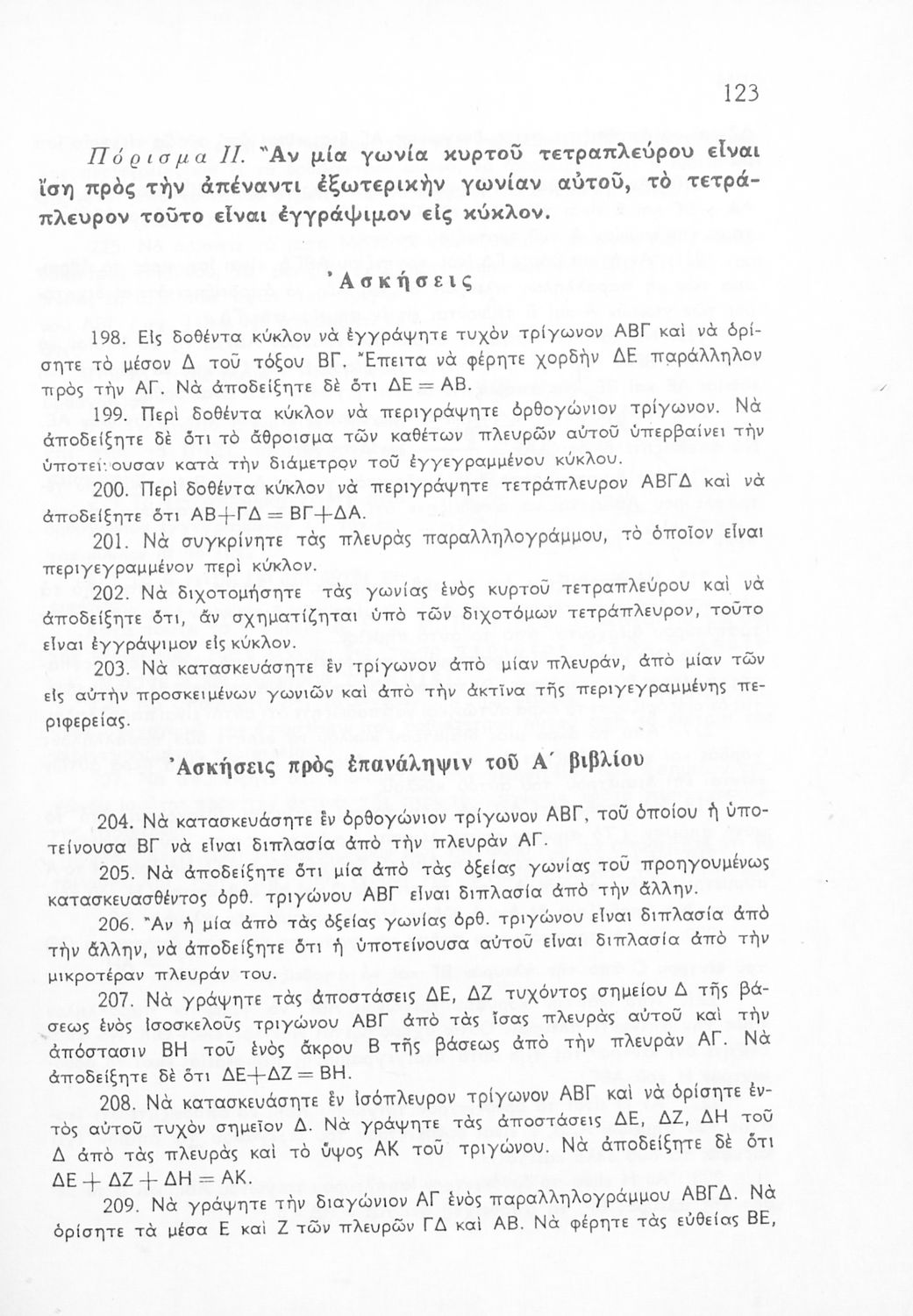 Σχολικό εγχειρίδιο Γεωμετρίας για τις Γ΄, Δ΄, Ε΄, ΣΤ΄ Γυμνασίου που εστιάζει στα βασικά θεωρήματα και ιδιότητες των γεωμετρικών σχημάτων. Φέρει το σύμβολο της δικτατορίας.